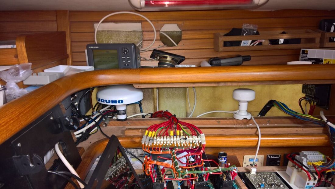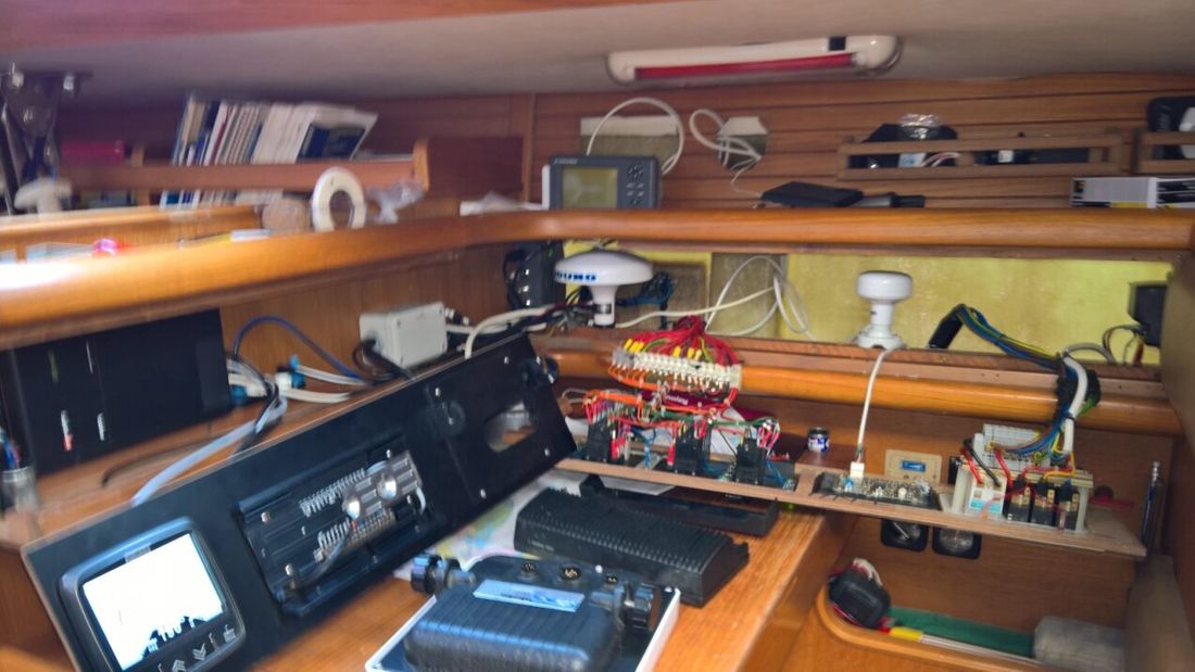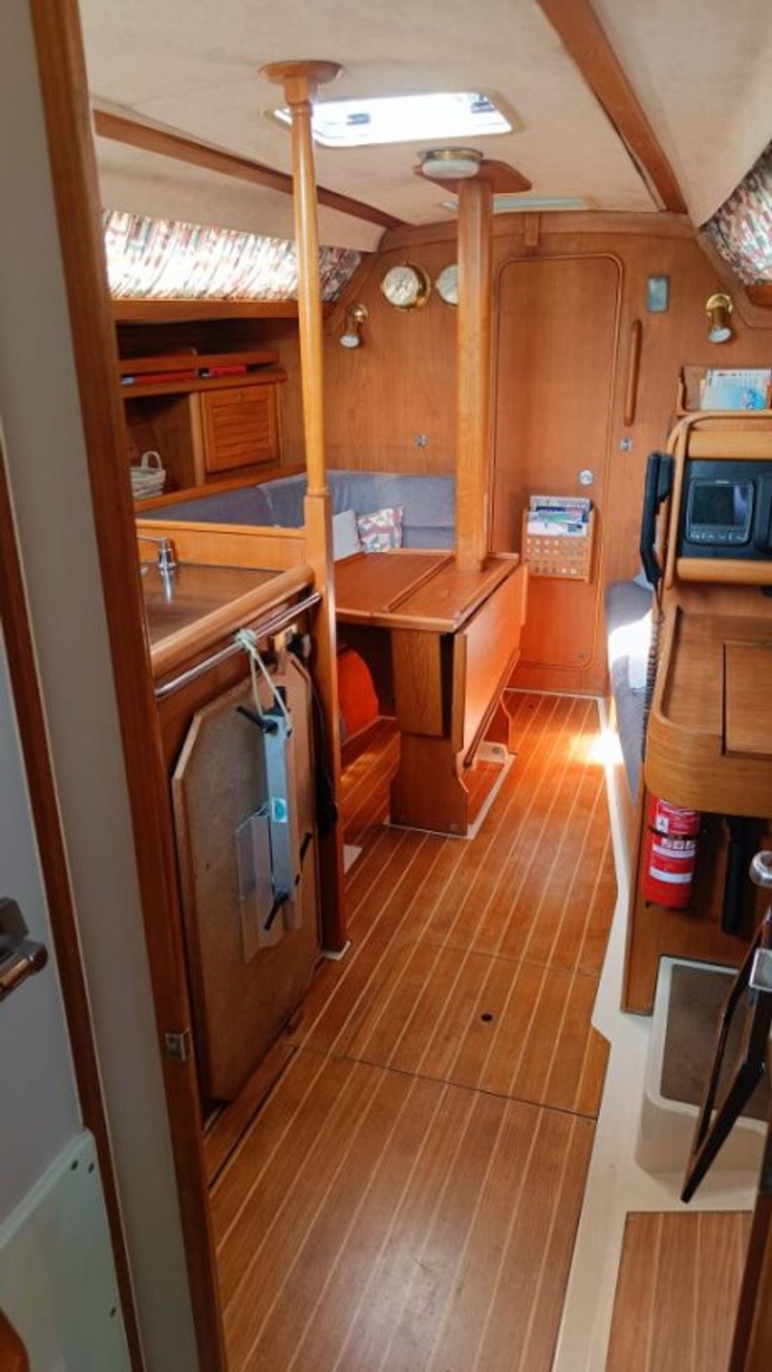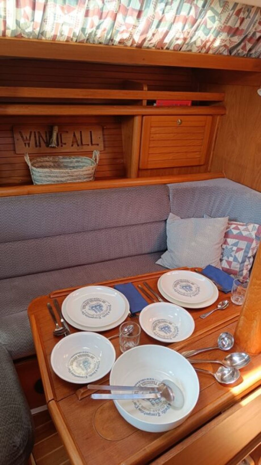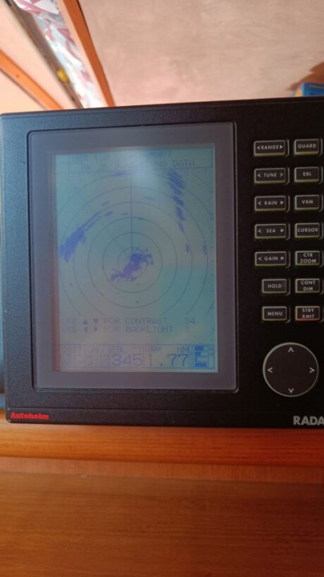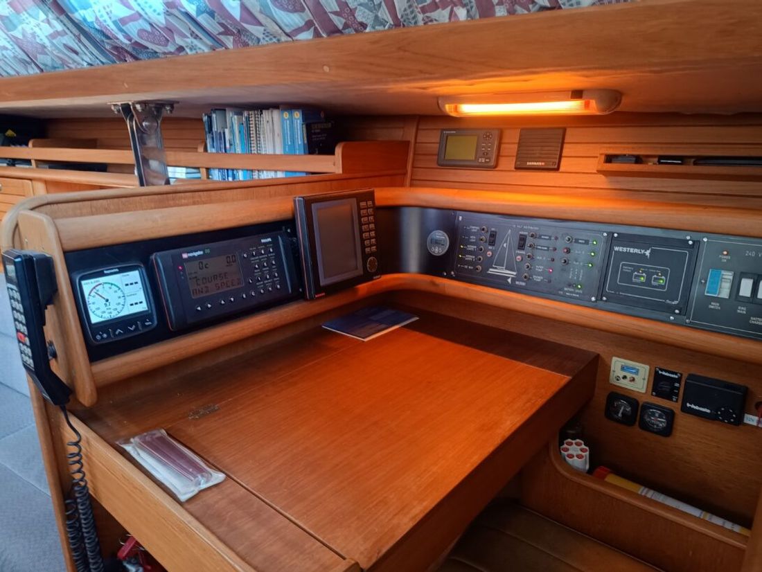 sink, sea charts, AIS - Autom. Identif. System, toilet manual, aft cabin, bow cabin, salon, head, steering position outside, steering position on quarterdeck, radar reflector, life jackets, boom aluminium, shore supply 220V, radio, anchor chain, second anchor, winter cover, sun shade / aftdeck, pressurized water system, warm water system, guard rail, bathing ladder, underwater paint, engine battery, hob gas, anchor windlass bow, bathing platform, cushion cover textile, stern shower
