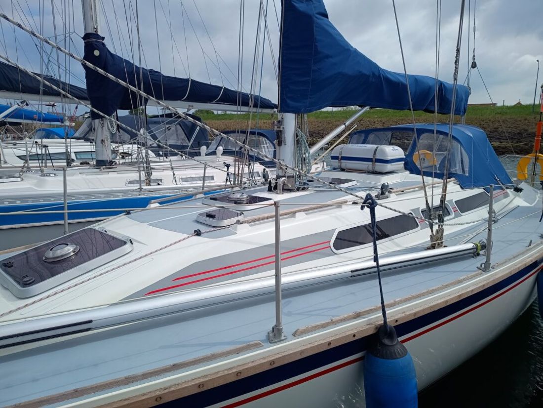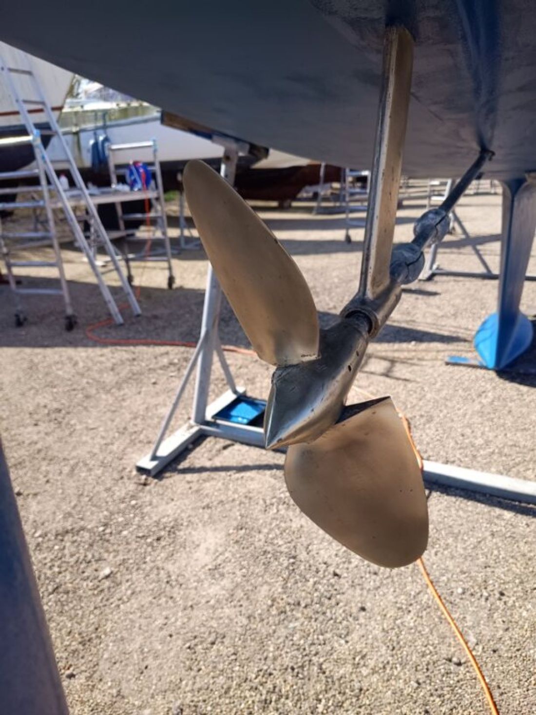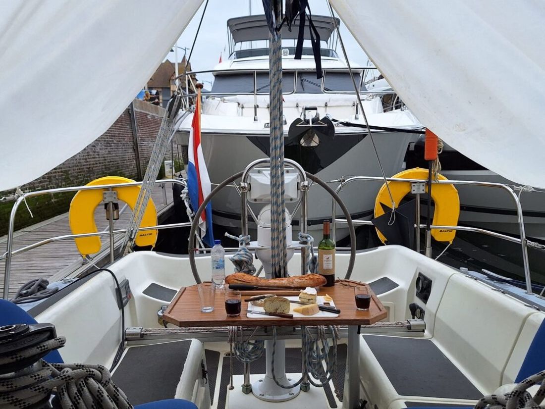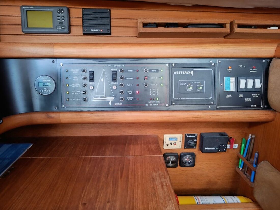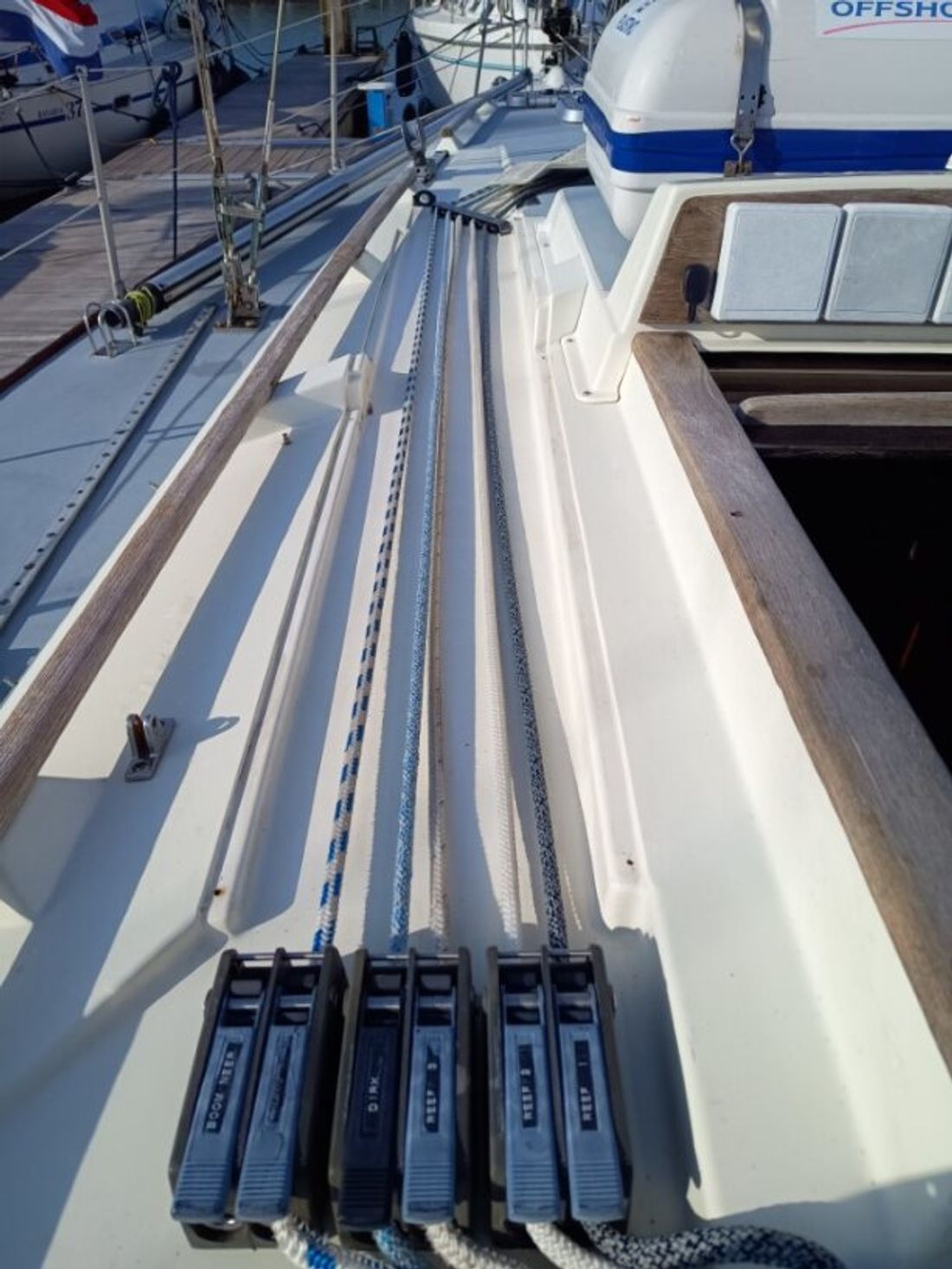 sink, sea charts, AIS - Autom. Identif. System, toilet manual, aft cabin, bow cabin, salon, head, steering position outside, steering position on quarterdeck, radar reflector, life jackets, boom aluminium, shore supply 220V, radio, anchor chain, second anchor, winter cover, sun shade / aftdeck, pressurized water system, warm water system, guard rail, bathing ladder, underwater paint, engine battery, hob gas, anchor windlass bow, bathing platform, cushion cover textile, stern shower
