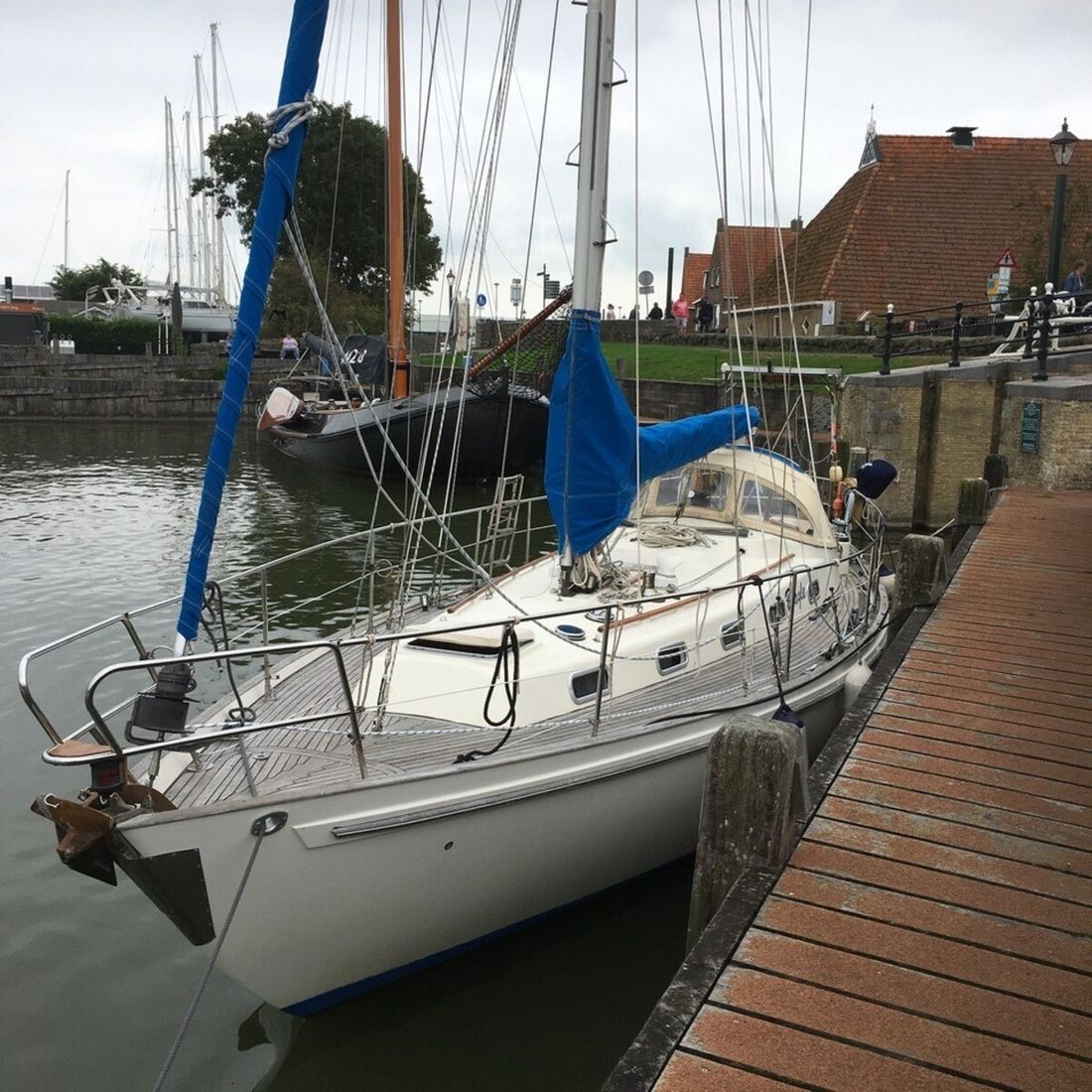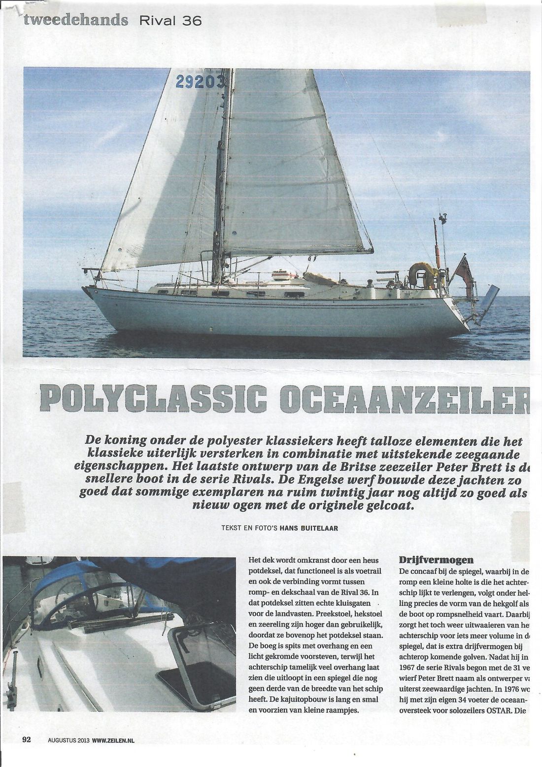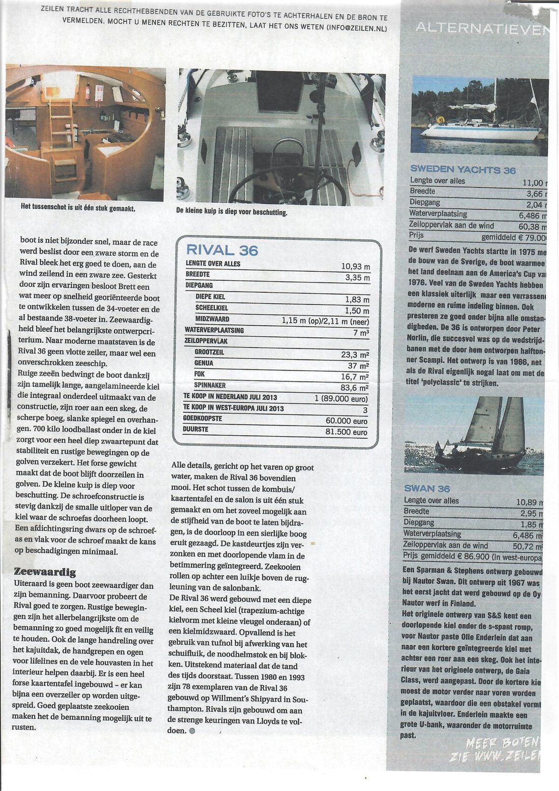 Delivered new Designer Peter Brett Shipyard Rival Bowman. Southampton Hull number 68 Hull deck superstructure Hull shape semi s-shaped Hull colour white Deck colour white Deck construction grp (polyester) Cockpit aft cockpit Superstructure teakdek, grp gelcoat off white non-slip finish Windows Lewmar Dimensions and weights Waterline length 850 cm Displacement 7010 kg Ballast 2531 kg Steering and Drift Limitation Steering system helm Comments Steering system steering position available Rudder single Comments Rudder rudder on skeg Keel/Lee board fixed keel Comments Keel/Lee board Scheel keel, semi S frame -