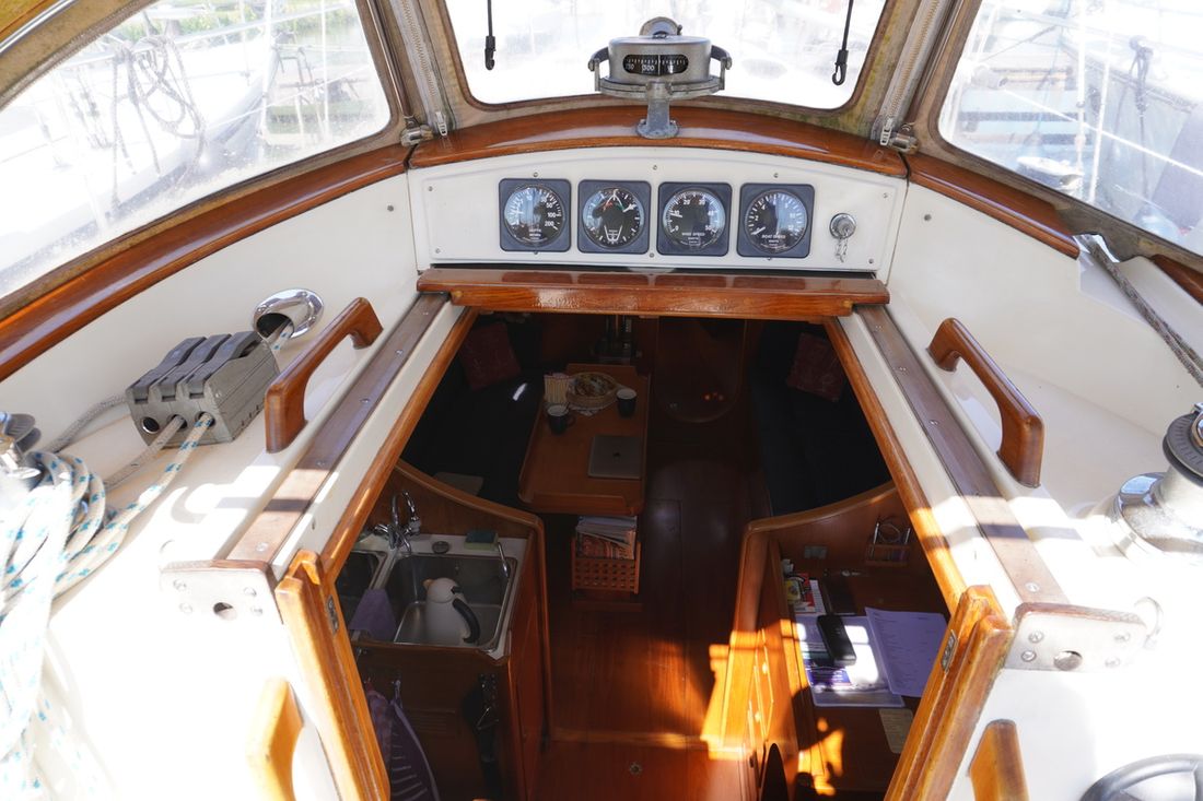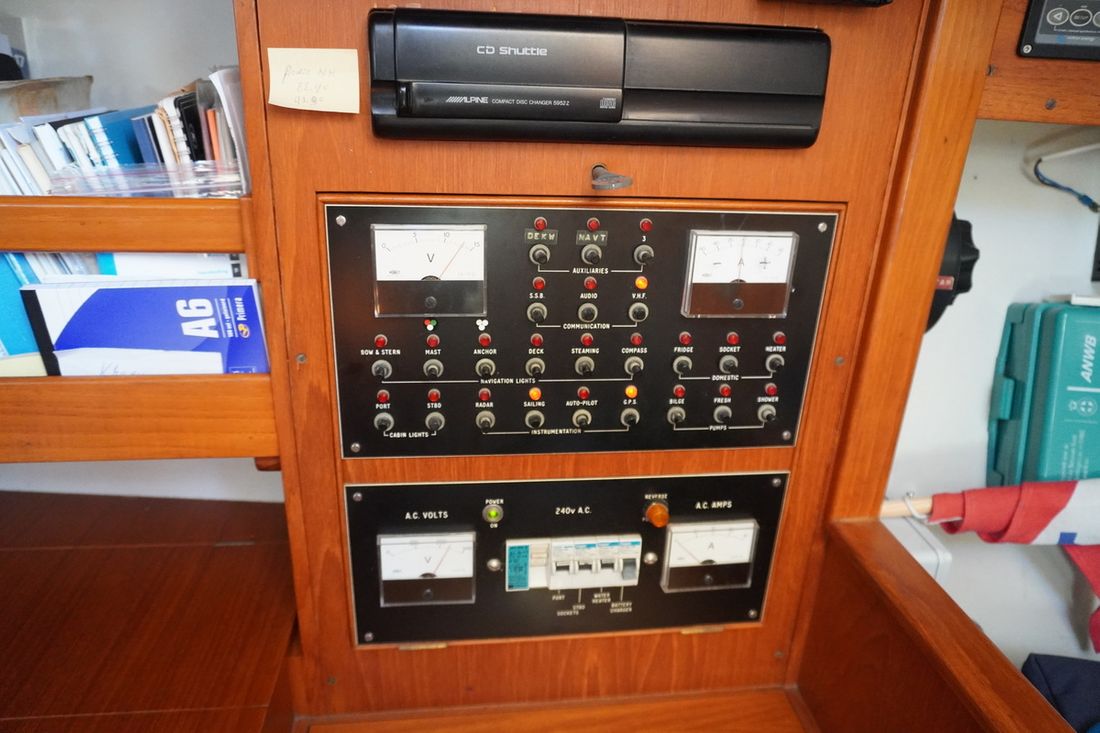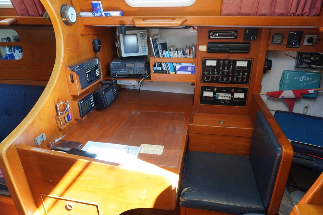 Basic tools Compass Brand kompas Plastimo Contest, Sestrel Moore Log/speed Brand log/speed B&G Hydra 2 Depth gauge Brand depth gauge B&G Hydra 2 Wind gauge Brand wind gauge B&G Hydra 2 Navigation lights Brand Navigation lights Aqua Signal Windvane steering Comments Windvane steering Aries, demountable Modern electronics Autopilot Brand autopilot B&G Hydrolic RAM GPS Brand GPS AP MK9 Communication SSB receiver Brand SSB receiver Kenwood TKM 707 VHF Brand VHF Icom M422 Weatherfax/Navtex Brand Weatherfax/Navtex ICS Nav4 -