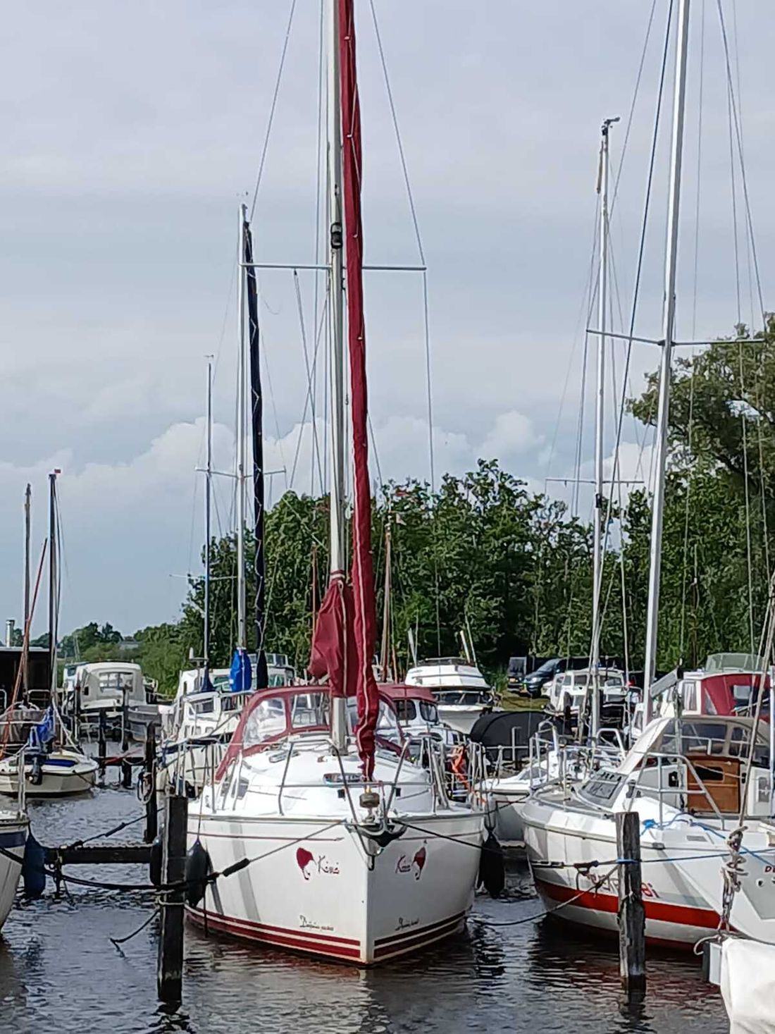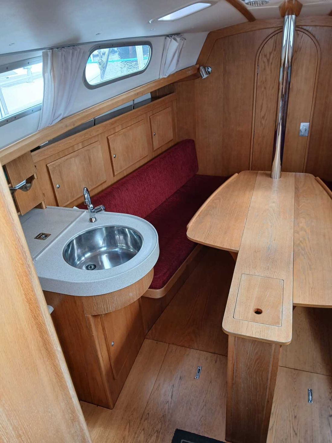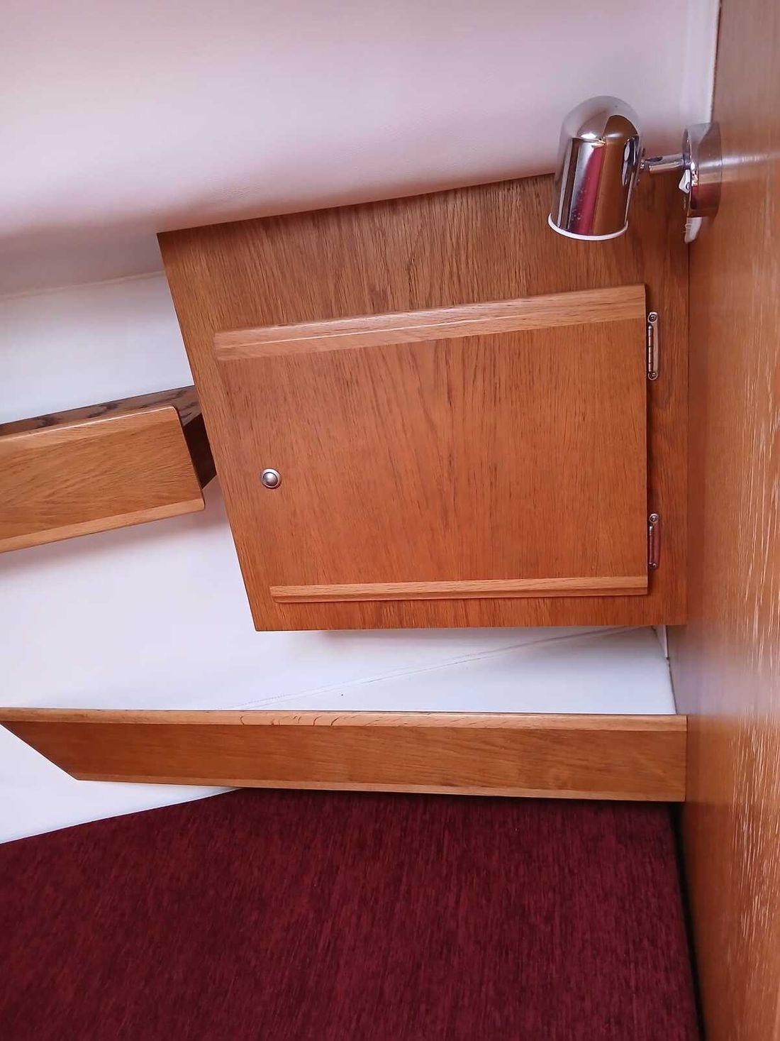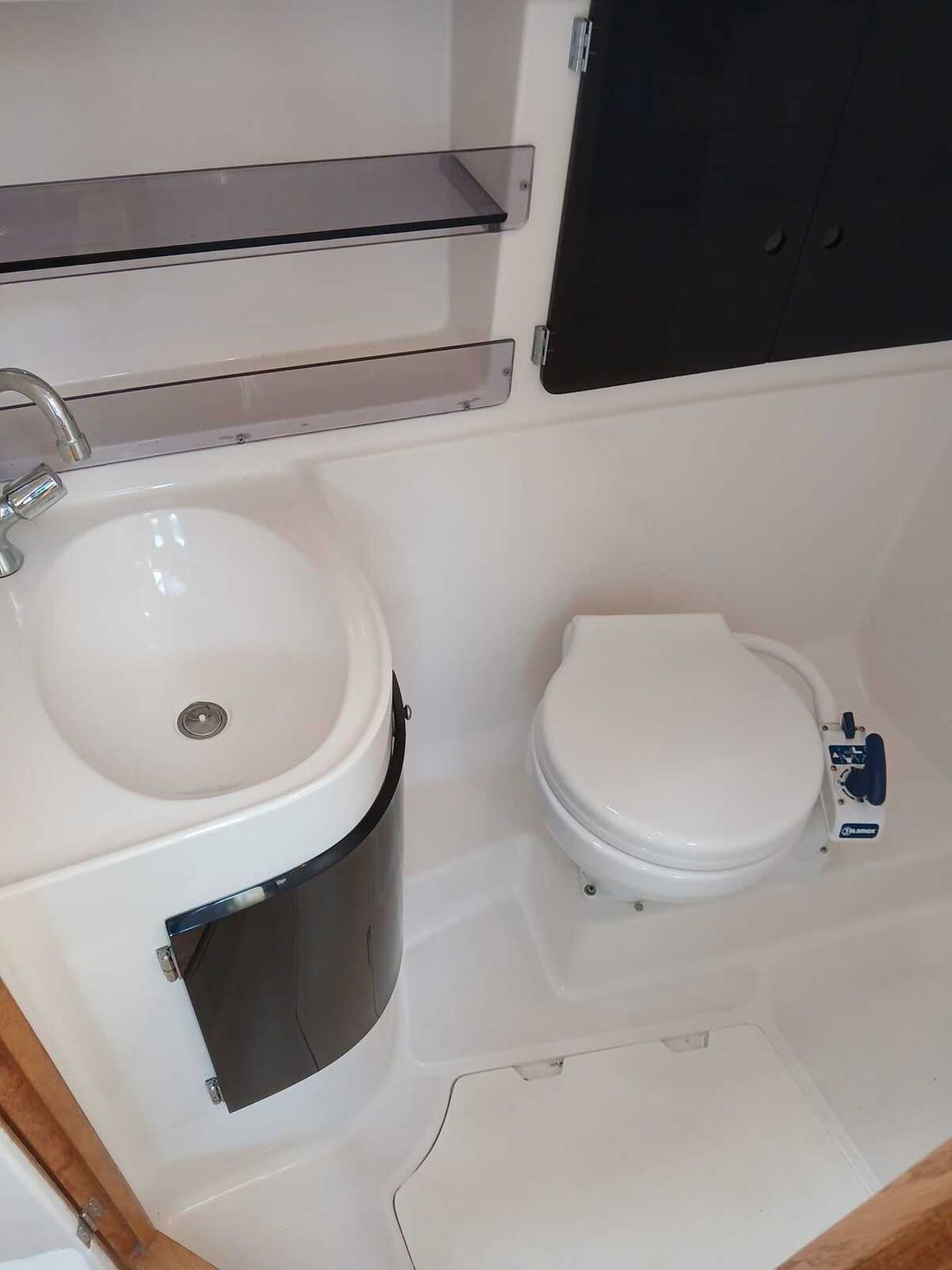 In addition, there is ample storage space for cooking utensils and supplies, making cooking while sailing easy. A hot air stove provides extra comfort, especially during cooler days on the water. The forward cabin is equipped with a V-shaped bed, which offers sufficient space and comfort. In addition, there is practical storage space for clothing and personal belongings. The aft cabin has a double bed. Here too, there is sufficient extra storage space, so that the cabins can remain neat and tidy. The bathroom is efficiently laid out with a Jabsco pump toilet and a sink, which offers everything you need for comfort on board.