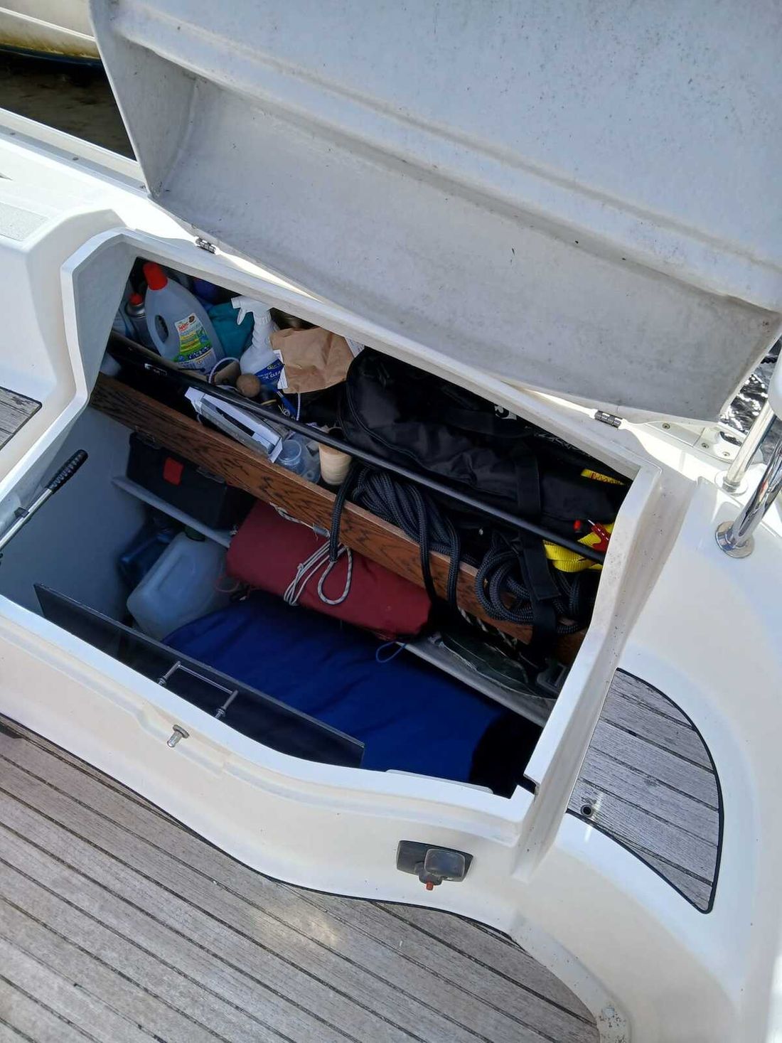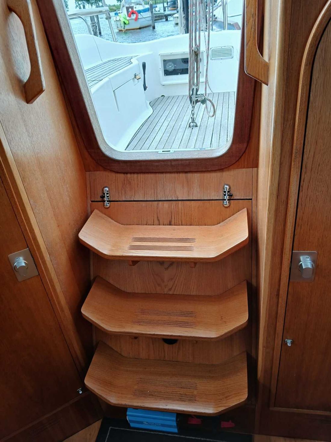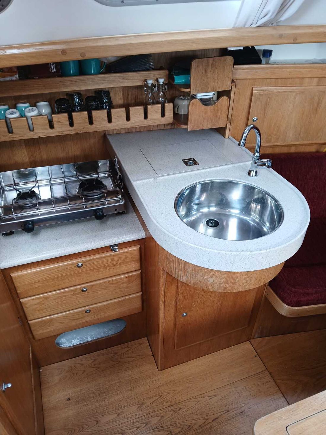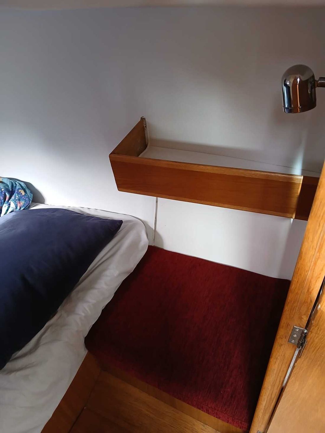 In addition, there is ample storage space for cooking utensils and supplies, making cooking while sailing easy. A hot air stove provides extra comfort, especially during cooler days on the water. The forward cabin is equipped with a V-shaped bed, which offers sufficient space and comfort. In addition, there is practical storage space for clothing and personal belongings. The aft cabin has a double bed. Here too, there is sufficient extra storage space, so that the cabins can remain neat and tidy. The bathroom is efficiently laid out with a Jabsco pump toilet and a sink, which offers everything you need for comfort on board.