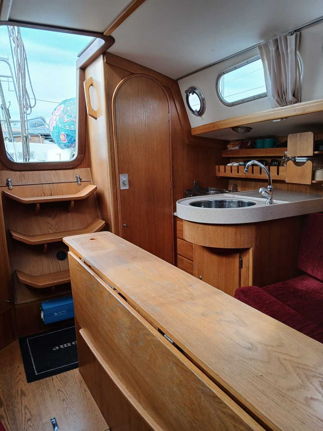 Upon entering, you are welcomed by a cozy salon with comfortable cushions. The salon is furnished with two comfortable, rectangular sofas on either side. The central folding table offers ample space for meals and can easily be folded away to create more walking space. The side windows allow plenty of daylight on board. The galley on the port side is fully equipped with a two-burner gas stove, a spacious refrigerator and a sink with running water.