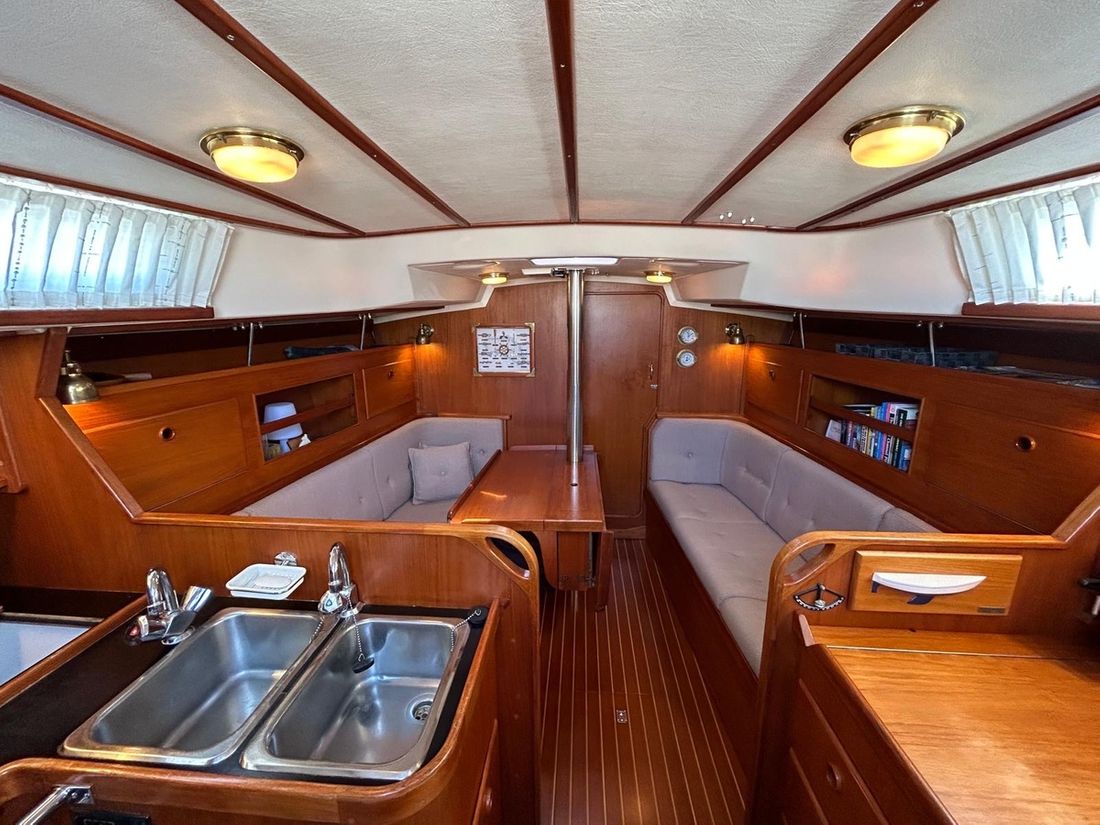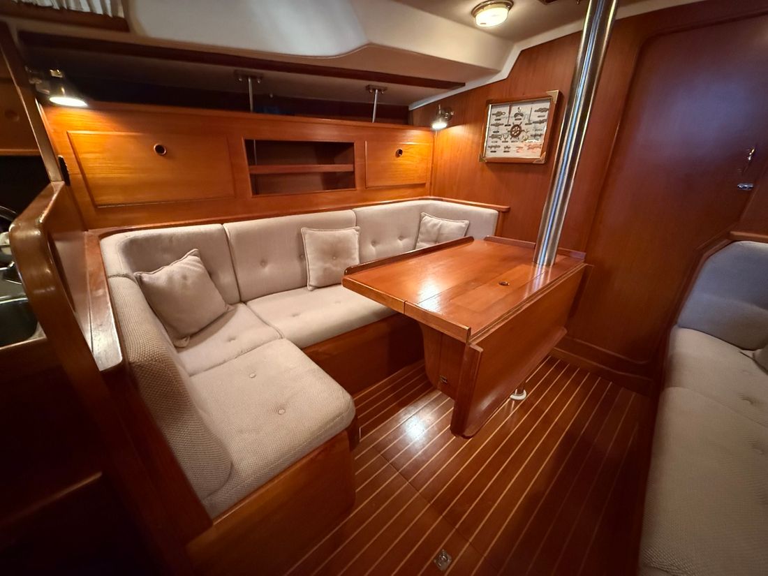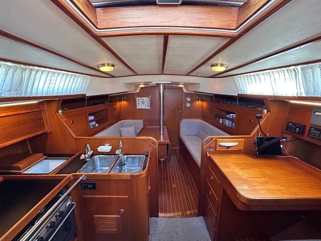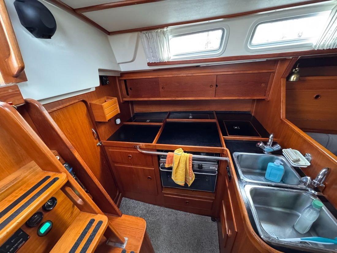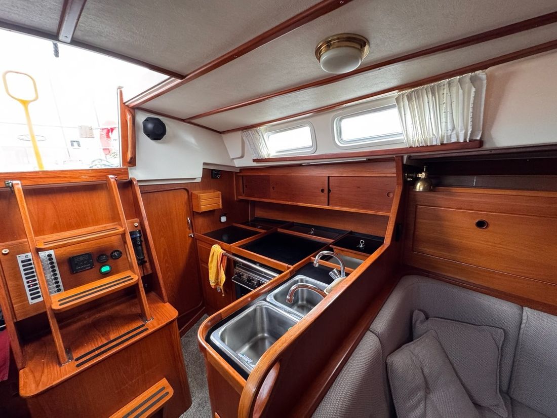 Spaces Saloon Cabins 1 Saloon Decoration Type interior Classic, warm Color upholstery beige Mattresses Cushions Curtains Water Water tank & material Water tank material stainless steel Water system pressure + manual Hot water Deck Shower Plumbing Number of showers 1 Toilets 1 Manual Entertainment Radio/CD player Kitchen Cooker & fuel Number 4 Cooking fuel gas Oven Fridge & power source Power source electric Climate control hot air -