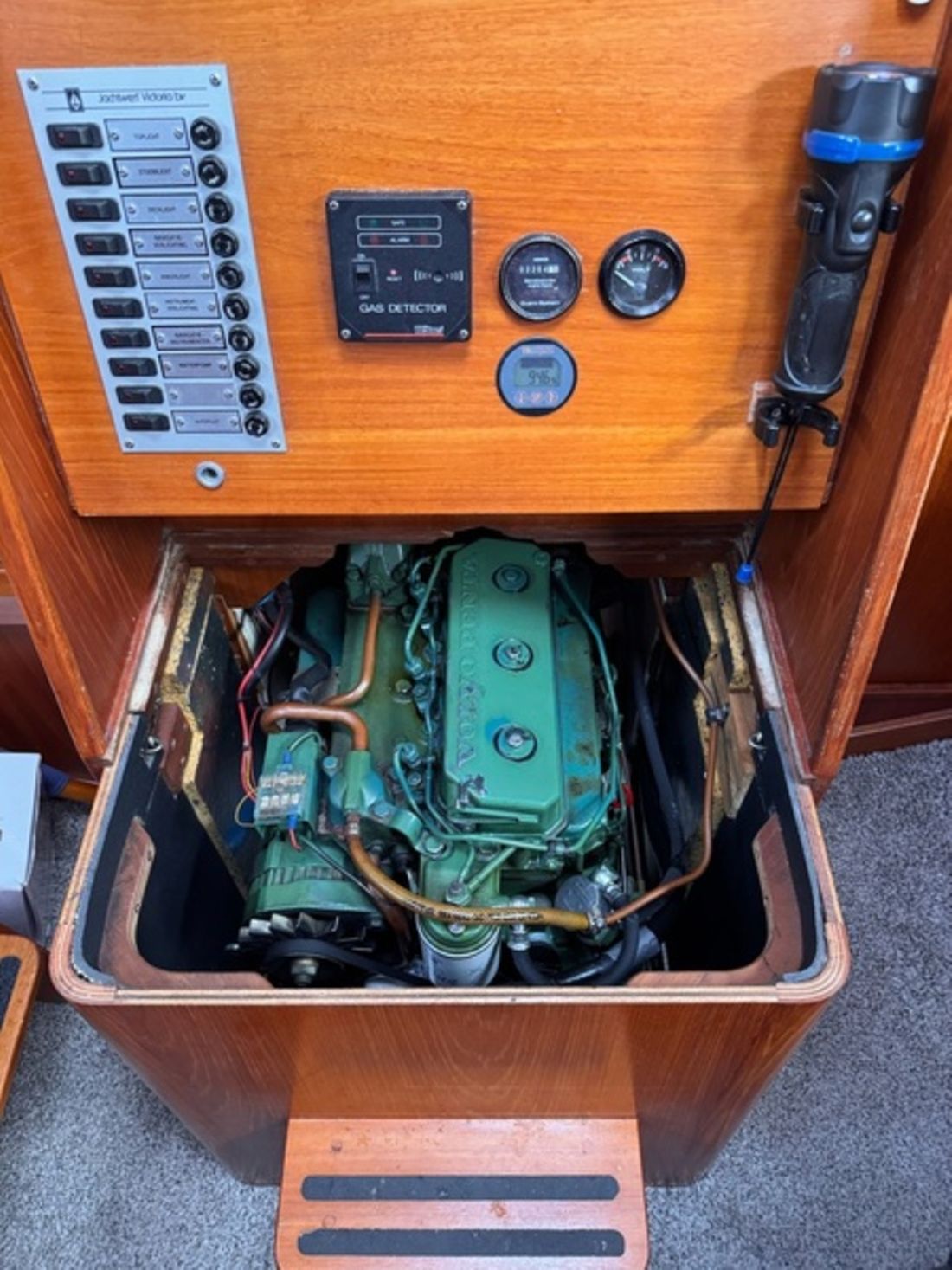 Engines Number of identical engines 1 Starting type electric Main engine Type inboard Brand Volvo Penta Model 2003 Year 1992 Number of cylinders 3 Power 28 hp Hours counter Engine hours 3400 Fuel diesel Fuel consumption 2 litre/hour Brand gearbox Volvo Penta Drive Transmission saildrive Propulsion propellor Cooling system indirect Tank Fuel tanks Number 1 Total fuel tank(s) capacity 80 litre Fuel tank material stainless steel Performance Max speed 12 km/h Cruising speed 10 km/h Electricity Battery Battery charger Alternator Battery monitor Shore power Shore power cable Solar panel Capacity 400 12V 220V -