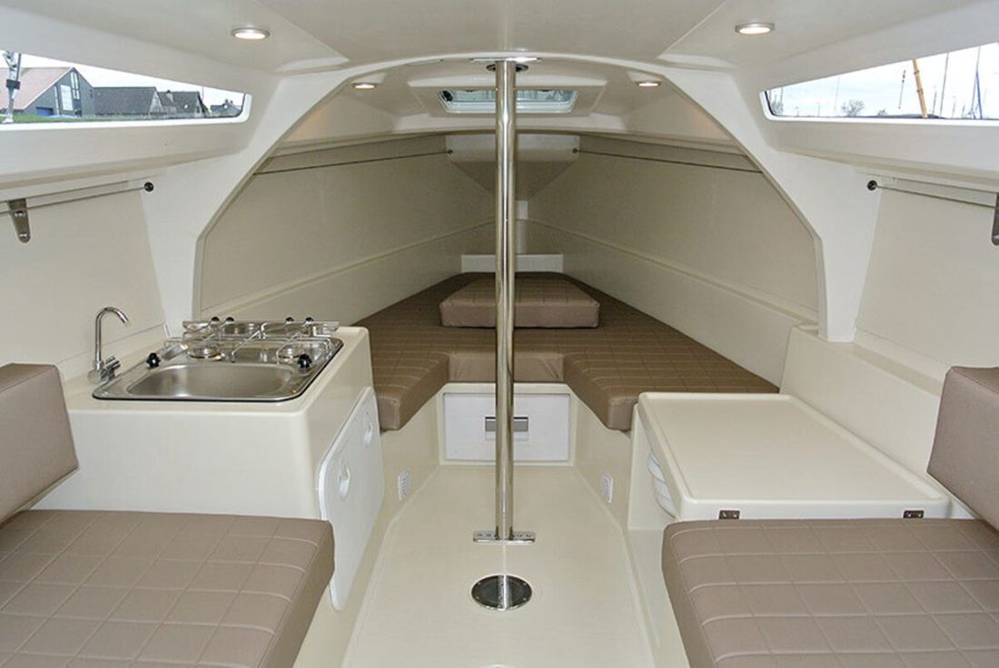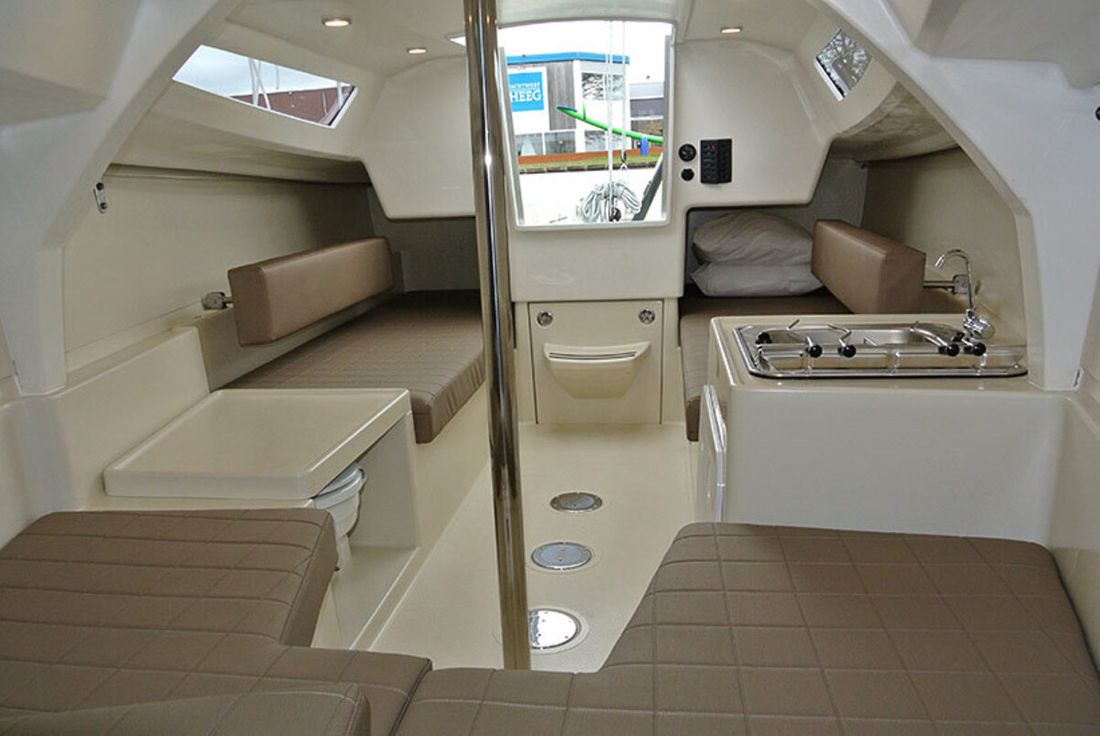 Spaces Saloon Comments Saloon Sleek design and finished with craftsmanship. Cabins 1 Saloon Layout and spaces inside Two berths in the front of the boat and two berths in the back under the cockpit seat. Decoration Type interior Modern, light Color upholstery brown Mattresses Cushions Curtains Comments Curtains Window shutters for windows and blinds for escape hatches Water Capacity 50 litre Waste water tank Water system pressure Plumbing Toilets 1 Manual Kitchen Cooker & fuel Number 2 Cooking fuel gas Fridge & power source Capacity 30 litre Power source electric -