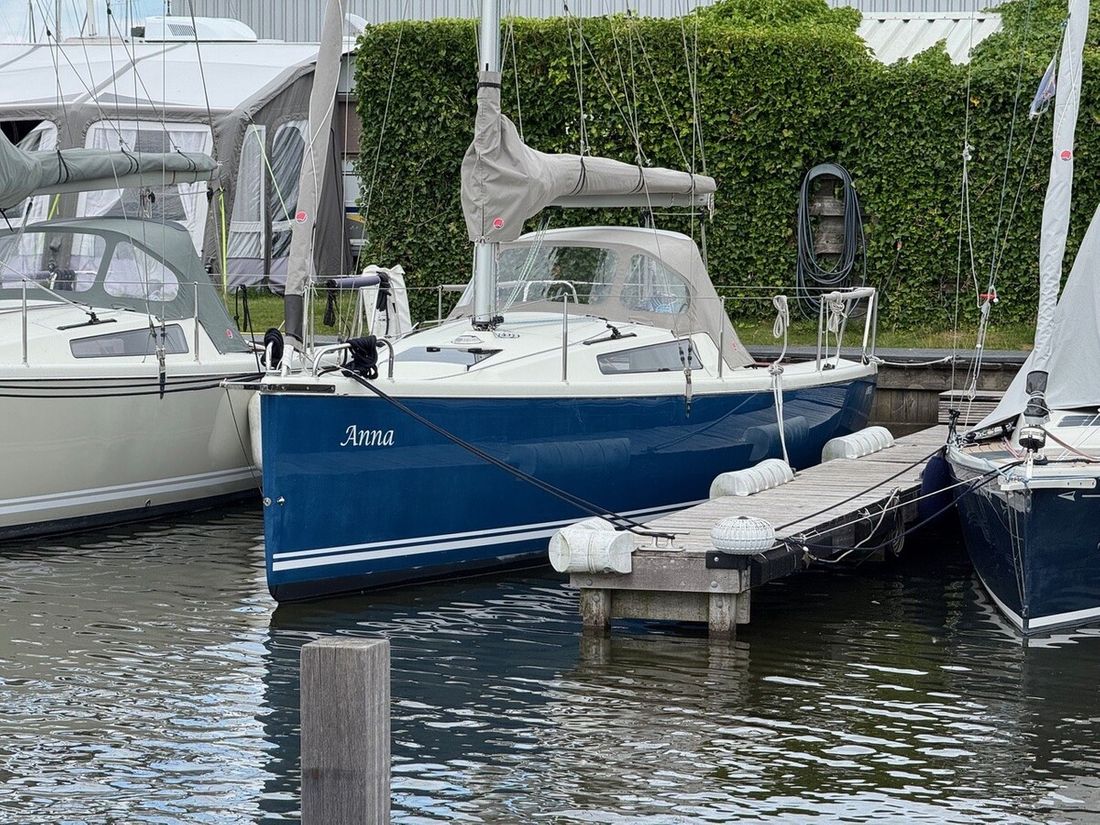 Delivered new Designer van de Stadt Design Shipyard Jachtwerf Heeg CE-category B Inspection certificate Hull deck superstructure Hull shape roundbilge Hull colour blue Deck colour white Deck construction grp (polyester) Cockpit aft cockpit Open cockpit Windows Two windows and one deck hatch Dimensions and weights Waterline length 770 centimetres Steering and Drift Limitation Steering system helm Comments Steering system Including mounted joystick Position steering system outside control Rudder single Keel/Lee board fixed keel -
