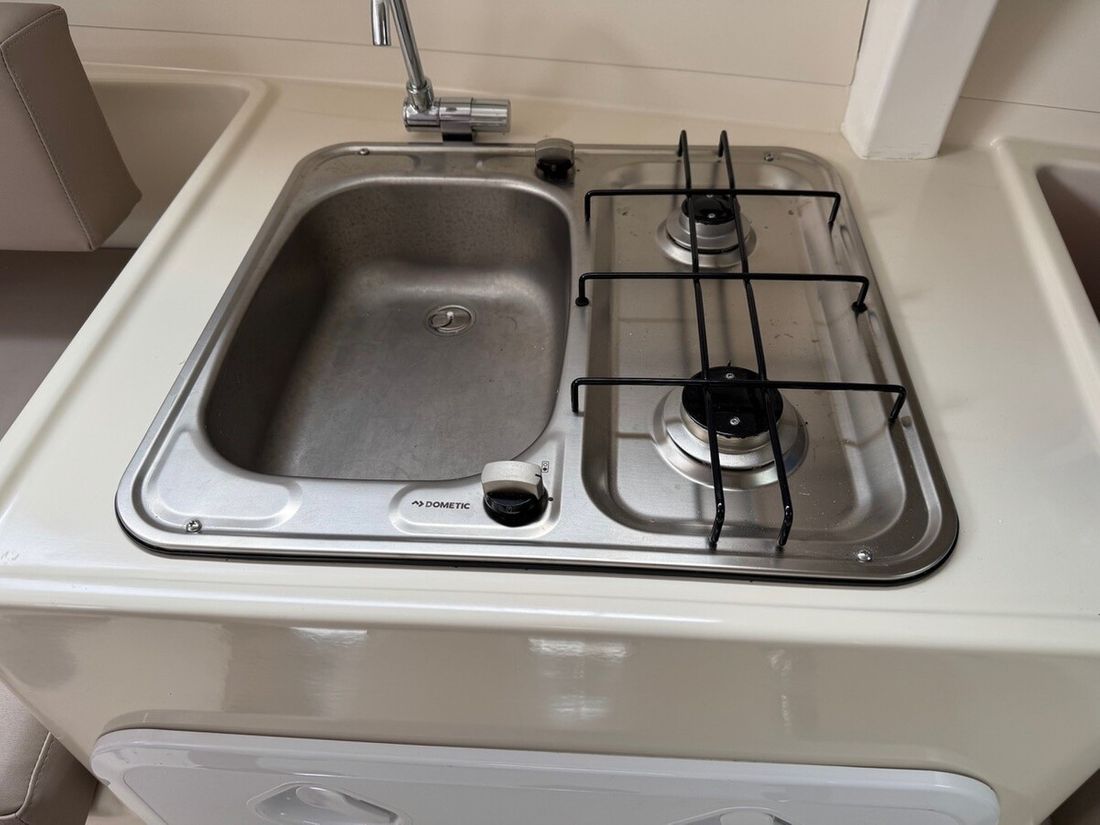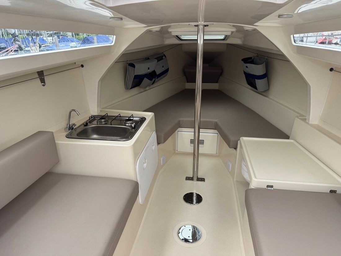Spaces Saloon Engine room Cabins 1 Saloon Layout and spaces inside Two berths in the front of the boat and two in the back under the cockpit benches. Decoration Type interior Modern, light Color upholstery grey Mattresses Cushions Water Water tank & material Capacity 50 centimetres Water tank material plastic Inhoud 50 litre Waste water tank material plastic Waste water tank Water system pressure Plumbing Toilets 1 Manual Kitchen Cooker & fuel Number 2 Cooking fuel gas Fridge & power source Capacity 30 litre Power source electric -