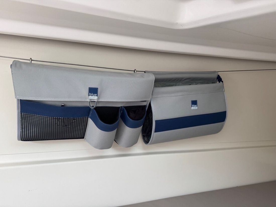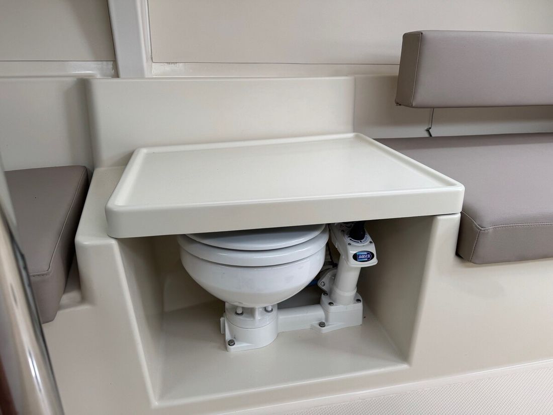a roller furling cover, a main drop system with lazy jacks, a Dacron mainsail and roller furling jib, a Code 0 bowsprit with fittings, a sprayhood with a stainless steel frame, a guardrail with guardrail covers, a folding swim ladder, an anchor, a flagpole and flag, shore power connection, a magnetic compass, a speed-depth log and anemometer (Raymarine), a sink, a gas stove and a fresh water tank, a refrigerator drawer, a toilet with a hand pump and a waste water tank, and a table for both the cabin and cockpit. The benches and cockpit floor are also fitted with Esthec.