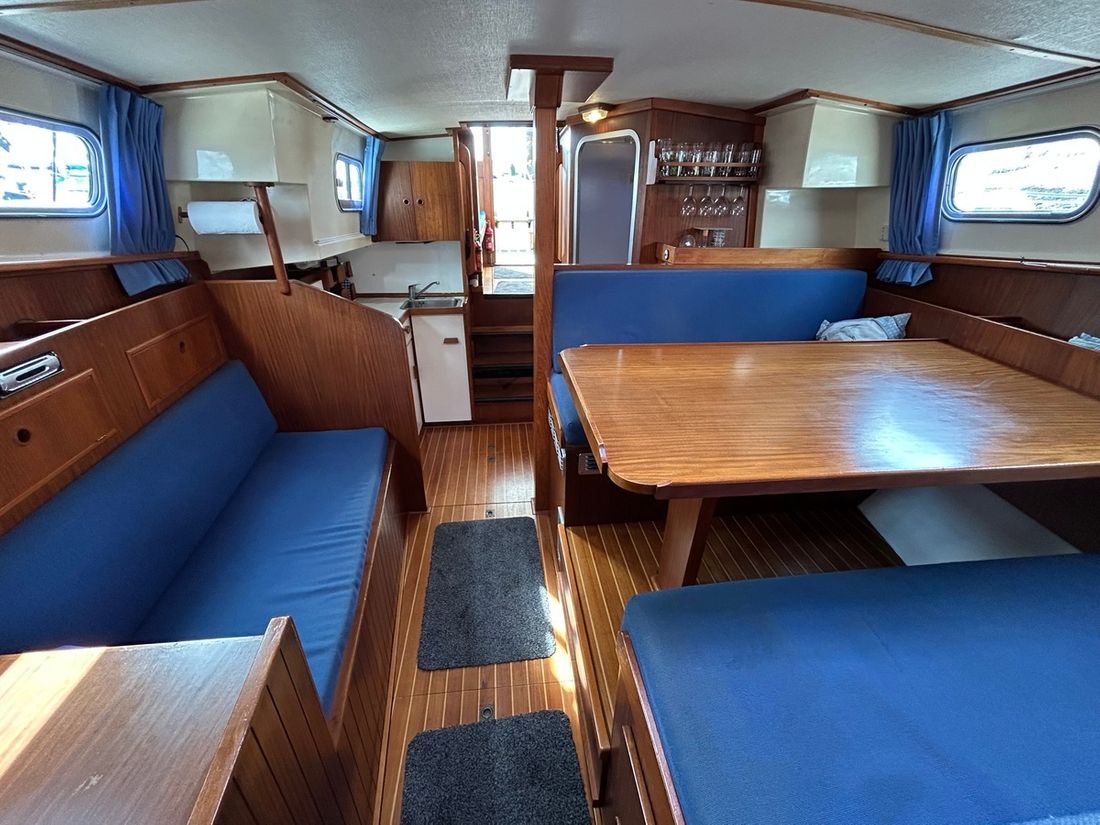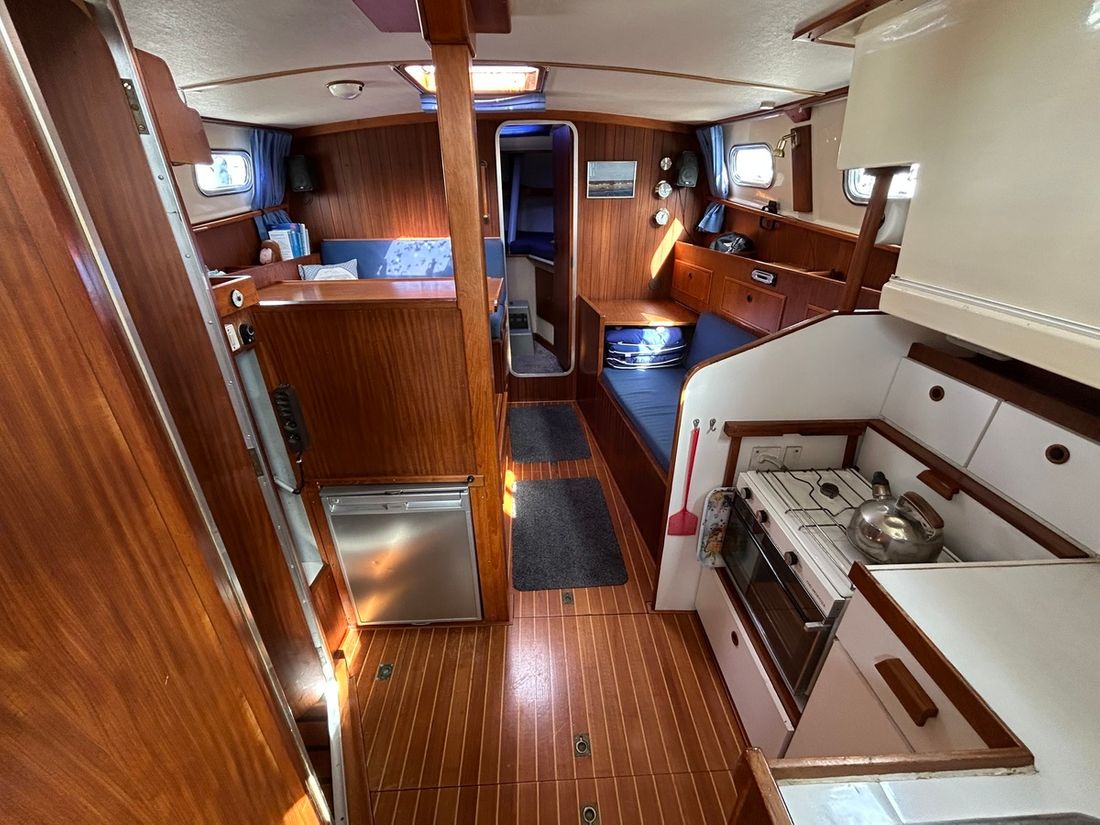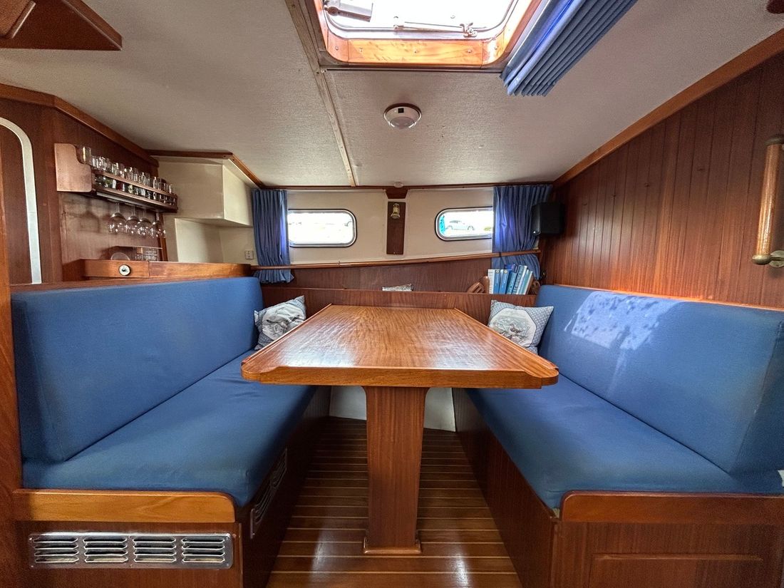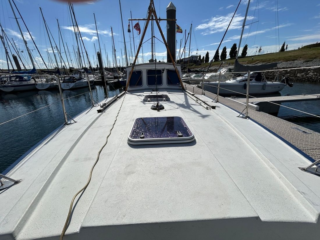 Delivered new Designer Dirk Defeber Shipyard Eista werf Polyboot/Polymarine Hull deck superstructure Hull shape s-shaped Hull colour white Deck colour blue Deck construction grp (polyester) Cockpit aft cockpit Superstructure polyester with a wooden wheelhouse reinforced with a polyester roof Windows aluminum profile Dimensions and weights Comments Vertical clearance With the mast up, the clearance is 4.20 meters. Displacement 9400 kg Ballast 2500 kg Steering and Drift Limitation Steering system wheel Position steering system inside control Rudder single Keel/Lee board full keel -