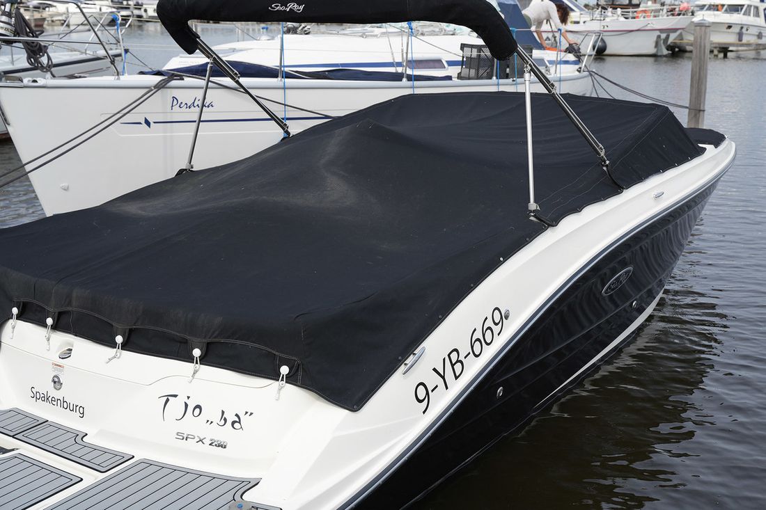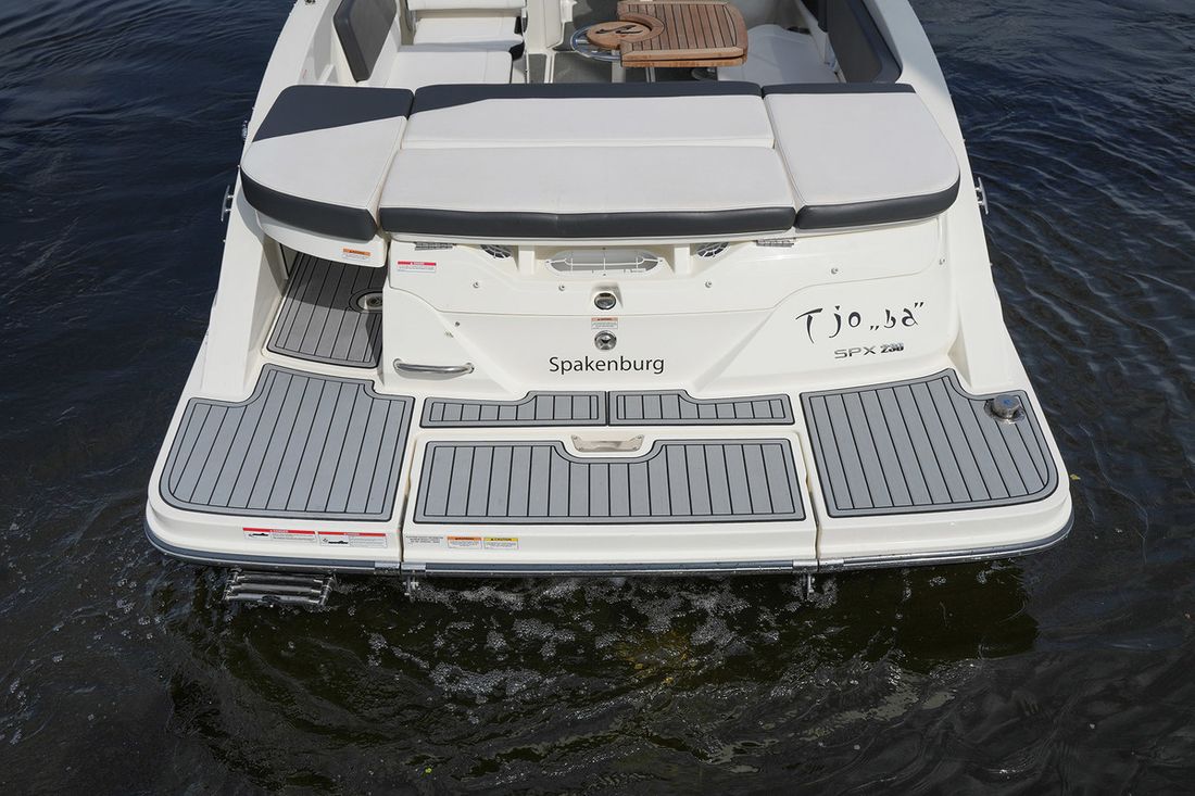 Deze Sea Ray SPX 230 is uitgevoerd met een zwarte rompkleur en een wit onderwaterschip wat is voorzien van een zwarte anti fouling laag. De Sea Ray SPX 230 wordt aangeboden inclusief een Pega V3500 trailer. De boot heeft witte bekleding met een donkergrijze baan. Verder is de boot uitgerust met de volgende opties: