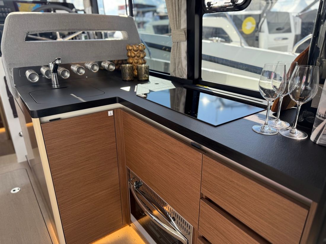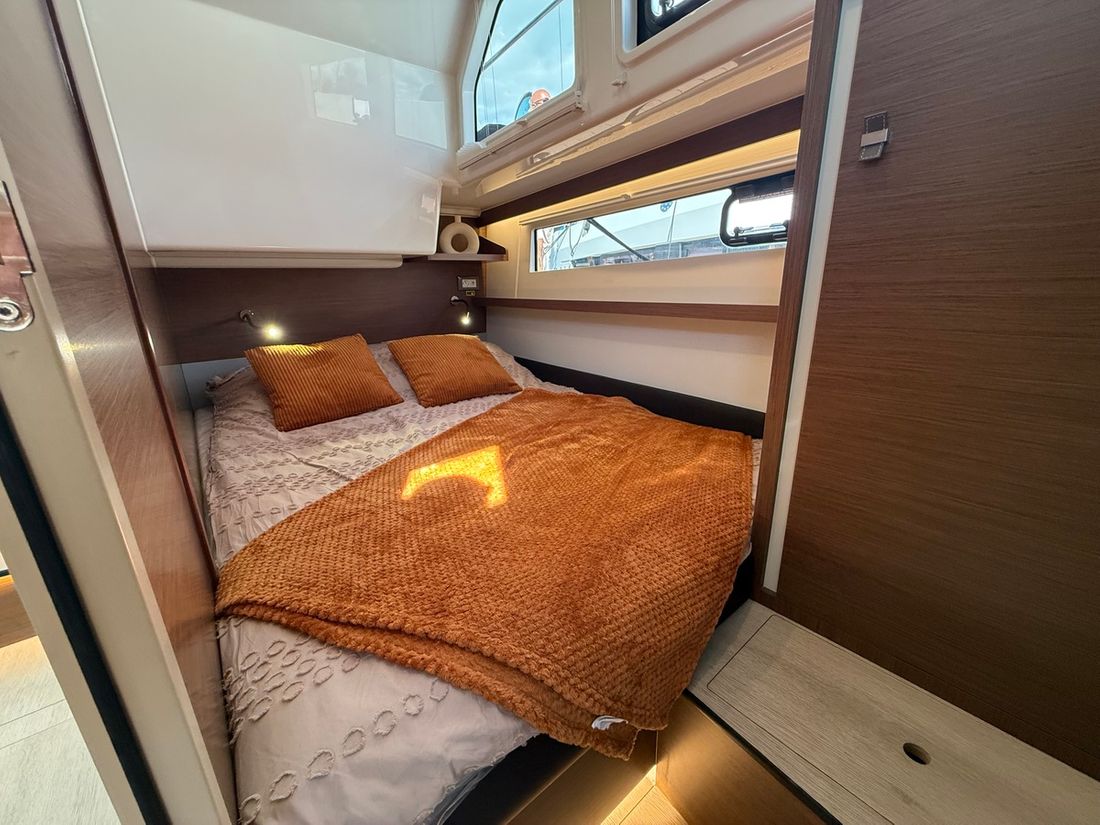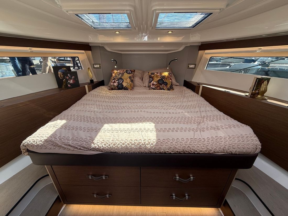 Spaces Saloon Comments Saloon Walnut design with oak floor Separate Dining area Engine room Cabins 2 Comments Cabins Spacious owner's cabin, guest cabin, separate toilet and large shower room. Saloon Decoration Type interior Modern, wood look Comments Type interior Walnut panelling with oak floor. Color upholstery grey Mattresses Cushions Curtains Comments Curtains Gray Water Water tank & material Capacity 380 litre Water tank material plastic Water tank gauge Inhoud 170 litre Waste water tank material plastic Waste water tank Waste water tank gauge Waste water tank drainpump Deck suction Water system pressure Hot water Comments Hot water 40 Liters (shore power and engine cooling water) Deck Shower Plumbing Number of showers 2 Comments Number of showers Spacious shower room inside, outdoor shower on swimming platform Toilets 1 Comments Toilets Flushing from drinking water tank Electric Entertainment Radio/CD player Comments Radio/CD player Fusion Bluetooth (no CD) Kitchen Cooker & fuel Comments Cooker & fuel similar to ceramic/induction hob Number 2 Cooking fuel gas Oven Comments Oven gas Amount 1 Fridge & power source Comments Fridge & power source Large refrigerator directly in the galley, 1 extra cooling drawer under the bench in the saloon Power source electric Freezer Climate control Heating Webasto hot air -