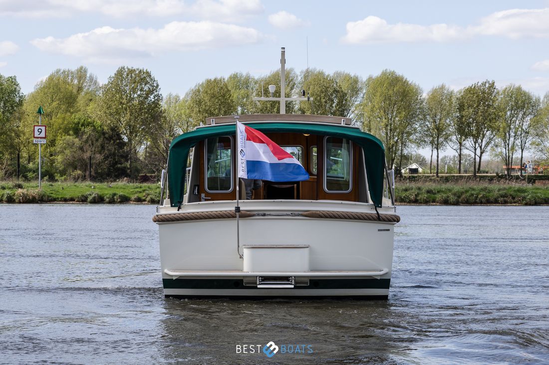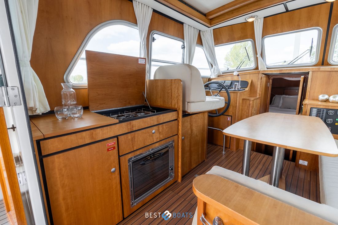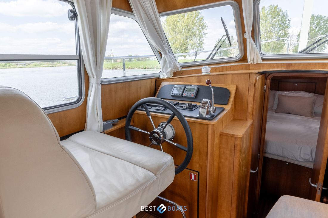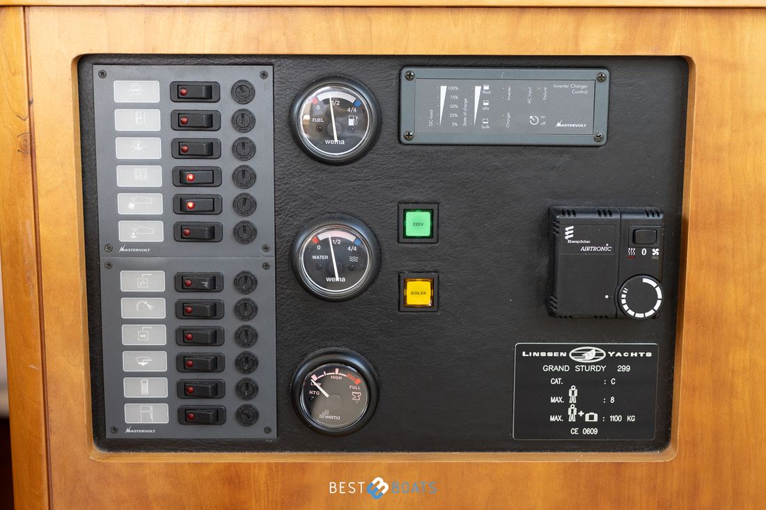 Spaces Saloon Separate Dining area Engine room Cabins 1 Comments Cabins Forward cabin with freestanding double bed including slatted base and spacious storage drawer, various cupboards, toilet room and separate shower room. Berths 4 Comments Berths The owner's cabin is located at the front of the ship. It features a spacious double French bed. Two additional berths are located in the saloon, where you can convert the saloon sofa into a double bed using the Linssen Easy Sleep Convert System. Layout and spaces inside Beautiful lounge with sitting area, kitchen and steering position Decoration Type interior Modern, wood look Comments Type interior The interior is fully upholstered in cream-colored genuine leather. The paneling consists of high-quality okoumé sheet metal with cherry veneer, finished with the patented Linssen FPS® system. The ceilings have a decorative finish, the original Linssen ship's floor is present, and the hardware and push-button locks in all compartments are made of brushed stainless steel. Color upholstery white Mattresses Cushions Curtains Comments Curtains Beige Water Water tank & material Capacity 220 litre Water tank material plastic Water tank gauge Inhoud 240 litre Waste water tank material plastic Waste water tank Waste water tank gauge Waste water tank drainpump Deck suction Water system pressure Hot water Comments Hot water The 24-liter hot water boiler is equipped with a 230V / 800W heating element and is heated via the engine or 220V Deck Shower Plumbing Number of showers 1 Comments Number of showers The shower is separate from the toilet and has its own ensuite shower area. It features vinyl walls, a teak bench, and a chrome shower mixer. Toilets 1 Comments Toilets The toilet area is separate from the shower and is equipped with a Jabsco electric toilet. The basin mixer tap and the walls are finished in chrome and vinyl. The basin has a cabinet base and a synthetic countertop. Electric Entertainment Radio/CD player Comments Radio/CD player Sony, with speakers throughout the ship Kitchen Cooker & fuel Comments Cooker & fuel The kitchen is equipped with a 2-burner gas stove Number 2 Cooking fuel gas Oven Comments Oven Smev Amount 1 Fridge & power source Comments Fridge & power source Coolmatic in salon Capacity 80 litre Power source electric Freezer Comments Freezer Compartment in refrigerator Climate control Heating 1 hot air Comments Heating Eberspächer, diesel tile -