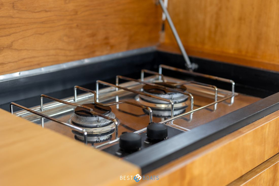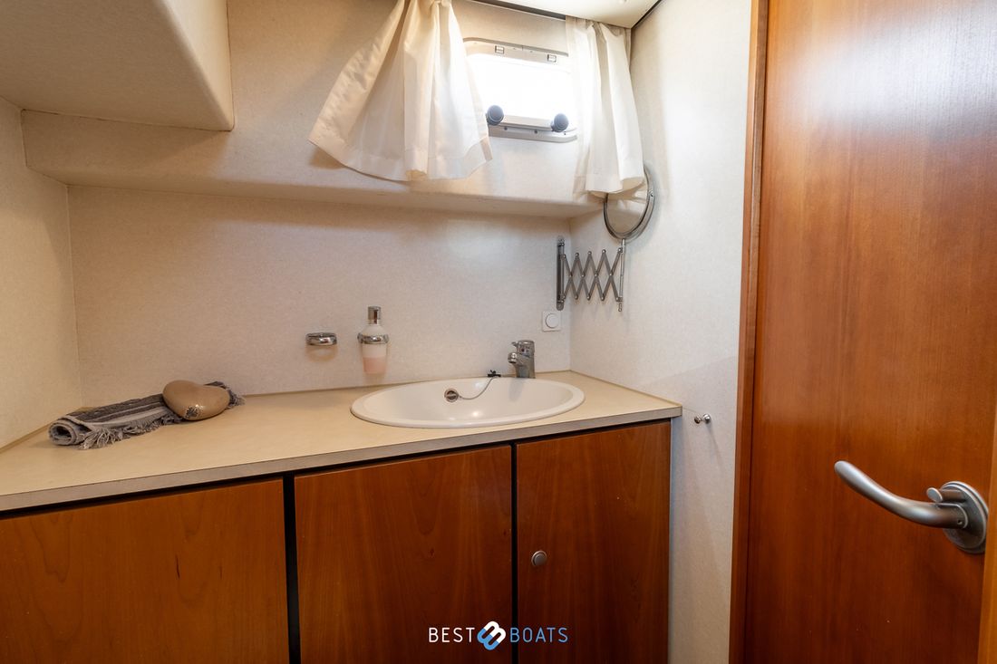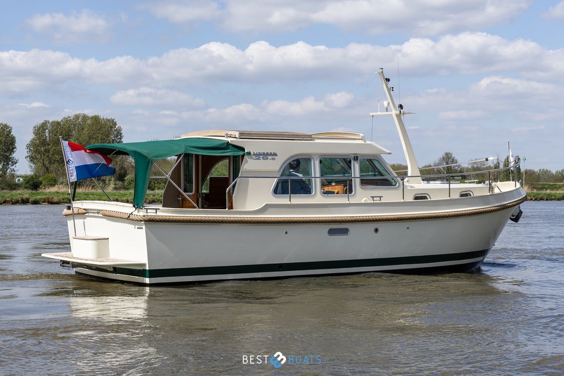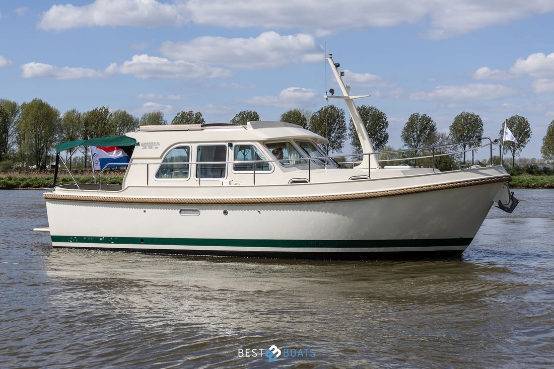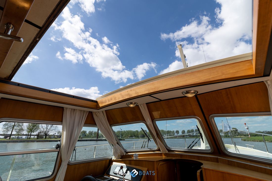 Spaces Saloon Separate Dining area Engine room Cabins 1 Comments Cabins Forward cabin with freestanding double bed including slatted base and spacious storage drawer, various cupboards, toilet room and separate shower room. Berths 4 Comments Berths The owner's cabin is located at the front of the ship. It features a spacious double French bed. Two additional berths are located in the saloon, where you can convert the saloon sofa into a double bed using the Linssen Easy Sleep Convert System. Layout and spaces inside Beautiful lounge with sitting area, kitchen and steering position Decoration Type interior Modern, wood look Comments Type interior The interior is fully upholstered in cream-colored genuine leather. The paneling consists of high-quality okoumé sheet metal with cherry veneer, finished with the patented Linssen FPS® system. The ceilings have a decorative finish, the original Linssen ship's floor is present, and the hardware and push-button locks in all compartments are made of brushed stainless steel. Color upholstery white Mattresses Cushions Curtains Comments Curtains Beige Water Water tank & material Capacity 220 litre Water tank material plastic Water tank gauge Inhoud 240 litre Waste water tank material plastic Waste water tank Waste water tank gauge Waste water tank drainpump Deck suction Water system pressure Hot water Comments Hot water The 24-liter hot water boiler is equipped with a 230V / 800W heating element and is heated via the engine or 220V Deck Shower Plumbing Number of showers 1 Comments Number of showers The shower is separate from the toilet and has its own ensuite shower area. It features vinyl walls, a teak bench, and a chrome shower mixer. Toilets 1 Comments Toilets The toilet area is separate from the shower and is equipped with a Jabsco electric toilet. The basin mixer tap and the walls are finished in chrome and vinyl. The basin has a cabinet base and a synthetic countertop. Electric Entertainment Radio/CD player Comments Radio/CD player Sony, with speakers throughout the ship Kitchen Cooker & fuel Comments Cooker & fuel The kitchen is equipped with a 2-burner gas stove Number 2 Cooking fuel gas Oven Comments Oven Smev Amount 1 Fridge & power source Comments Fridge & power source Coolmatic in salon Capacity 80 litre Power source electric Freezer Comments Freezer Compartment in refrigerator Climate control Heating 1 hot air Comments Heating Eberspächer, diesel tile -