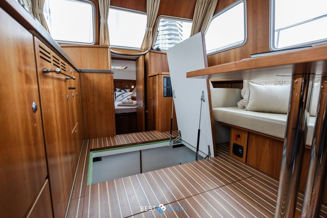 On board you will find a light and attractive saloon with a spacious L-shaped seating area and a practically laid-out galley, equipped with everything you need for a pleasant stay on board. The owner's cabin in the bow has a freestanding double bed, while the spacious aft cabin also has a double bed. Thanks to the Easy Sleep Convert system, two additional comfortable berths can be created, allowing this yacht to accommodate six people. The warm cherry wood finish combined with beige leather upholstery gives the interior a luxurious and homely ambience.