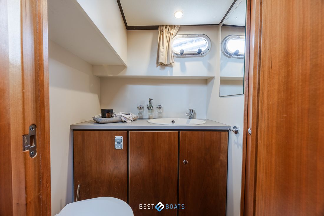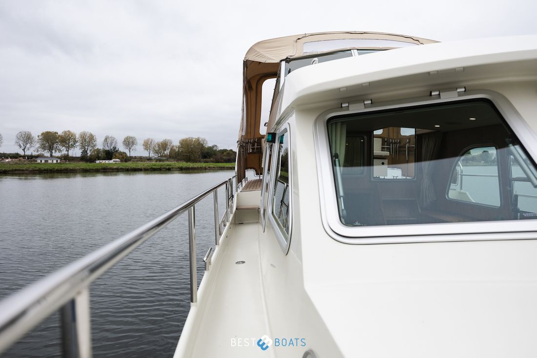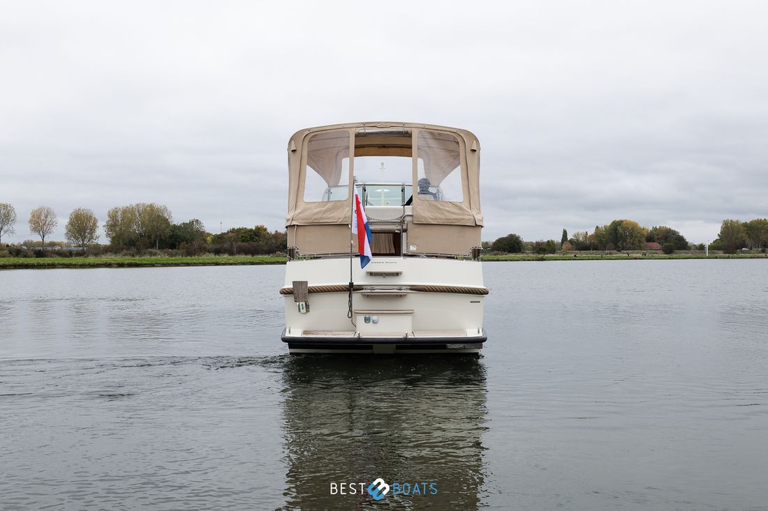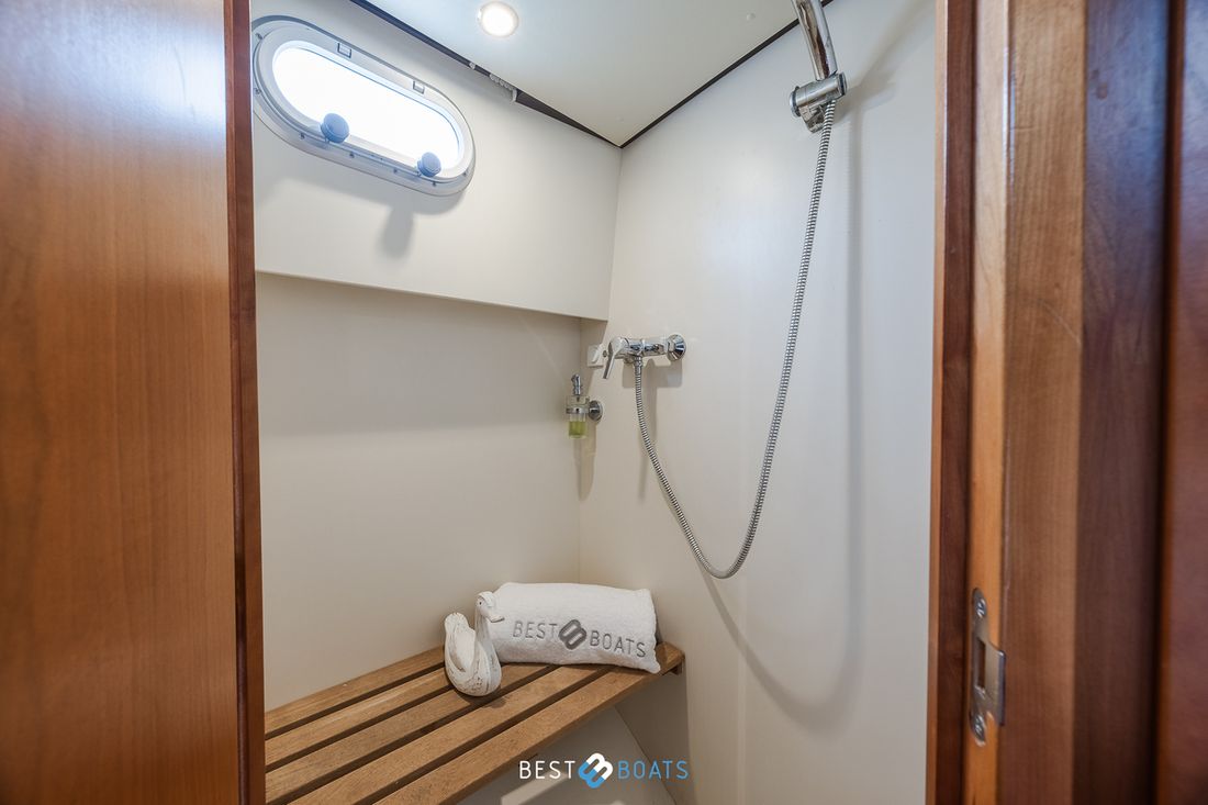 Spaces Saloon Comments Headroom The standing height in the fore cabin is 183 cm, in the saloon 194 cm and in the aft cabin 187 cm. Separate Dining area Engine room Cabins 2 Comments Cabins The owner's cabin is located in the bow of the boat, the guest cabin is located in the aft of the boat, Berths 6 Comments Berths The owner's cabin features a generous freestanding double bed, while the guest cabin has another large double bed to the side. Two additional berths can be created by converting the center section of the seating area using the Easy Sleep Convert system. Saloon Layout and spaces inside The living room is beautifully spacious with plenty of natural light. It features a lovely, generously sized L-shaped seating area and a modest desk, while the large kitchen is equipped with all modern conveniences. Decoration Type interior Modern, wood look Comments Type interior The interior is stylishly finished with beige leather upholstery, creating a warm and inviting atmosphere. The ceiling is upholstered in white leather, giving the whole space a light and modern feel. The cherry wood interior adds a classic, elegant touch and emphasizes the high-quality finish on board. Color upholstery beige Mattresses Cushions Curtains Comments Curtains Beige curtains matching the interior Water Water tank & material Capacity 220 litre Water tank material plastic Water tank gauge Comments Water tank gauge Vetus Inhoud 240 litre Waste water tank material plastic Waste water tank Waste water tank gauge Waste water tank drainpump Deck suction Water system pressure Hot water Comments Hot water 25-liter Quick boiler, which can be heated by either the engine or 220V. This ensures that hot water is always available, both while sailing and at the dock. Deck Shower Plumbing Number of showers 1 Comments Number of showers The forward bedroom has a shower room, which is separate from the toilet, and is equipped with a teak seat. Toilets 2 Comments Toilets Both bedrooms have a toilet. The rear toilet is a manual Jabsco, and the front toilet is an electric Jabsco. Manual Electric Entertainment Radio/CD player Comments Radio/CD player Kenwood Radio with 2 speakers inside and 2 speakers outside Kitchen Cooker & fuel Comments Cooker & fuel 3 Burner Eno gas stove with glass cover Number 3 Cooking fuel gas Fridge & power source Comments Fridge & power source Waeco 80-liter electric refrigerator with freezer compartment Capacity 80 litre Power source electric Freezer Comments Freezer Compartment in refrigerator Climate control Heating 1 hot air Comments Heating A 4 kW Eberspächer Airtronic D4 diesel hot-air heater, which allows the interior to be heated quickly and efficiently, even in cooler conditions. -