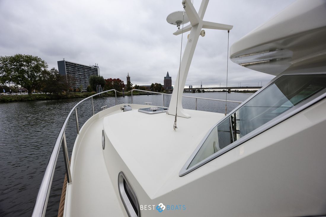 Anchor Anchors & material Number 1 Type 15 kg. Bruce anker Anchors material galvanized Anchor connection chain Anchor windlass electric Comments Anchor windlass Quick ankerlier Deck equipment Sprayhood Comments Sprayhood Equipped with a beige cockpit tent, all parts of which can be zipped out. Cockpit tent Outdoor cushions Comments Outdoor cushions Beige cushion set for the deck chests. Boat cover Comments Boat cover The vessel is equipped with a cover for the instruments of the steering position Sea rails Comments Sea rails Fitted all around with a sleekly polished stainless steel sea rail, with a hinged integrated boarding ladder in both side aisles and an opening in the railing in the bow that can be easily closed with a stainless steel chain. Swimming platform Comments Swimming platform Integrated into the hull and clad with solid teak beams for a luxurious and durable finish. It also features a robust rubber bumper for protection when mooring or maneuvering. Swimming ladder Comments Swimming ladder Folding stainless steel swim ladder with teak steps, integrated into the swim platform for easy and safe entry and exit. Miscellaneous Teak deck Comments Fenders, lines Complete set -