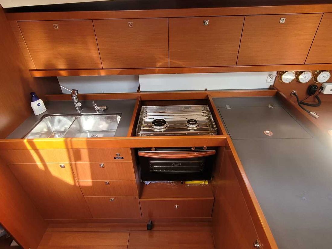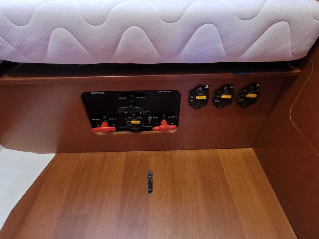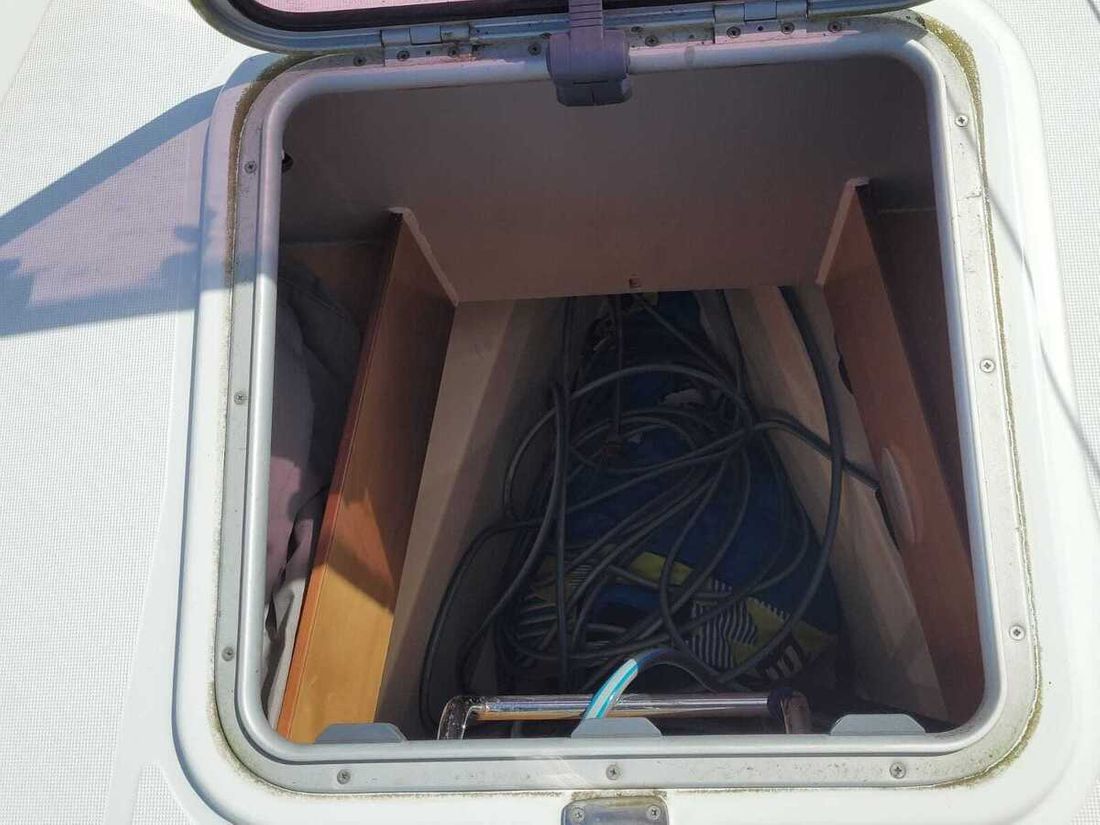 Ruimtes Salon Eethoek Machinekamer Hutten 3 Opmerkingen Hutten 2 hutten achterin, 1 hut voorin Salon Indeling en verblijfsruimtes voorpunt 2-pers, ruime salon met U-bank, navigatiehoek en kombuis, 2x 2-pers. achterkajuiten Aankleding Type interieur Klassiek, warm Kleur stoffering beige Matrassen Kussens Gordijnen Water Watertank & materiaal Inhoud 370 liter Materiaal watertank kunststof Watertankmeter Inhoud 100 liter Materiaal vuilwatertank kunststof Vuilwatertank & materiaal Opmerkingen Vuilwatertank & materiaal 2 vuilwatertanks Dekafzuiging vuilwater Watersysteem druksysteem Warm water buitendouche Sanitair Aantal douches 2 Toiletten 2 Elektrisch Entertainment Radio/CD-speler Keuken Kooktoestel & brandstof Opmerkingen Kooktoestel & brandstof De flexibele gasleidingen en gasinstallatie aan boord zijn niet gecontroleerd op conformiteit. Aantal 2 Kookbrandstof gas Oven Aantal 1 Koelkast & voeding Opmerkingen Koelkast & voeding inhoud niet bekend Voeding elektrisch Vriezer Opmerkingen Vriezer inhoud niet bekend Klimaatregeling Verwarming 1 hete lucht Opmerkingen Verwarming Webasto -