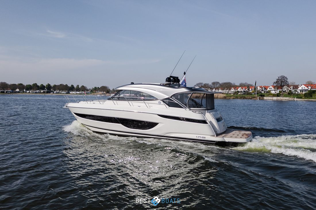 Nieuw geleverd Ontwerper Riviera Werf Riviera Marine (Int.) Pty. Ltd. Australie Opmerkingen Werf Op ’s werelds grootste eiland ligt de werf van Riviera Yachts. Een imposante aanblik, want de scheepswerf ligt aan de goudkust van Australië. Op deze bijzondere locatie worden de zeer luxe en duurzame jachten van Riviera gebouwd. Het geheim achter de jachten? Het bedrijf heeft een grote liefde voor watersport en functioneel design. CE B Opmerkingen CE B: Ontworpen voor zeereizen tot windkracht 8 op de schaal van Beaufort en een golfhoogte van maximaal 4 meter, bijvoorbeeld op zee. CE-normering B Romp, dek en opbouw Rompvorm v-bodem Rompkleur wit Dek en opbouw kleur wit Dek en opbouw materiaal polyester Kuip achterkuip Open Kuip (OK) Ramen Getint glas, met diverse te openen patrijspoorten voorzien van muggenhorren. In de cockpit aan SB en BB zijde grote schuiframen. Afmetingen en gewichten Kruiphoogte 394 cm Lengte waterlijn 1316 cm Waterverplaatsing 19200 kg Besturing en driftbeperking Besturing stuurwiel Opmerkingen Besturing Standaard heeft de Riviera 4600 SPORT YACHT-PLATINUM EDITION 2x joystick, een op de binnen stuurstand en een tweede buiten bij de openkuip. Plek besturing binnen Afstandsbediening Roer dubbel Opmerkingen Roer Elektronische besturing, maakt functies mogelijk zoals sturen met het stuurwiel of joystick. Kiel/zwaard vaste kiel Trimflaps -