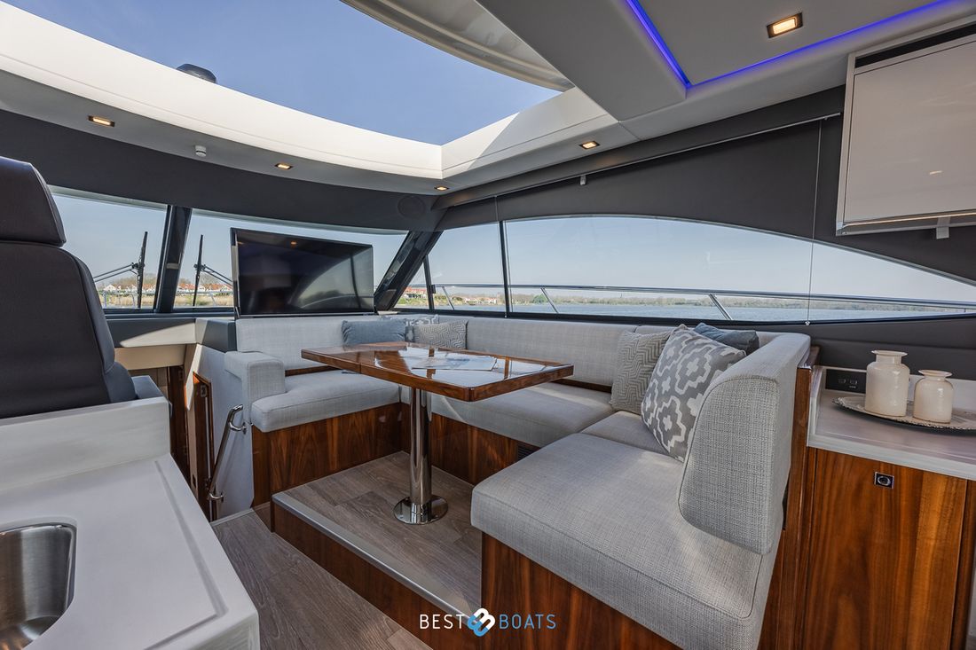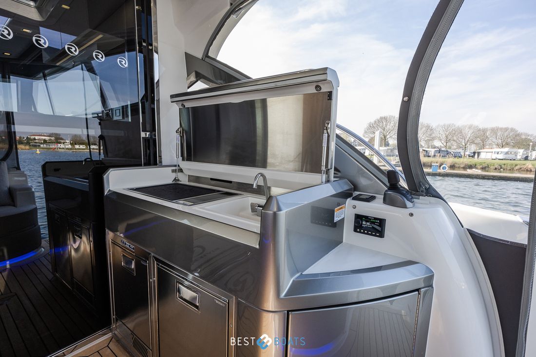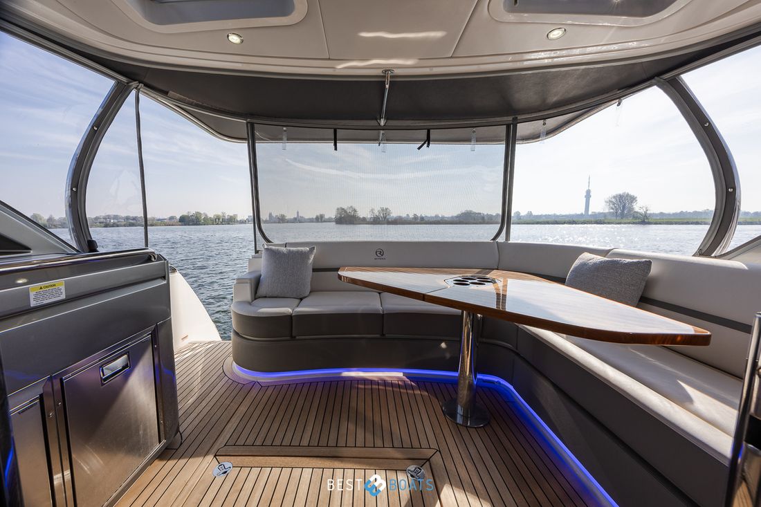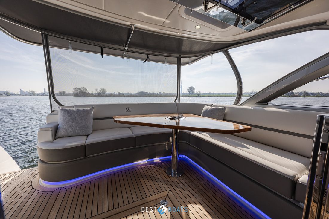 Door het ontwerp van Riviera Yachts is er een naadloze connectie van binnen naar buiten. Buiten bevinden zich twee lounge gelegenheden, waaronder een grote tafel voor een groot gezelschap. Buiten is er tevens een bar met een koelkast, ijsmachine, wasbak, en meer! Het ontwerp is net zo praktisch, als luxe. De materialen zijn allen hoogwaardig van kwaliteit. De railing is gemaakt van roestvrij staal en het hout is hoogwaardig gelakt.