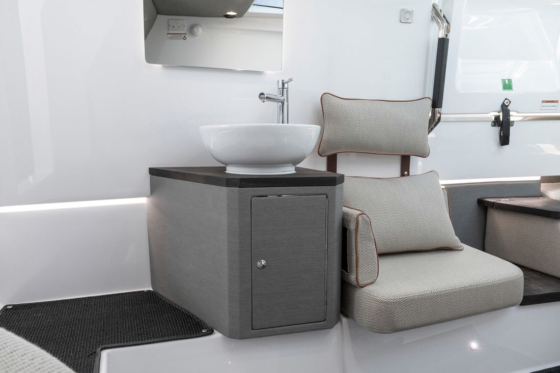 Hoofdmotor Opmerkingen Merk Mercury verado Opmerkingen Vermogen Mogelijke motorisatie: 225-350 pk Opmerkingen Brandstof Benzine Opmerkingen Verbruik 2.6 liter per nautical mile Aandrijving Opmerkingen Koeling Watergekoeld Tank Opmerkingen Brandstoftank aantal Aluminium tank 730 liter Prestaties Opmerkingen Max snelheid 35 tot 45 knopen Boeg- en hekschroef Opmerkingen Boegschroef Optioneel Elektriciteit Opmerkingen Voltage 12 volt -