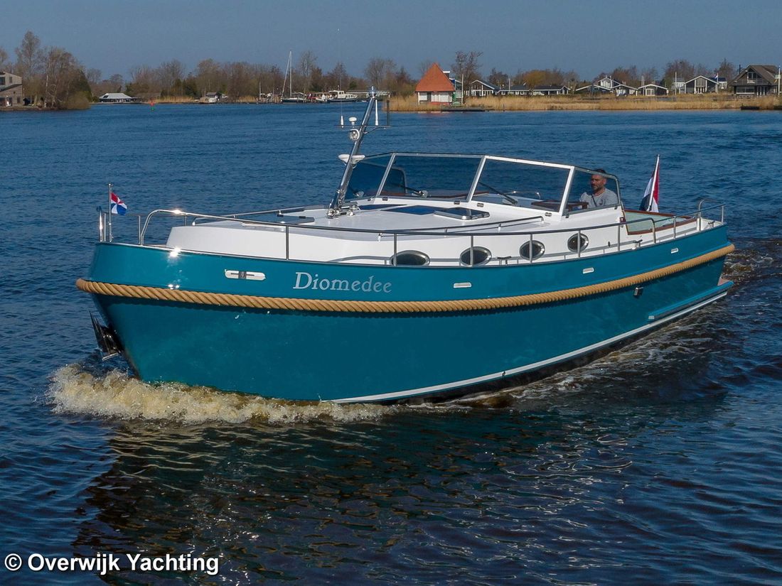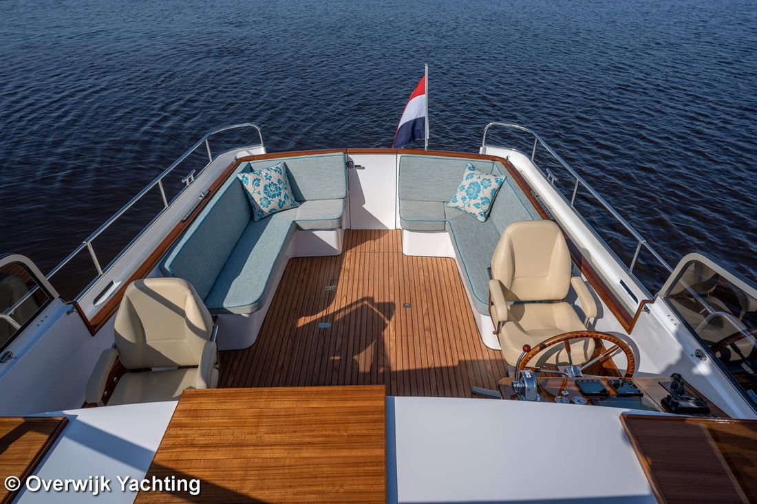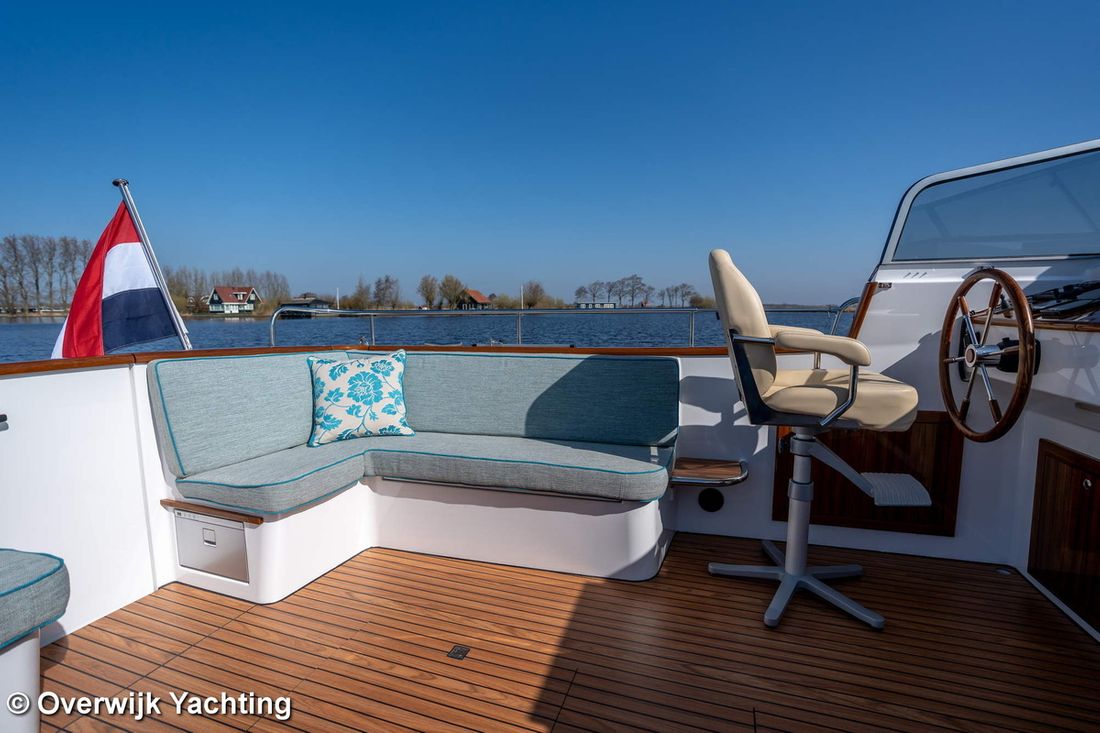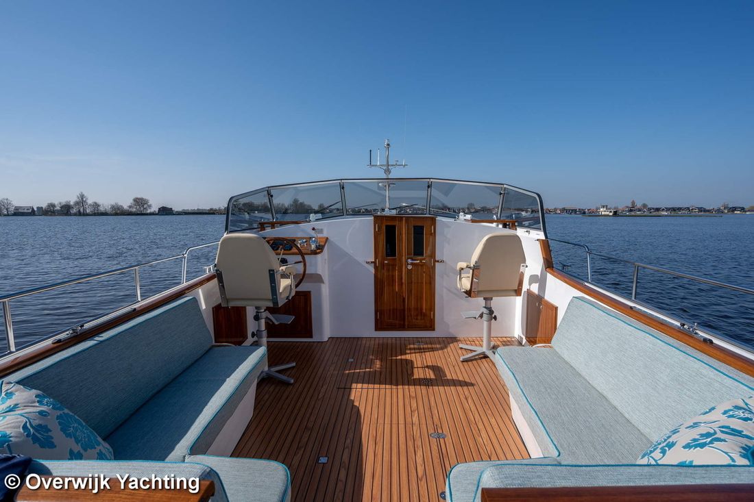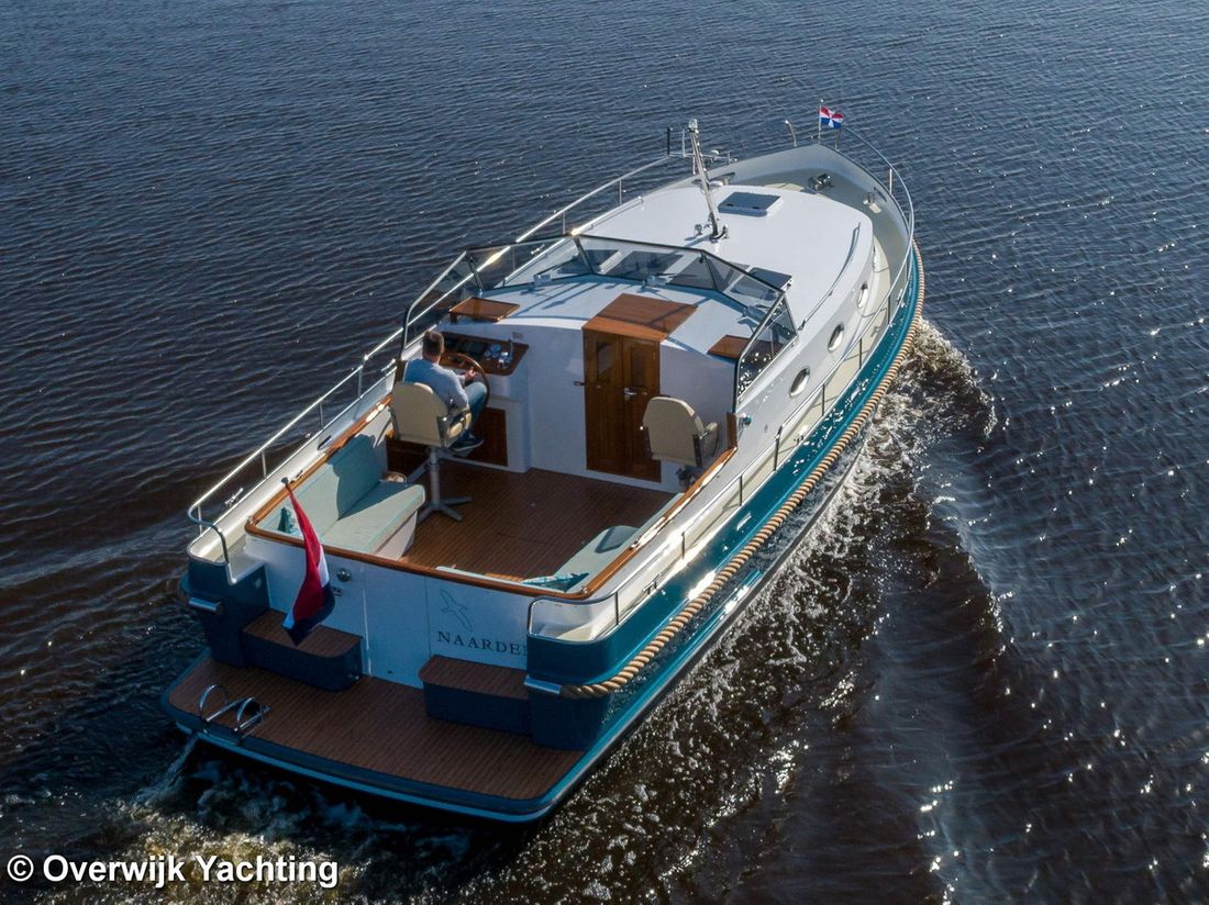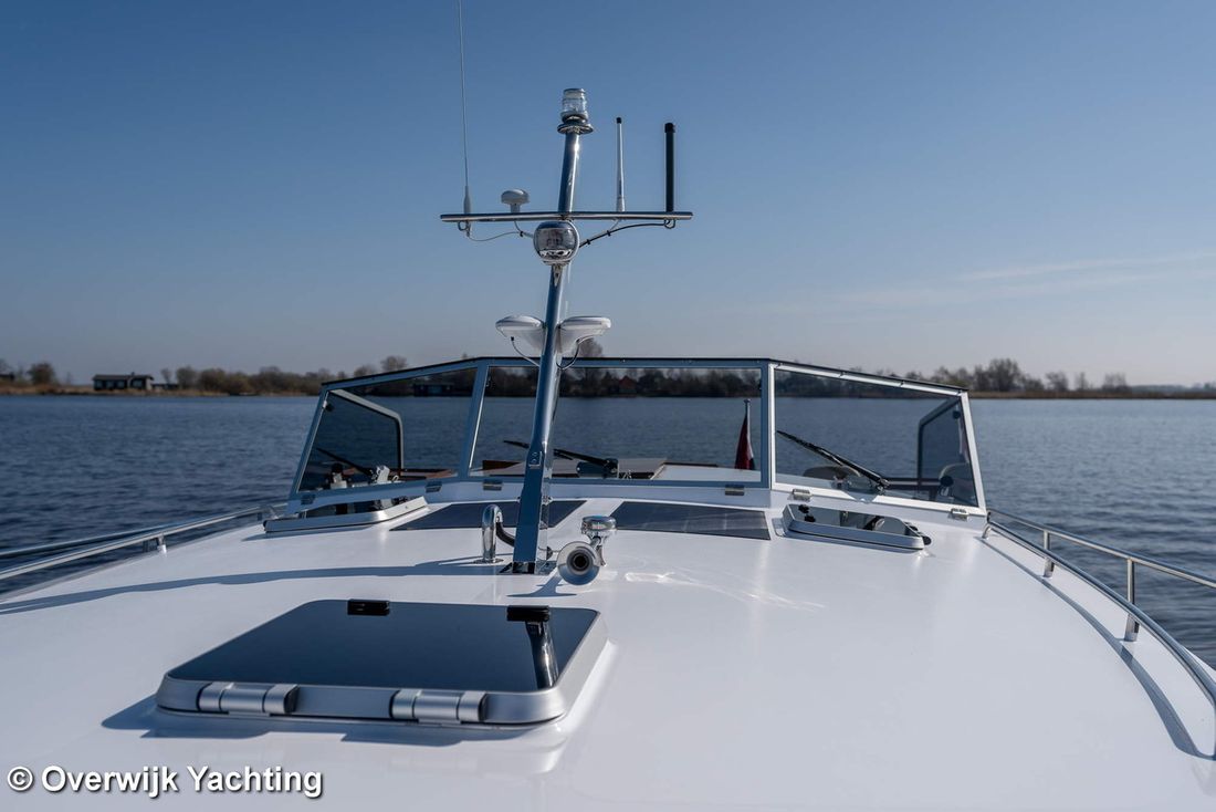 Nieuw geleverd Ontwerper Langenberg jachtontwerp Werf Overwijk Yachting CE C CE max gewicht 1000 kg CE aantal opvarenden 8 Romp, dek en opbouw Rompvorm multiknik Dek en opbouw materiaal staal Kuip achterkuip Open Kuip (OK) Afmetingen en gewichten Opmerkingen Doorvaarthoogte Met tent ca. 250 cm Kruiphoogte 215 cm Diepgang maximaal 104 cm Diepgang minimaal 99 cm Lengte waterlijn 1020 cm Waterverplaatsing 10302 kg Besturing en driftbeperking Besturing stuurwiel Plek besturing buiten Roer enkel -