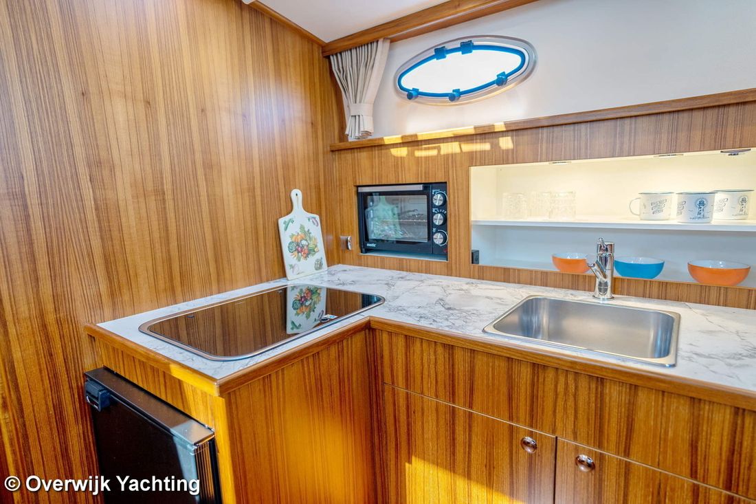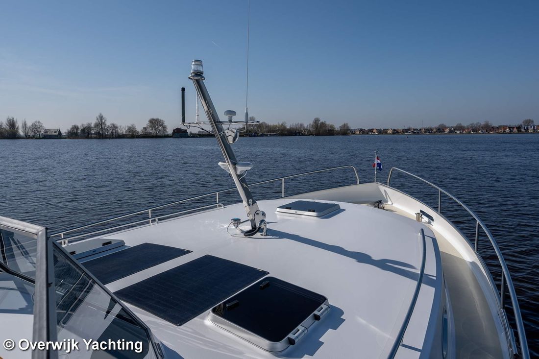 Motorisatie Aantal identieke motoren 1 Start type elektrisch Hoofdmotor Type binnenboord Merk Nanni Opmerkingen Merk Andere motoren als optie. Model N4.65 Aantal cilinders 4 Vermogen 59 pk Urenteller Brandstof diesel Verbruik 3 liter/uur Aandrijving Overbrenging schroefas Voortstuwing schroef Koeling indirect Tank Brandstoftank aantal Aantal 2 Totale inhoud brandstoftank(s) 509 liter Materiaal brandstoftank staal Prestaties Max snelheid 15 km/h Kruissnelheid 12 km/h Meetinstrumenten motor Brandstoftankmeter Toerenteller Oliedrukmeter Temperatuurmeter Boeg- en hekschroef Boegschroef elektrisch Hekschroef elektrisch Opmerkingen Hekschroef optie. Elektriciteit Accu Opmerkingen Accu Start- en boegschroefaccu 120 Ah, Service-accu 220 Ah Aantal 2 Acculader Capaciteit 35 Dynamo Generator Merk generator optie Omvormer Capaciteit 800 Voltmeter Walstroom Walstroomkabel Zonnepaneel Opmerkingen Zonnepaneel Optie. Capaciteit 156 12V -