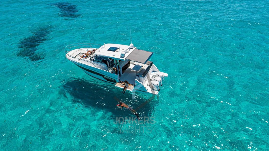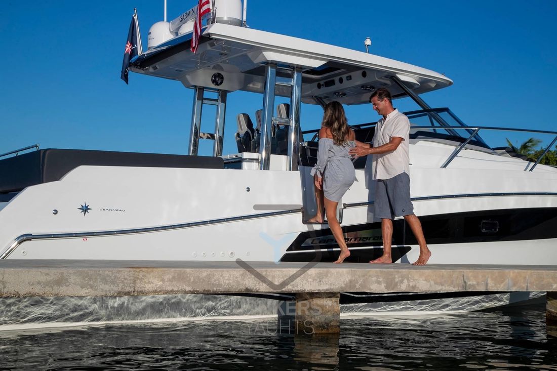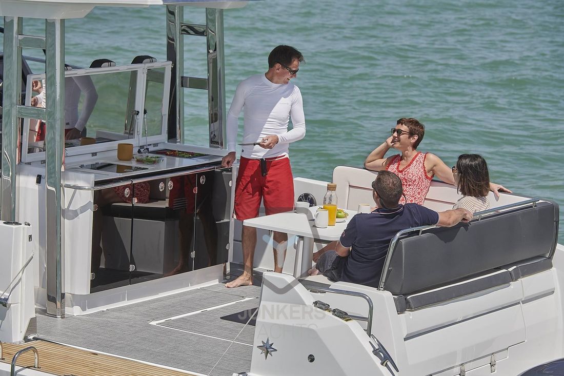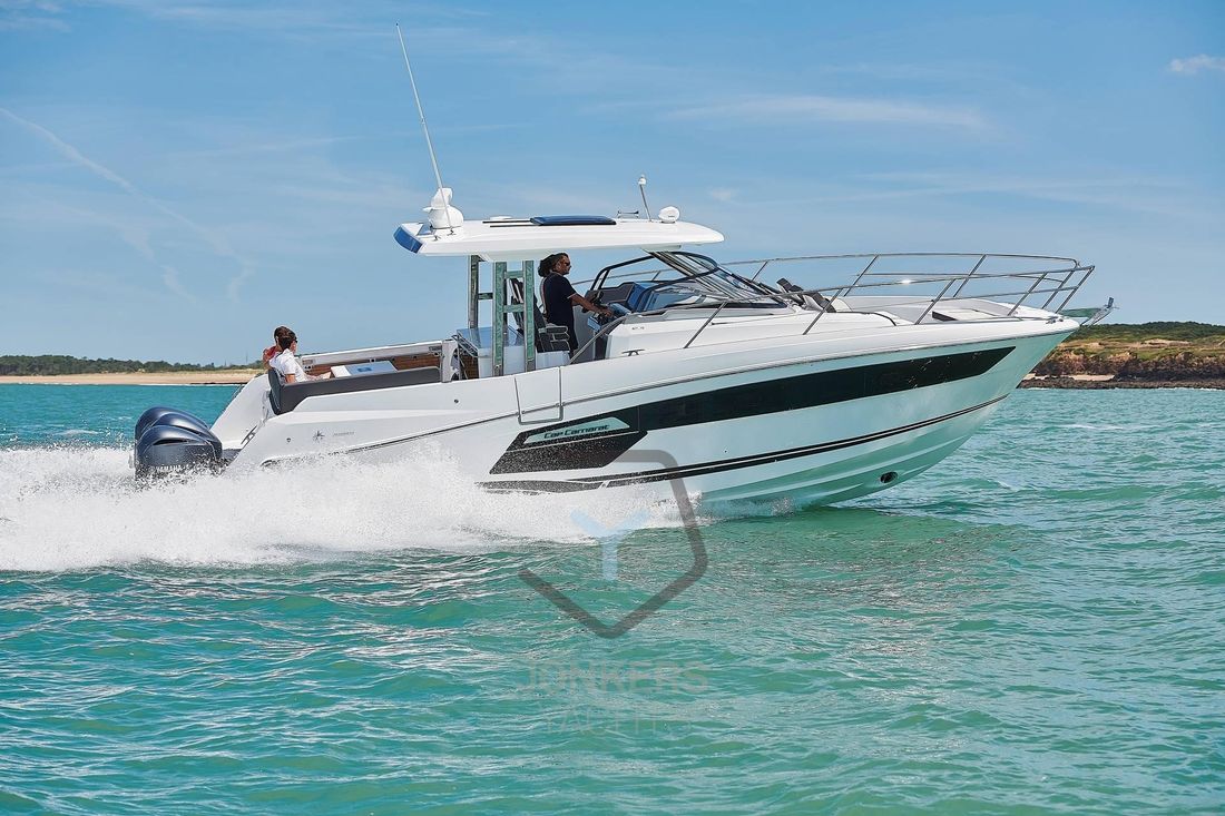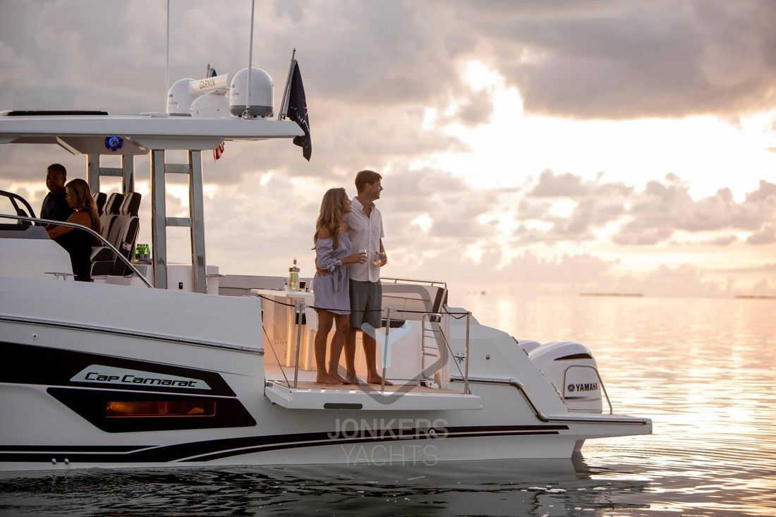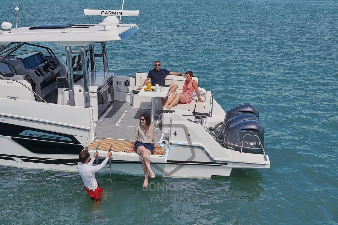 PRESTIGIEUZE ONTWERPERS De gecombineerde talenten van Michael Peters, die de prachtige V-vormige romp ontwierp, en het ontwerpbureau Sarrazin, die met een puur ontwerp kwam om het kenmerkende ontwerp van de Cap Camarat te herinterpreteren, zorgen ervoor dat deze nieuwe Cap Camarat 12.5 WA de wereld van luxe betreedt. PRESTATIES OP HOOG NIVEAU Met een maximaal vermogen van 900 pk (2 x 450 pk of 3 x 300 pk) en een V-vormige, gestroomlijnde romp ontworpen door Michael Peters, een van 's werelds topspecialisten, voldoen haar prestaties aan alle verwachtingen. De eerste proefvaarten bevestigen de hoge prestaties en het opmerkelijke vaarcomfort. ROYALE AFMETINGEN Een maximale lengte van 11,90 m en een maximale breedte van 3,58 m zorgen voor goed gedefinieerde leefruimtes en perfecte ergonomie in een nieuwe benadering van motorboten met buitenboordmotoren. BELANGRIJKE INNOVATIES In de geest van Cap Camarat bevatten de perfect uitgebalanceerde leefruimtes een aantal belangrijke innovaties. De voorste salon met tegenoverliggende zitplaatsen biedt een uitzonderlijke extra leefruimte. Het kuipterras is een uitzonderlijke leefruimte voor anker. De buitenkeuken met meerdere configuraties wordt het middelpunt aan boord. LUXE INTERIEURS De luxe van de ruimte en de gekozen materialen versterken de geest van Cap Camarat. De achterkajuit over de volle breedte, met kingsize bed en aparte doucheruimte, draagt bij aan het uitzonderlijke comfort aan boord. Ten slotte openen de grote zeeramen de leefruimte binnenstebuiten.