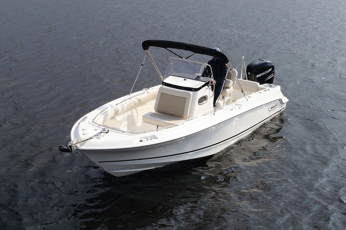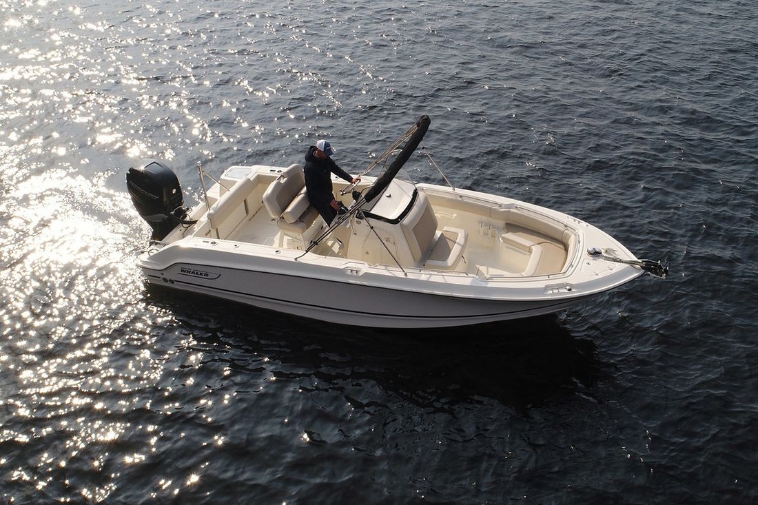 Nieuw geleverd Ontwerper Boston Whaler Werf Boston Whaler Romp, dek en opbouw Rompvorm v-bodem Rompkleur wit Dek en opbouw materiaal polyester sandwich Kuip middenkuip Open Kuip (OK) Afmetingen en gewichten Diepgang maximaal 38 cm Waterverplaatsing 1.406 kg Besturing en driftbeperking Besturing stuurwiel Plek besturing buiten Roer enkel -