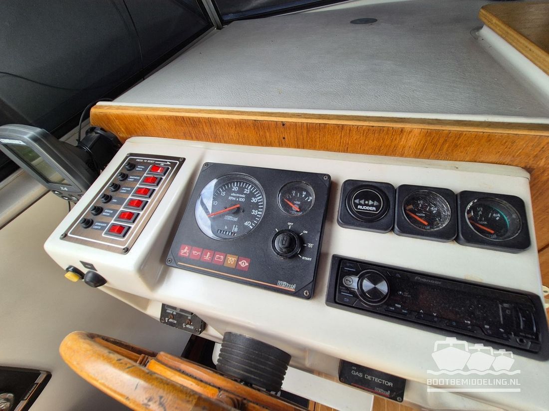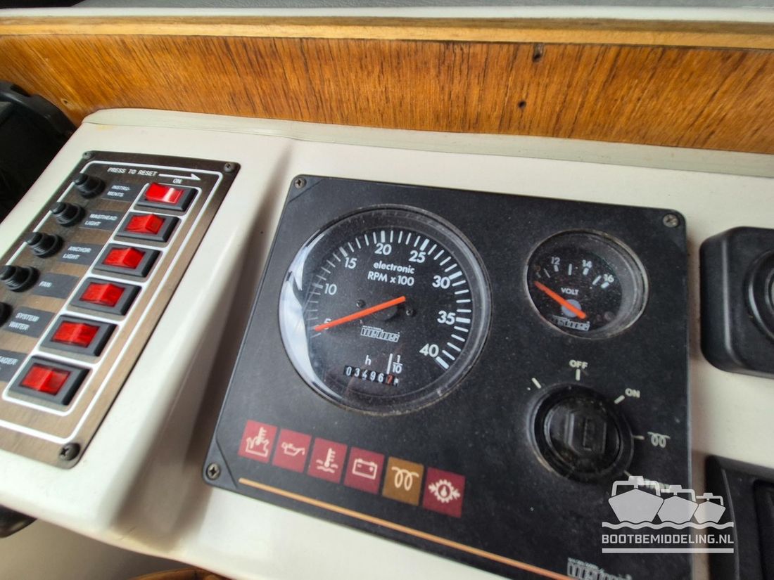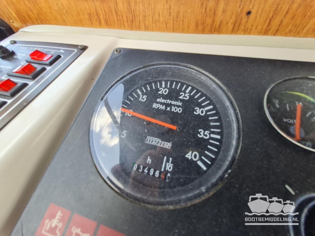 Motorisatie Aantal identieke motoren 1 Start type elektrisch Hoofdmotor Type binnenboord Merk Vetus Model M414 Serienummer 46572 / 43050 Bouwjaar 1994 Aantal cilinders 4 Vermogen 33 pk Brandstof diesel Aandrijving Overbrenging schroefas Voortstuwing schroef Koeling indirect Tank Brandstoftank aantal Aantal 1 Totale inhoud brandstoftank(s) 120 liter Prestaties Max snelheid 12 km/h Kruissnelheid 9 km/h Meetinstrumenten motor Opmerkingen Temperatuurmeter alarm in dashboard Elektriciteit Accu Aantal 2 xAh per accu 70