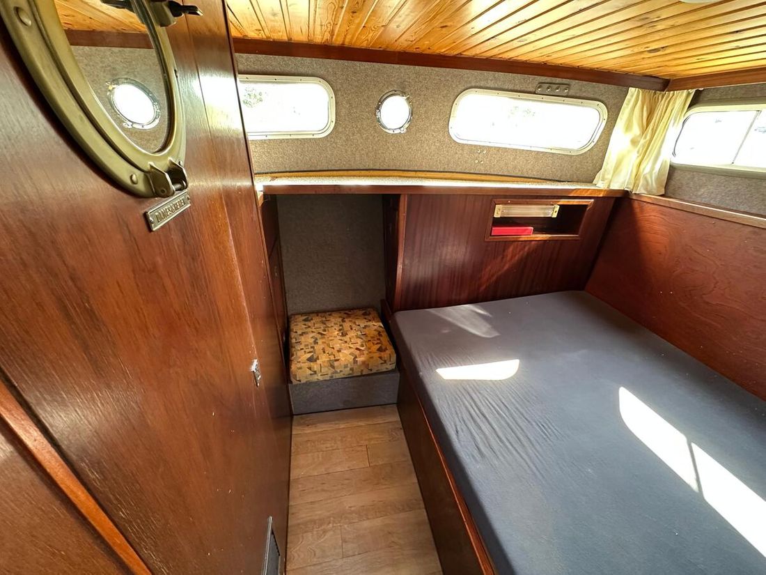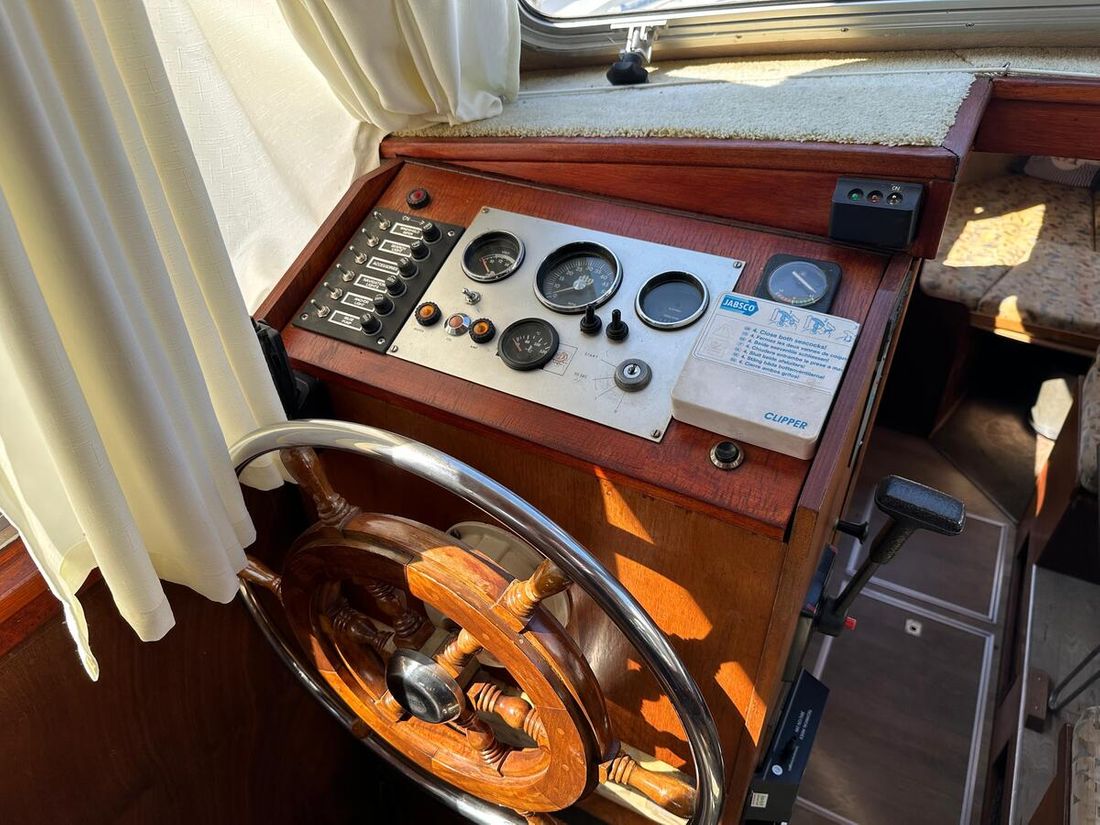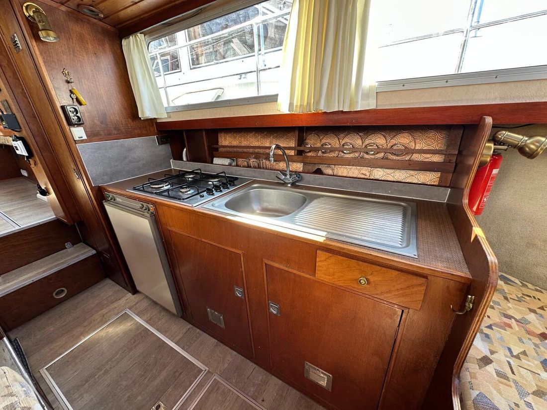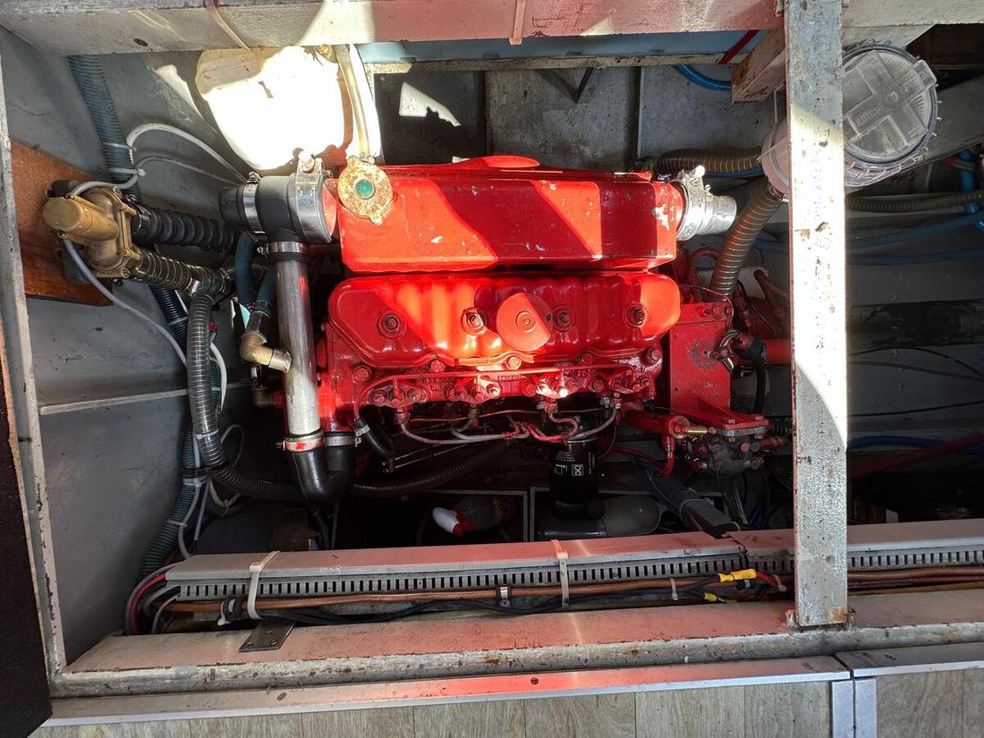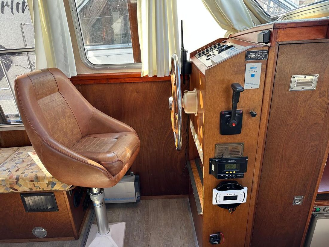 Motorisatie Aantal identieke motoren 1 Start type elektrisch Hoofdmotor Type binnenboord Merk Peugeot Model DTP50 Serienummer 3123957 Aantal cilinders 4 Vermogen 62 pk Urenteller Draaiuren 8355 Brandstof diesel Verbruik 3 liter/uur Aandrijving Overbrenging schroefas Voortstuwing schroef Koeling indirect Opmerkingen Koeling via warmtewisselaar Tank Brandstoftank aantal Aantal 1 Totale inhoud brandstoftank(s) 175 liter Materiaal brandstoftank staal Prestaties Max snelheid 14 liter Kruissnelheid 10 liter Meetinstrumenten motor Brandstoftankmeter Opmerkingen Brandstoftankmeter Peilglas Toerenteller Temperatuurmeter Elektriciteit Accu Opmerkingen Accu 1x start 125Ah 1x service 230Ah Aantal 2 Acculader Opmerkingen Acculader Waeco IU252A PerfectCharge Dynamo Walstroom Zonnepaneel Opmerkingen Zonnepaneel Solar30 regelaar 12V -