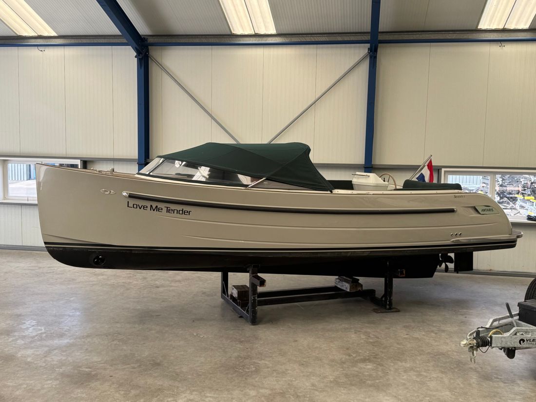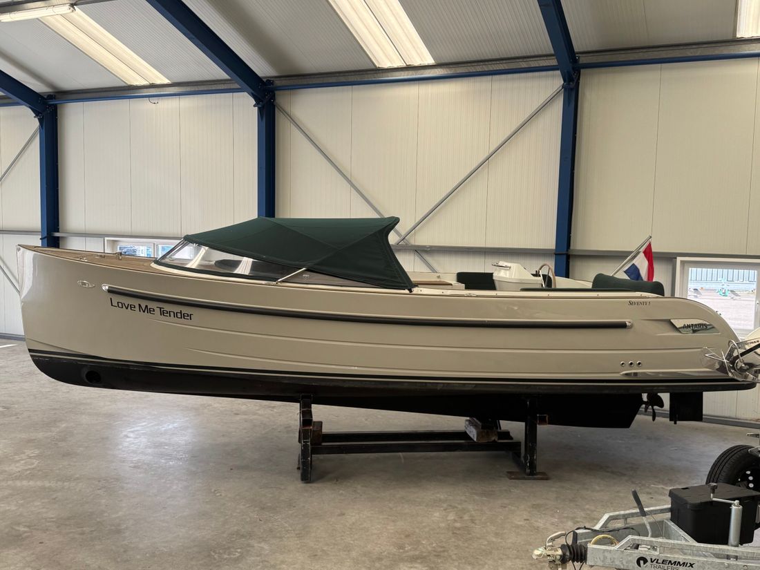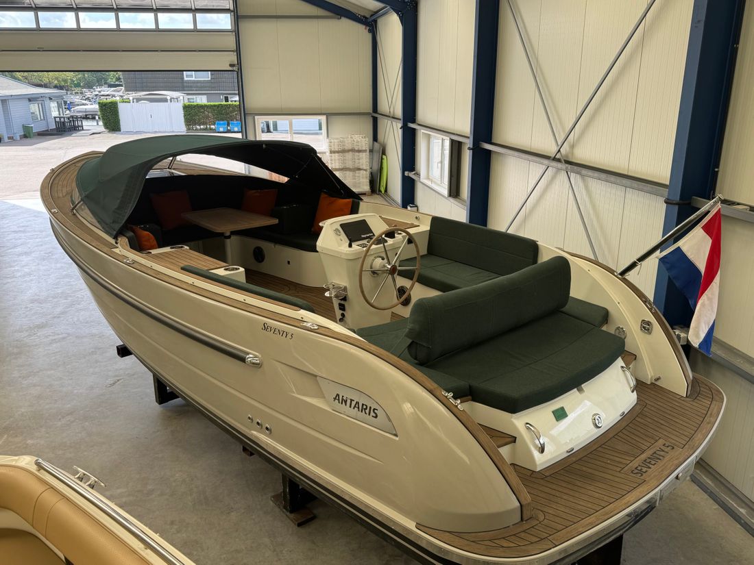 Antaris Seventy5 (modeljaar 2023) met een Elektrische aandrijving 15,0 kW met 39 kWh lithium-accupakket en lader, Synthetische teakvloer, Synthetisch teakdek, Synthetisch teak op toiletcabinedek naast de ingang en op de kuiprand, Synthetisch teak op de vloer in de toiletruimte, Synthetische teaktafel, Synthetisch teak in walnoot, Zonnebedkussens, Kussens op de achter treden, Boegschroef, Hydraulische besturing, Sportkap inclusief windscherm, Grote koelkast midscheeps, Waterdruksysteem en watertank, Wastafel en buitendouche incl. waterdruksysteem en watertank, Opbergkast met 2 laden (midscheeps), Elektrisch toilet inclusief vuilwatertank en dekafzuiging, Extra pomp voor het legen van de vuilwatertank, Roestvrijstalen handgreep op het achterschip, Roestvrijstalen anker, Roestvrijstalen zwemtrap geïntegreerd, Roestvrijstalen beschermstrip rondom het zwemplatform, Roestvrijstalen greep op het achterschip, Roestvrijstalen opklapbare kikkers (6 stuks) i.p.v. standaard kikkers, Roestvrijstalen bekerhouder (dubbel) op stuurconsole, Roestvrijstalen bekerhouders met LED-verlichting, Roestvrijstalen touwsnijring, Luxe JL audiosysteem met Bluetooth en 4 luidsprekers (Gunmetal), Raymarine Axiom 9 navigatie incl. fishfinderfunctie, NMEA2000-connectiviteit voor motor- of batterijgegevens met Axiom, Digitale koppeling Fusion audiosysteem (via NMEA) met de Axiom, Roerstandaanwijzer, 12 volt en USB-aansluiting, Elektrische aandrijving met 140 Ah AGM-serviceaccu met acculader, Scheepshoorn, Lederen stuurwiel, Armsteunkussen met 2 bekerhouders, Luxe stoffering, Dubbel gestikte kussens i.p.v. bies, Opberghoes, 2x Dimbare pop-up LED-lamp, LED-cockpitverlichting (6 stuks) wit, LED-verlichting op de treden van en naar het zwemplatform (wit), STAZO dek-slot 5 m ? geïntegreerd in voordek, Dieptemeter op Axiom (Nieuwprijs deze uitvoering ? 152.500,00 , dit schip vraagprijs ? 119.000.00) *Bemiddeling Verkoop. Verkoop is wegens vertrek buitenland.