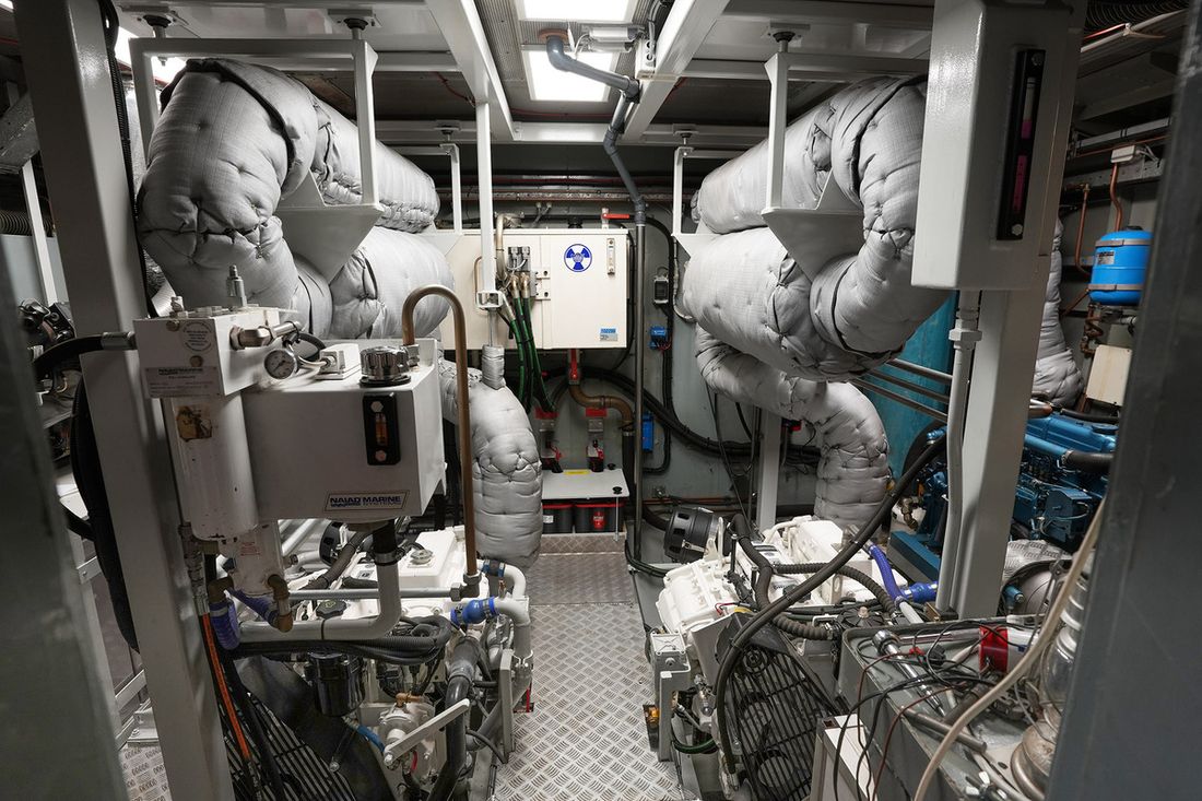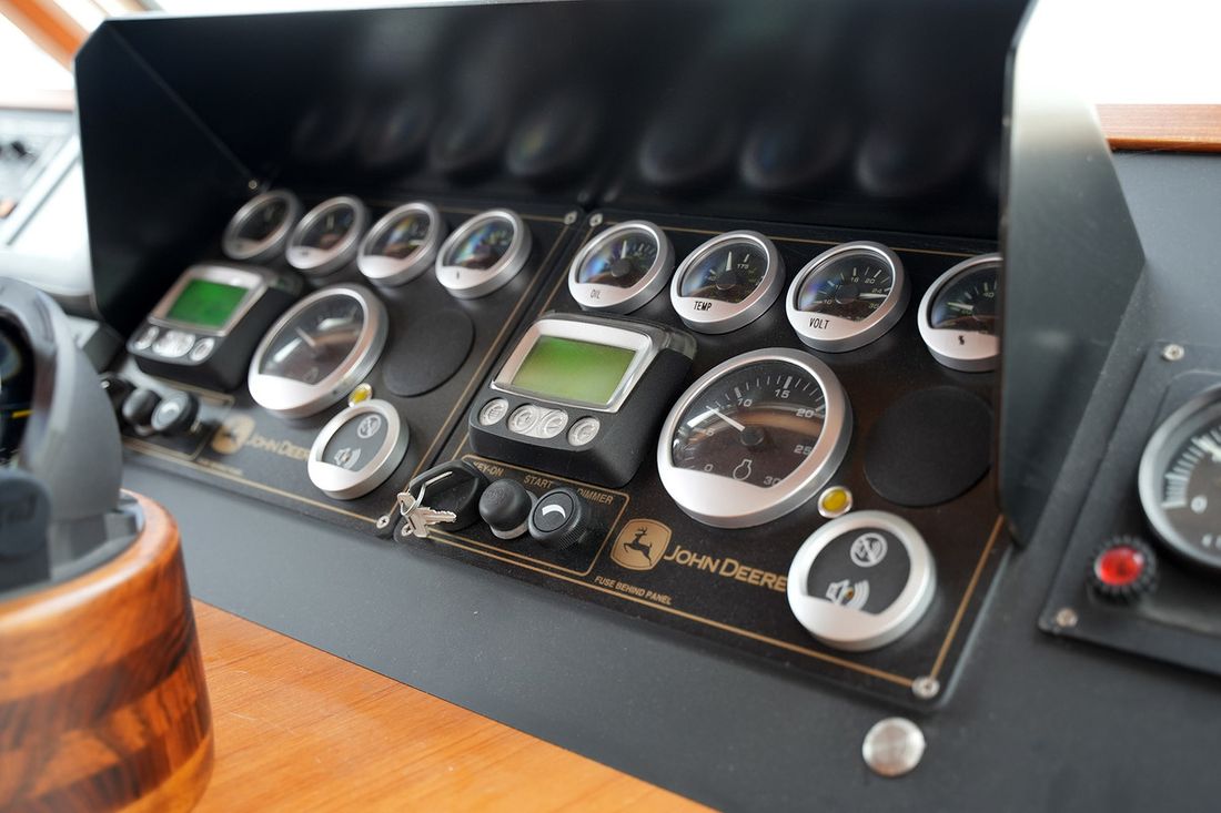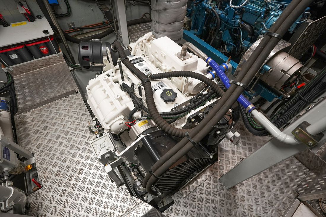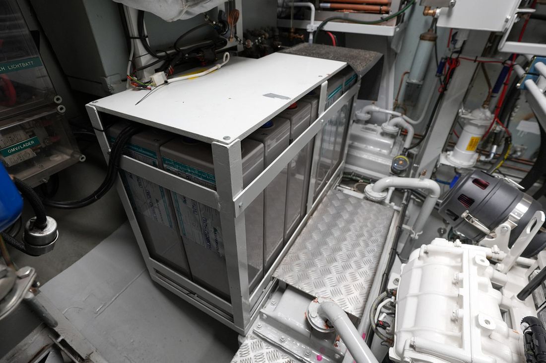Motorisatie Aantal identieke motoren 2 Start type elektrisch Hoofdmotor Type binnenboord Merk John Deere Model 4045 AFM85 Serienummer PE4045N003098 Bouwjaar 2018 Aantal cilinders 4 Vermogen 81 pk Urenteller Draaiuren 65 Brandstof diesel Merk keerkoppeling PRM VO21840 Motor 2 Type 2e motor binnenboord Merk van de 2e motor John Deere Model van de 2e motor 4045 AFM85 Serienummer van de 2e motor PE4045NN. 293 Bouwjaar van de 2e motor 2018 Aantal cilinders in de 2e motor 4 Vermogen van de 2e motor 81 pk Urenteller op de 2e motor Draaiuren van de 2e motor 65 Brandstof voor 2e motor diesel Start type 2e motor elektrisch Merk keerkoppeling motor PRM V021840 Aandrijving Overbrenging schroefas Voortstuwing schroef Opmerkingen Voortstuwing Oliebad schroefas met Aquadrive Koeling indirect Opmerkingen Koeling Beunkoeling voor de motoren met droge uitlaat Tank Brandstoftank aantal Meetinstrumenten motor Brandstoftankmeter Toerenteller Oliedrukmeter Temperatuurmeter Boeg- en hekschroef Boegschroef hydraulisch Losse afstandsbediening Hekschroef hydraulisch Losse afstandsbediening Elektriciteit Accu Opmerkingen Accu 4x Optima voor start Aantal 12 xAh per accu 748 Acculader Opmerkingen Acculader Mastervolt Capaciteit 100 Dynamo Accumonitor Generator Opmerkingen Generator 2e generator Perkins 4 cal met PTO voor hydrauliek en extra dynamo Capaciteit 10 Merk generator Fisher Panda 220/380V Omvormer Opmerkingen Omvormer Mastervolt Capaciteit 4000 Voltmeter Walstroom Opmerkingen Walstroom 2x met scheidingstrafo Walstroomkabel 24V 220V -