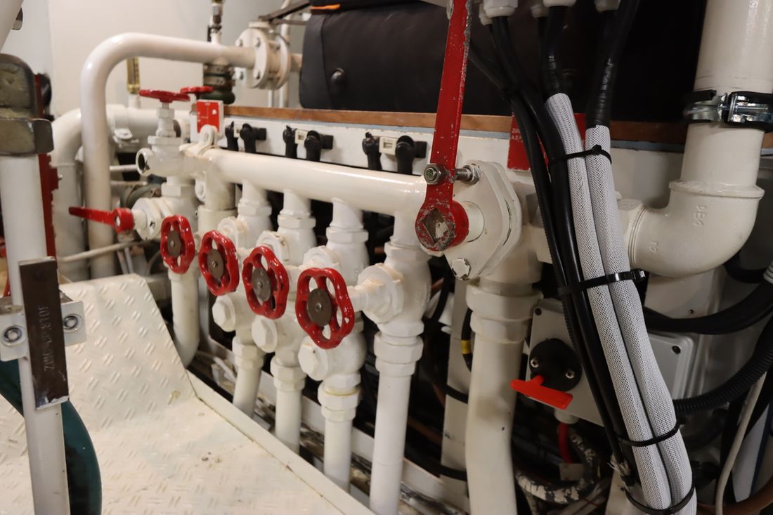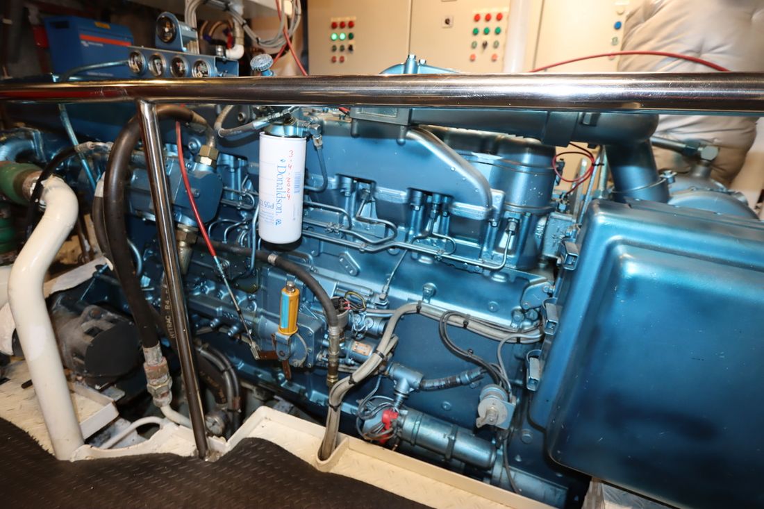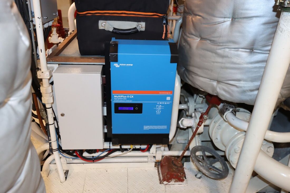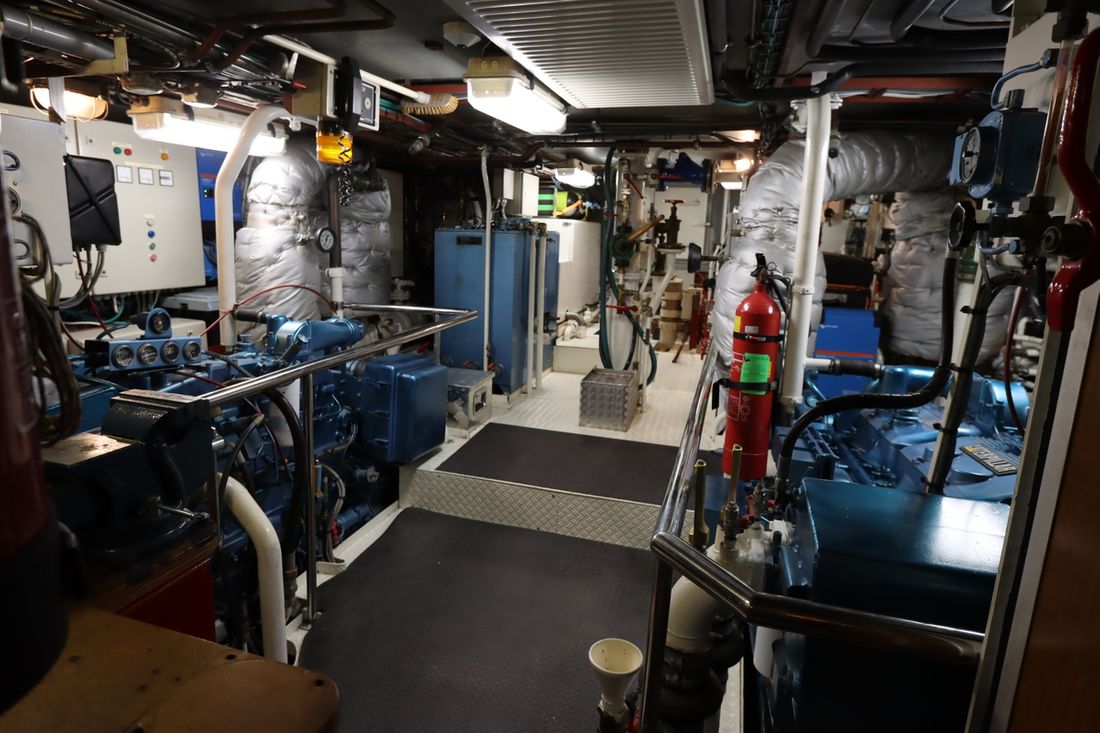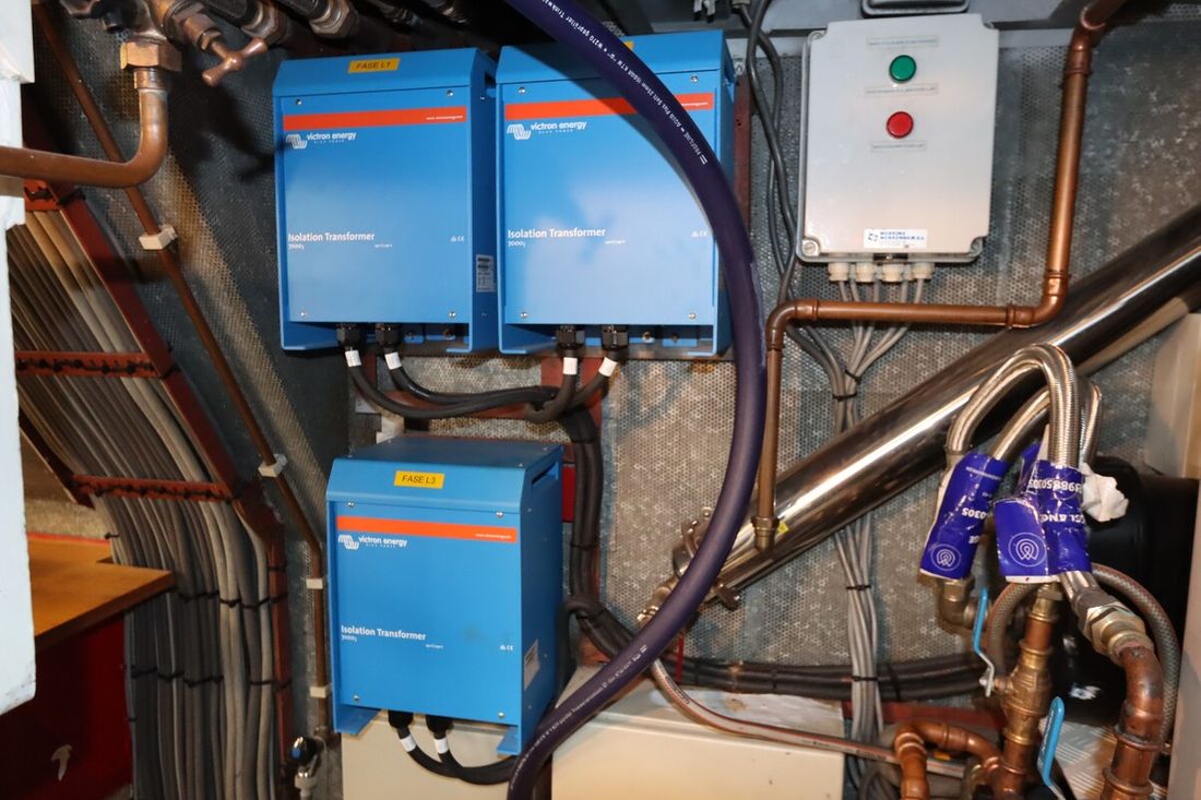 Motorisatie Aantal identieke motoren 2 Start type elektrisch Hoofdmotor Type binnenboord Merk Caterpillar Model 3406 B Bouwjaar 1992 Aantal cilinders 6 Vermogen 300 pk Urenteller Draaiuren 2550 Brandstof diesel Merk keerkoppeling Twin Disc MG5111, hydraulisch Motor 2 Type 2e motor binnenboord Merk van de 2e motor Caterpillar Model van de 2e motor 3406 B Bouwjaar van de 2e motor 1992 Aantal cilinders in de 2e motor 6 Vermogen van de 2e motor 300 pk Urenteller op de 2e motor Draaiuren van de 2e motor 2550 Brandstof voor 2e motor diesel Start type 2e motor elektrisch Merk keerkoppeling motor Twin Disc MG5111, hydraulisch Aandrijving Overbrenging schroefas Voortstuwing schroef Koeling indirect Tank Brandstoftank aantal Aantal 2 Totale inhoud brandstoftank(s) 11580 liter Materiaal brandstoftank staal Meetinstrumenten motor Brandstoftankmeter Toerenteller Oliedrukmeter Temperatuurmeter Boeg- en hekschroef Boegschroef hydraulisch Opmerkingen Boegschroef 30pk Losse afstandsbediening Hekschroef elektrisch Opmerkingen Hekschroef 30 pk Losse afstandsbediening Elektriciteit Accu Opmerkingen Accu 18 AGM 200Ah, service, 1x200Ah back up batteries Aantal 19 Acculader Opmerkingen Acculader 2x Victron Multiplus II 24/3000/70 vervangen in 2021-2023 Capaciteit 140 Dynamo Accumonitor Generator Opmerkingen Generator 1x Onan 25 marine genset 25MDL6-Z 1x Onan 12 marine genset 12MDL3-M Merk generator Onan Omvormer Opmerkingen Omvormer 2x 3000 Voltmeter Walstroom Walstroomkabel 24V 220V -