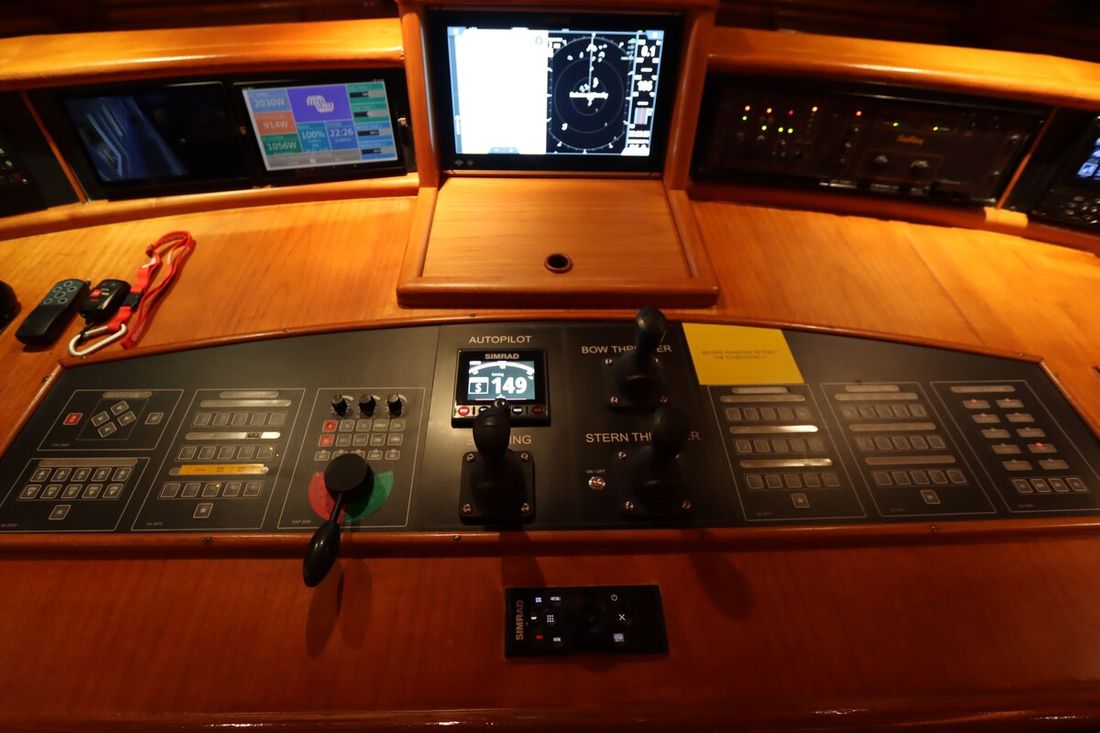 Basishulpmiddelen Kompas Merk kompas Sylva type 100 Log/snelheid Merk log/snelheid Radio Holland Dieptemeter Merk dieptemeter Radio Holland ES 200 Windmeter Opmerkingen Windmeter top unit gebroken Merk windmeter Radio Holland WM200 Navigatieverlichting Roerstandaanwijzer Opmerkingen Roerstandaanwijzer Radio Holland ROT2000 Curve indicator Merk Roerstandaanwijzer Radio Holland RI2000 Moderne elektronica Autopilot Opmerkingen Autopilot Radio Holland DAP2000 met Autopilot, Riverpilot end Joystick, Simrad Autopilot AP44 + BT1 afstandsbediening GPS Kaartplotter Radar Merk radar Lowrance Halo, 24 mijl Merk AIS Class A Em-Trat A200 AIS Communicatie Marifoon Merk marifoon Sailor Weatherfax/Navtex Merk Weatherfax/Navtex WX series Weather station -