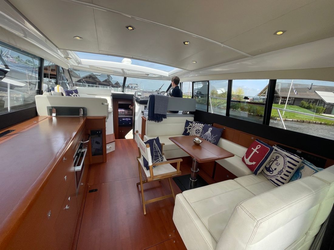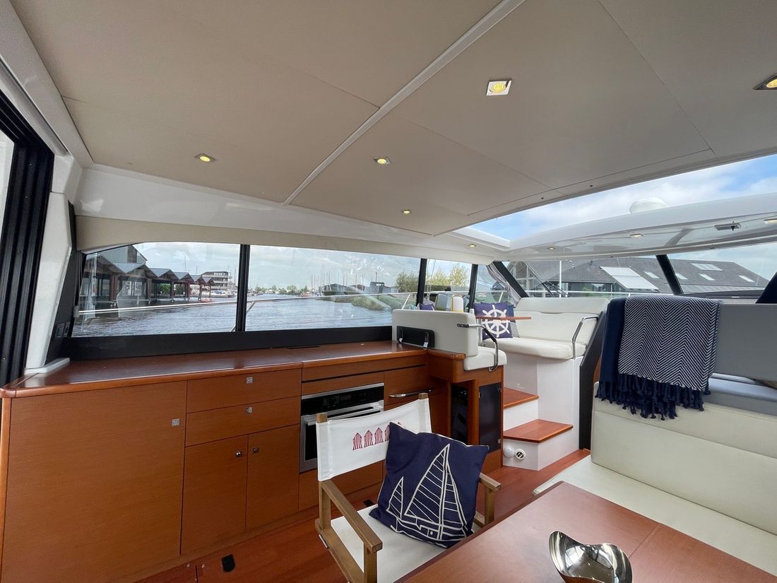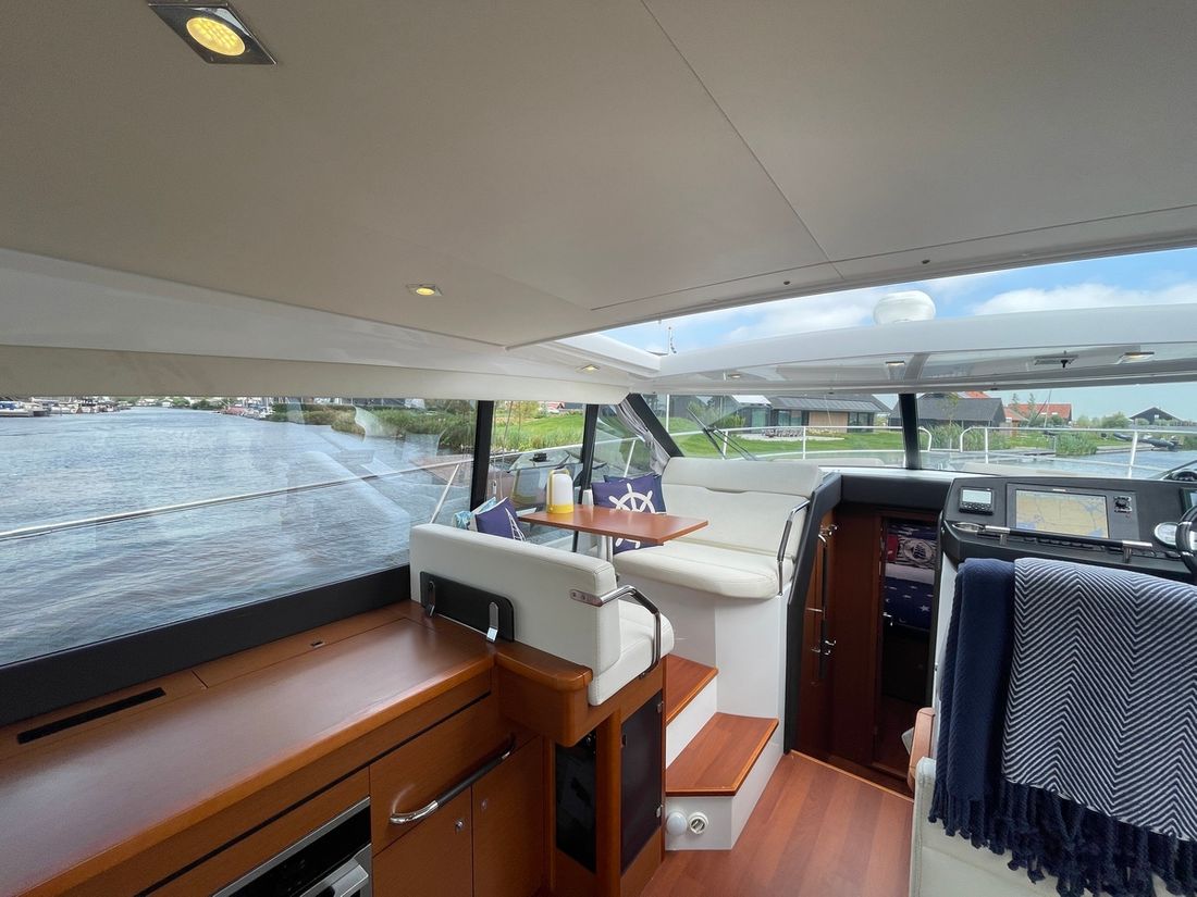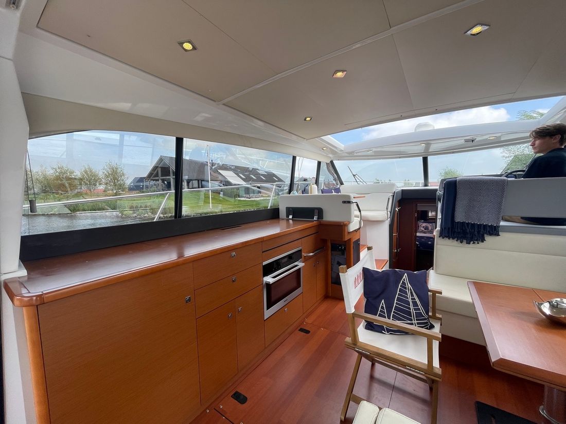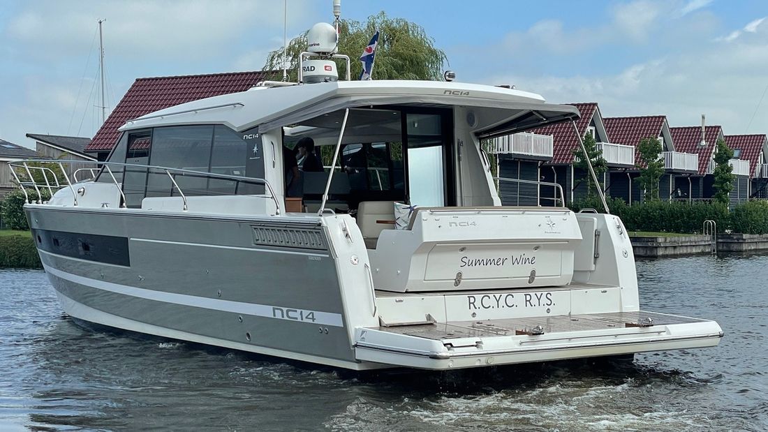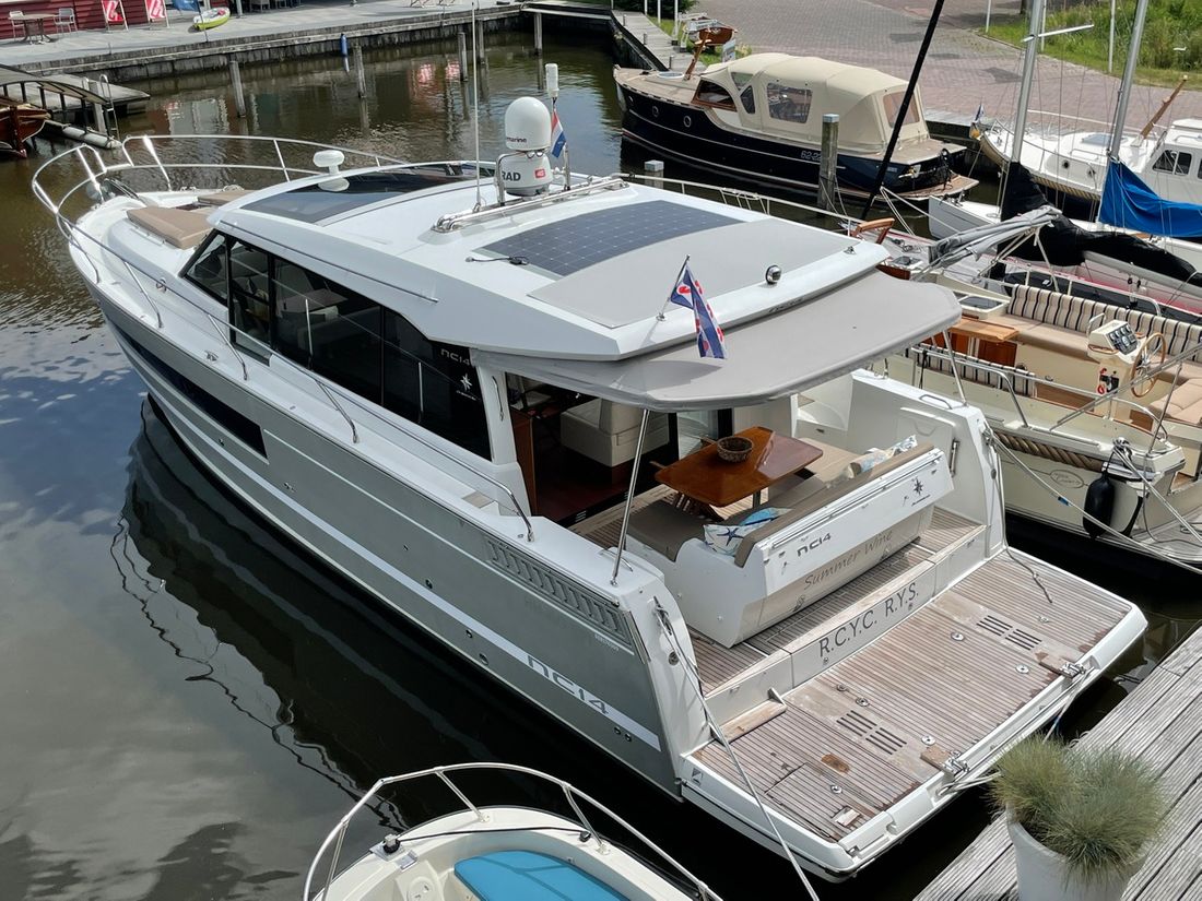 Deze zeer royale Jeanneau NC14 uit 2014 (te water 2016) is van alle gemakken voorzien en verkeert in zeer goede staat van onderhoud. De boot beschikt over een ruime open kuip met veel zitgelegenheid welke kan worden afgesloten door middel van een nieuwe tent. Via de volledig te openen schuifdeuren komt u in de salon met aan bakboord de kombuis. Deze is uitgerust met een elektrische kookplaat, koelkast, spoelbak, etc. De salon vorm een geheel met het stuurhuis en voelt zeer licht en ruim aan. Het grote dakluik kan elektrisch worden opengeschoven en aan de zijkant bevindt zich een deur naar het gangboord.