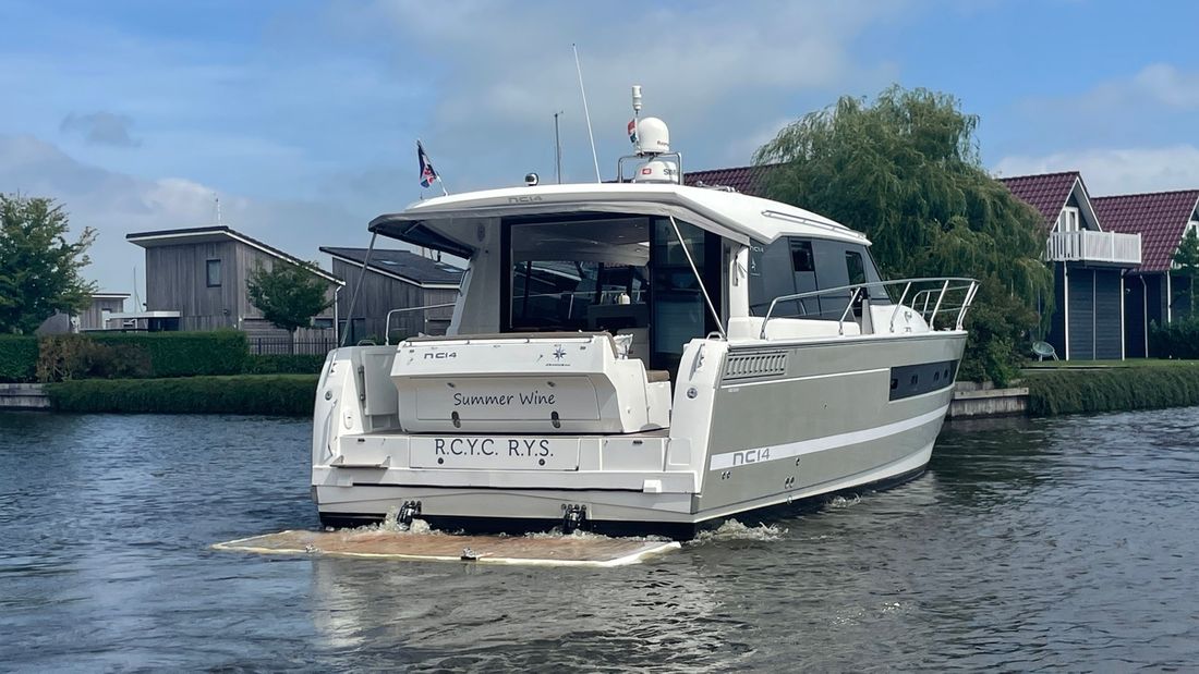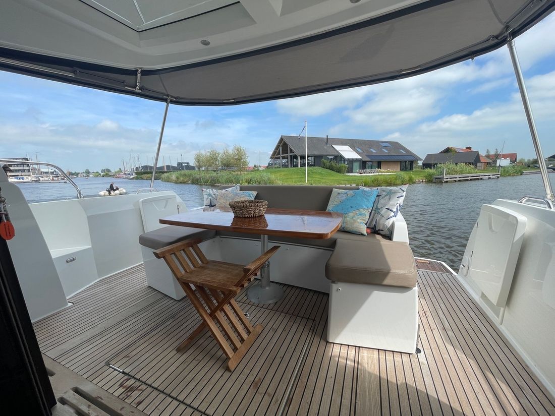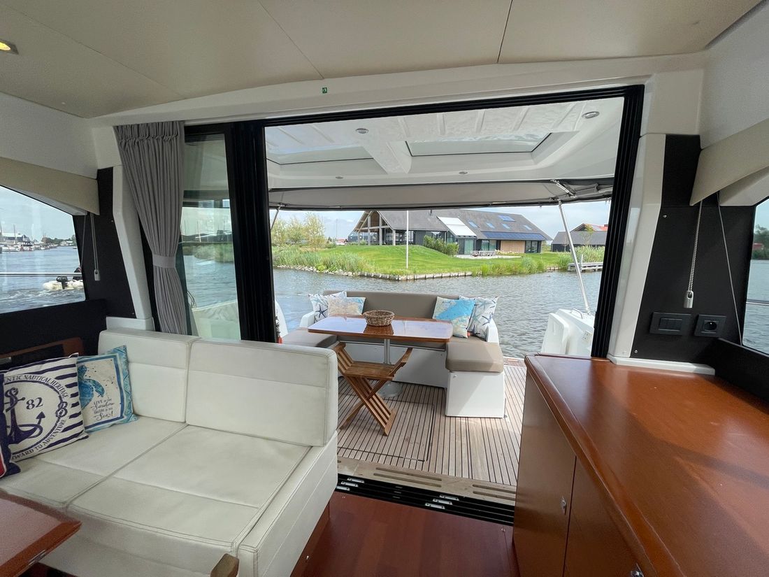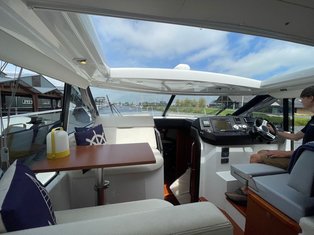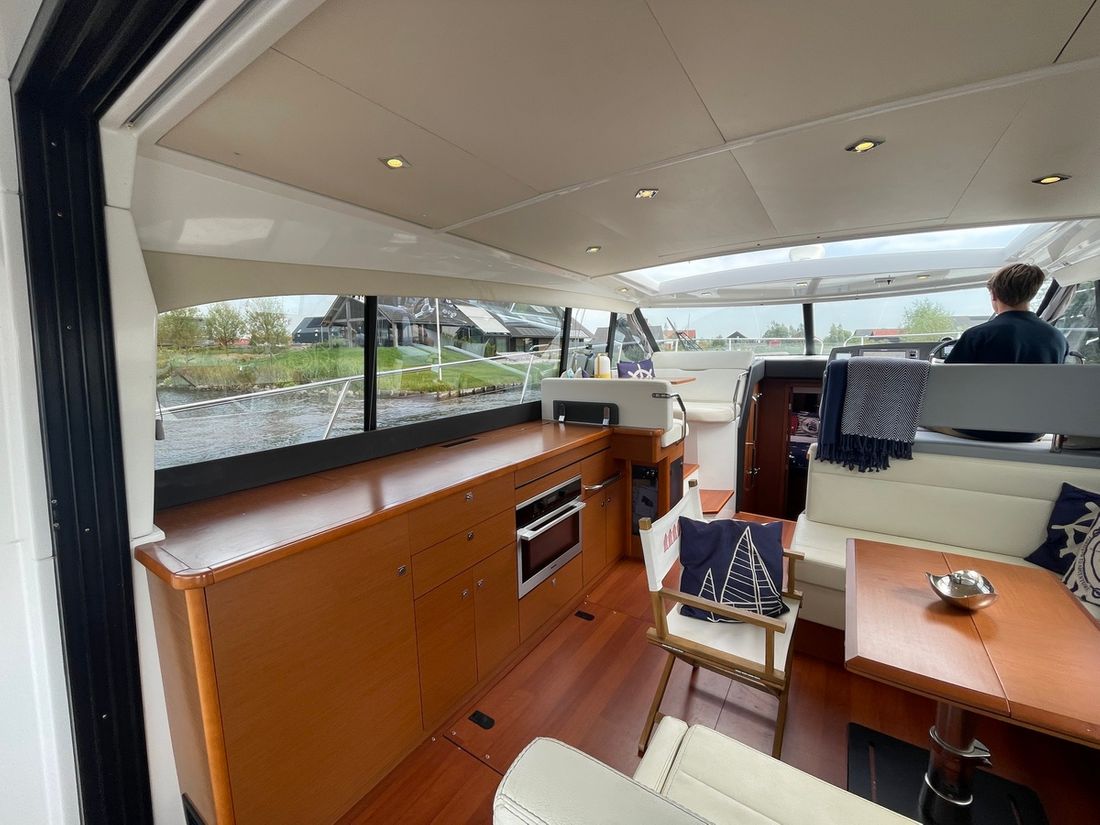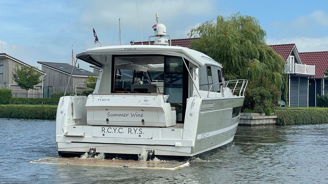 Deze zeer royale Jeanneau NC14 uit 2014 (te water 2016) is van alle gemakken voorzien en verkeert in zeer goede staat van onderhoud. De boot beschikt over een ruime open kuip met veel zitgelegenheid welke kan worden afgesloten door middel van een nieuwe tent. Via de volledig te openen schuifdeuren komt u in de salon met aan bakboord de kombuis. Deze is uitgerust met een elektrische kookplaat, koelkast, spoelbak, etc. De salon vorm een geheel met het stuurhuis en voelt zeer licht en ruim aan. Het grote dakluik kan elektrisch worden opengeschoven en aan de zijkant bevindt zich een deur naar het gangboord.