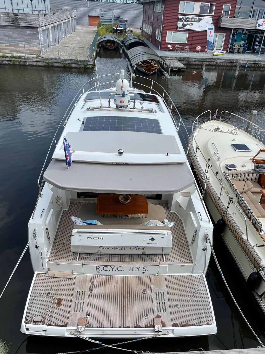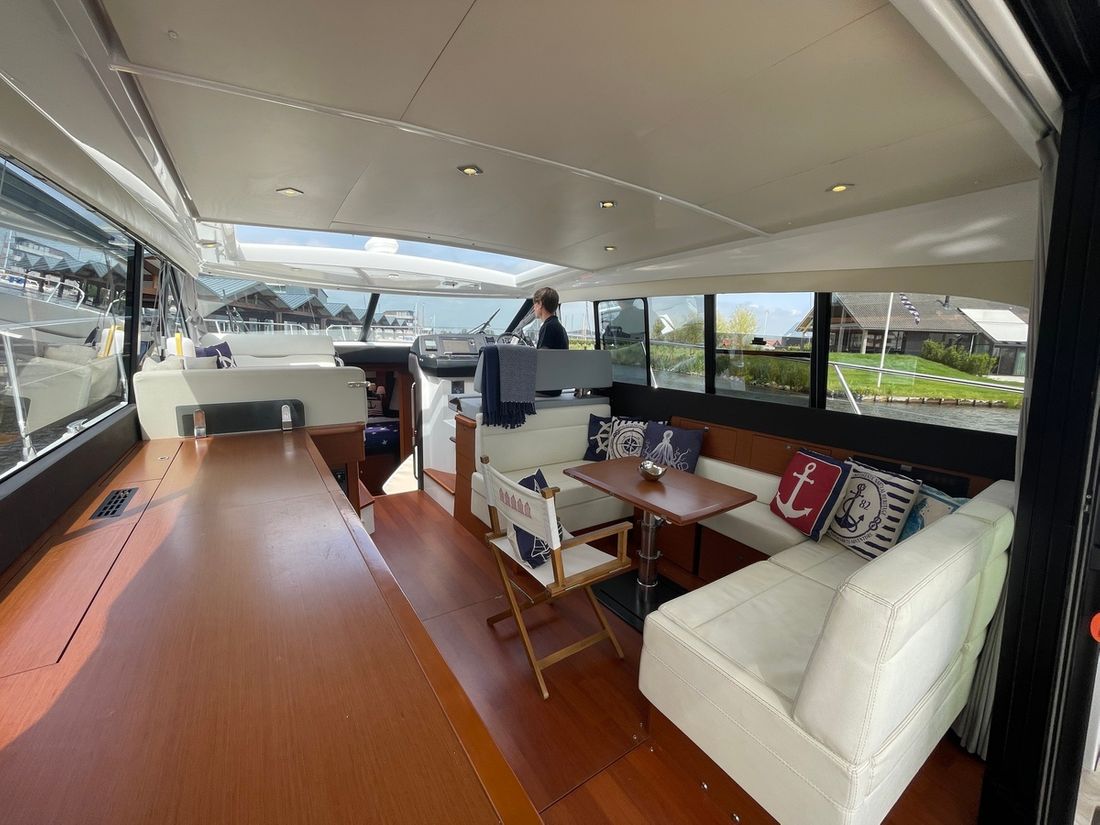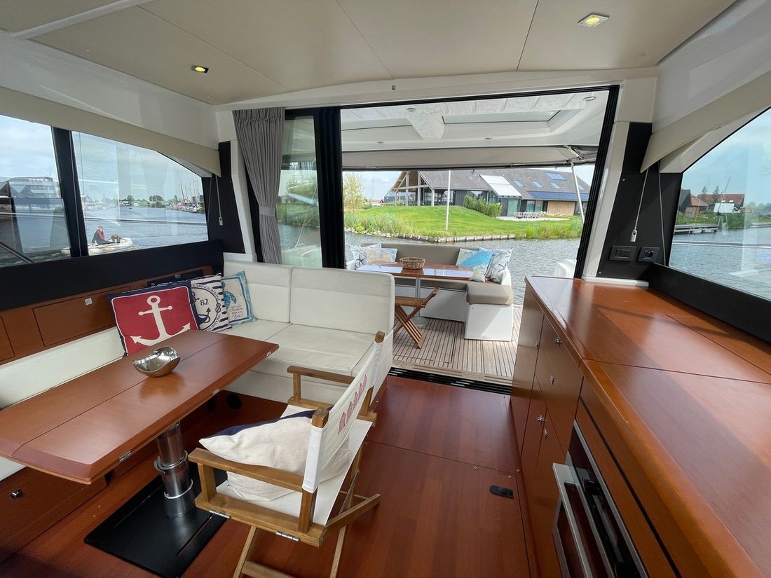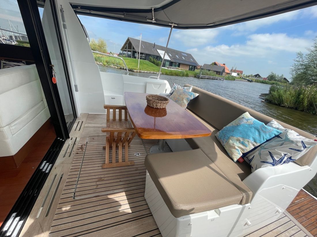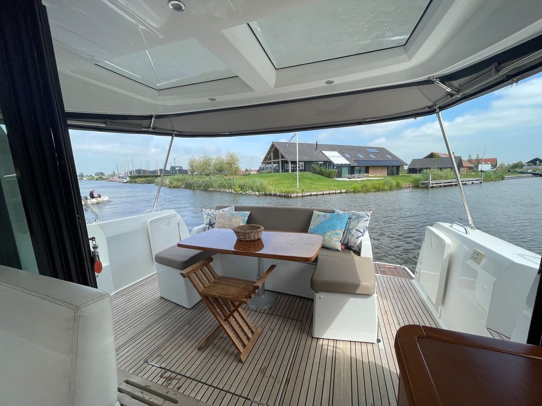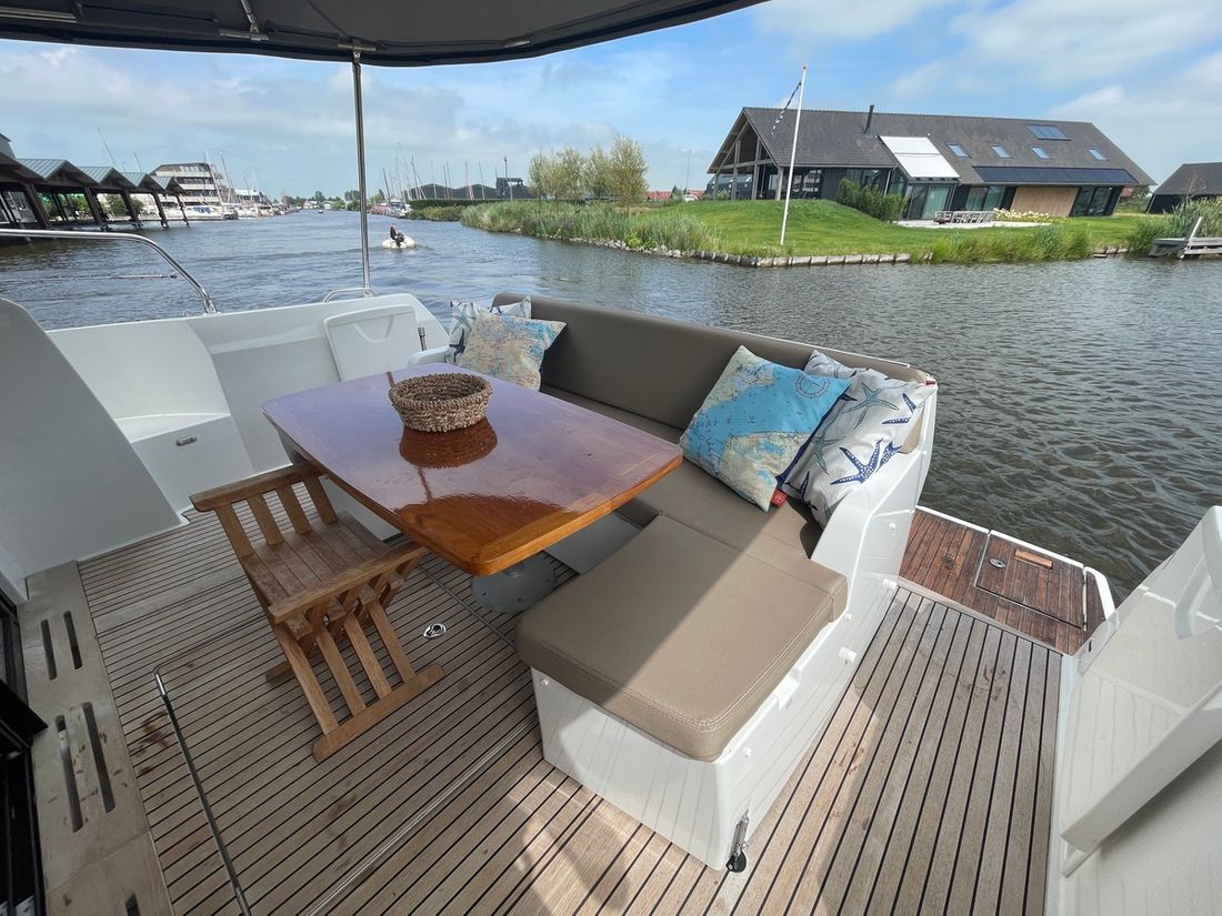 Deze zeer royale Jeanneau NC14 uit 2014 (te water 2016) is van alle gemakken voorzien en verkeert in zeer goede staat van onderhoud. De boot beschikt over een ruime open kuip met veel zitgelegenheid welke kan worden afgesloten door middel van een nieuwe tent. Via de volledig te openen schuifdeuren komt u in de salon met aan bakboord de kombuis. Deze is uitgerust met een elektrische kookplaat, koelkast, spoelbak, etc. De salon vorm een geheel met het stuurhuis en voelt zeer licht en ruim aan. Het grote dakluik kan elektrisch worden opengeschoven en aan de zijkant bevindt zich een deur naar het gangboord.