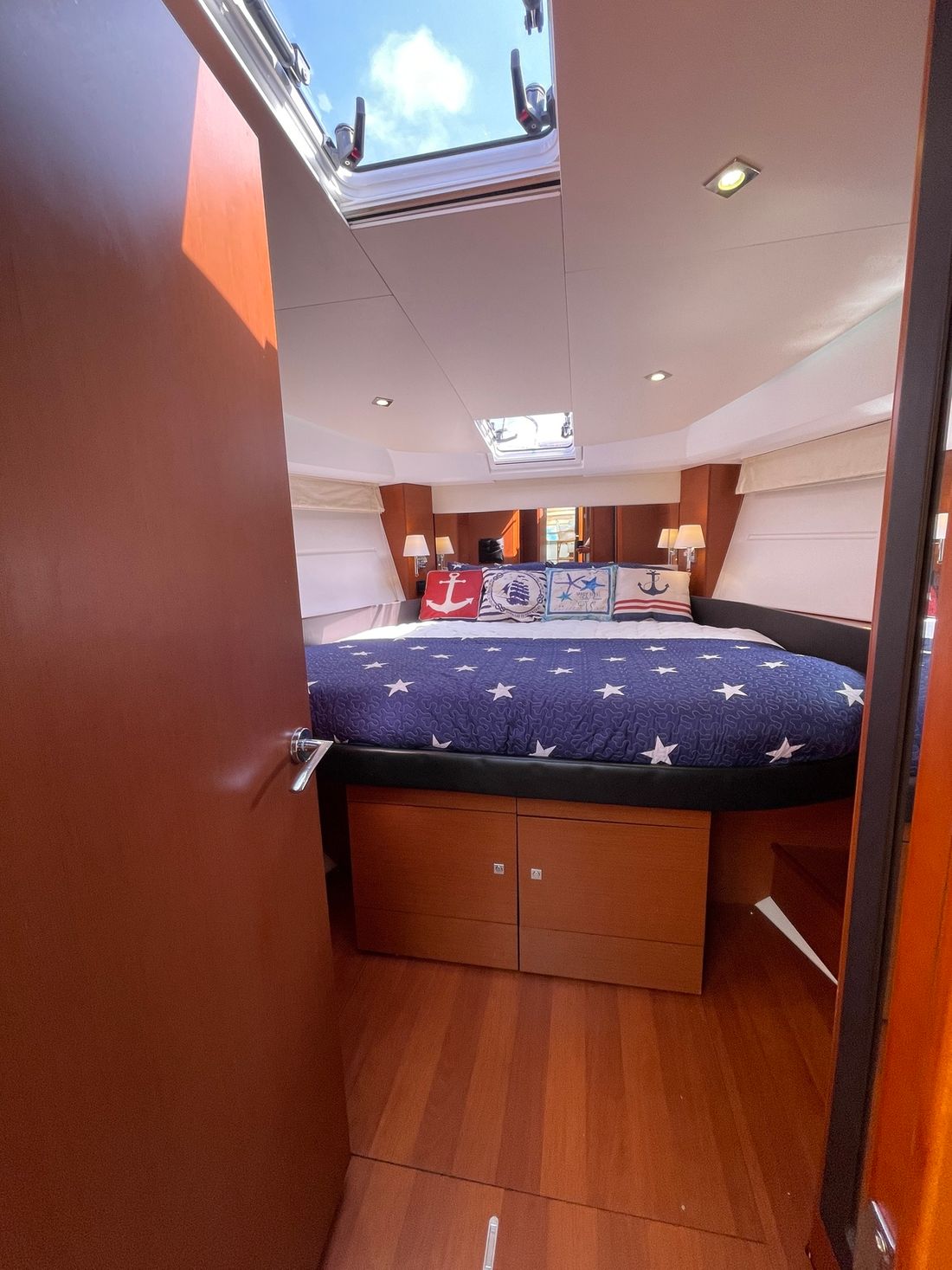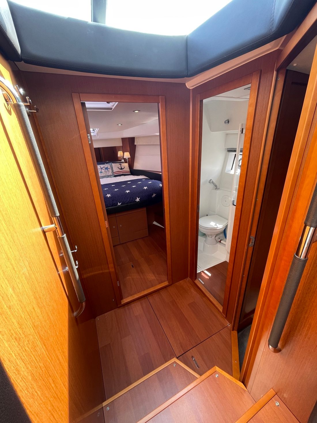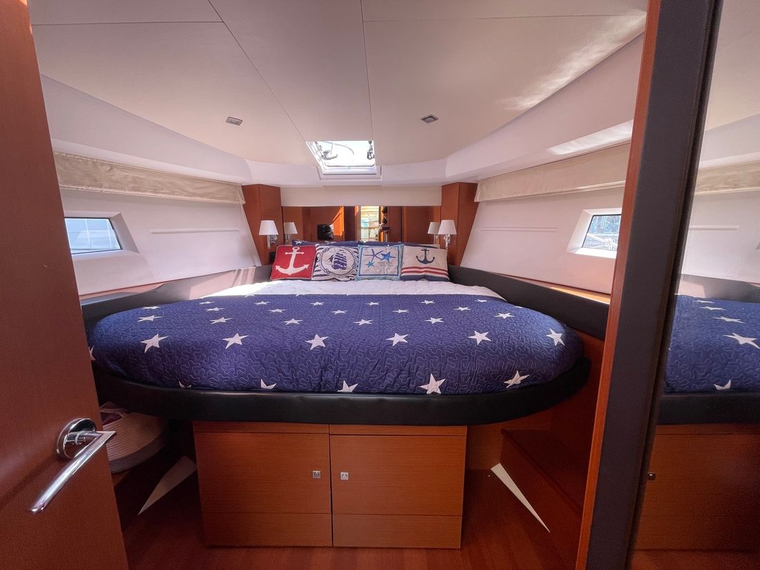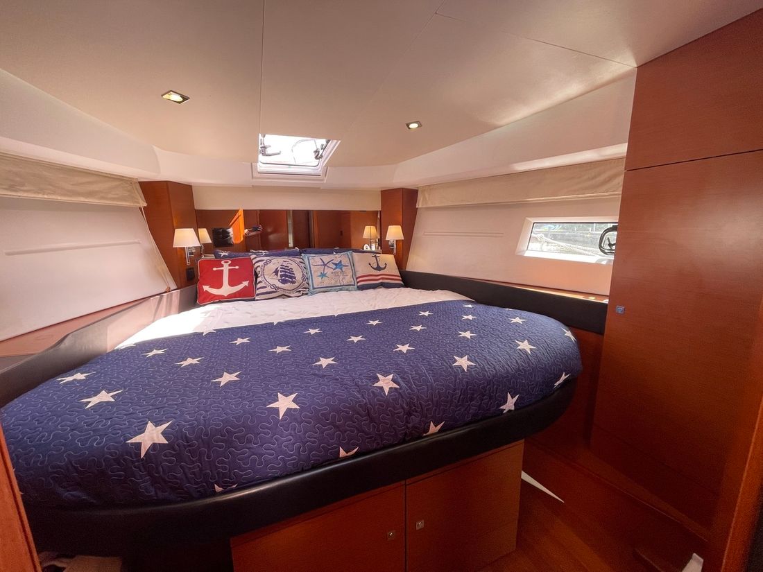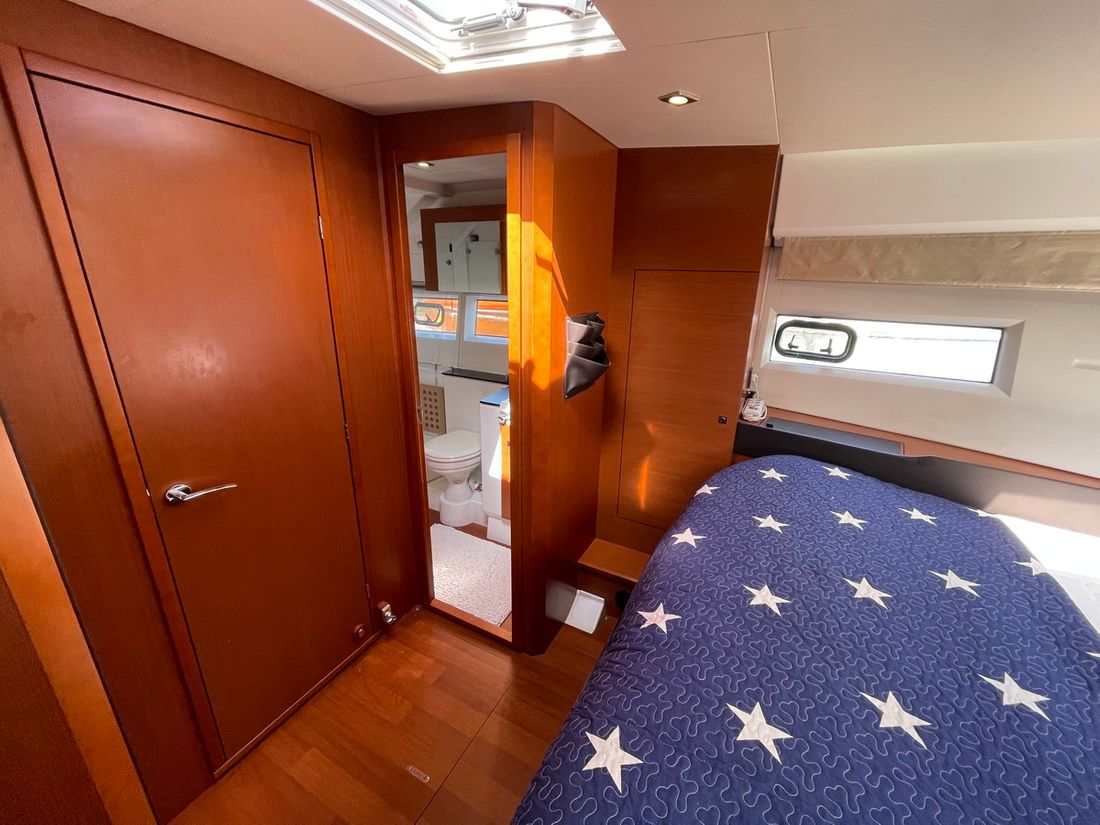 Verder naar voren bevindt zich een gastenhut met twee losse bedden en een directe deur naar de natte cel. Deze is ook te bereiken vanuit het halletje. Deze natte cel beschikt over een wasbak, elektrisch toilet en een douche. De kapiteinshut is voorzien van een riant tweepersoons bed en veel opbergmogelijkheden. Ook beschikt de kapiteinshut over een eigen, ruime natte cel met een wasbak, douche en elektrisch toilet.