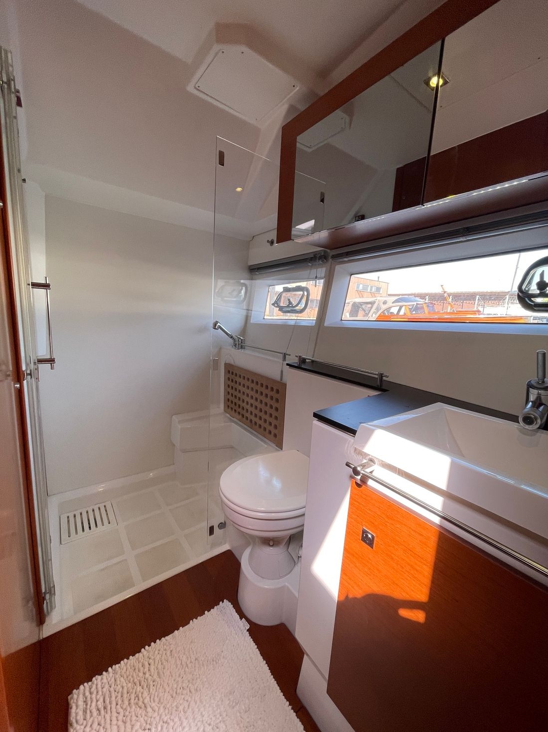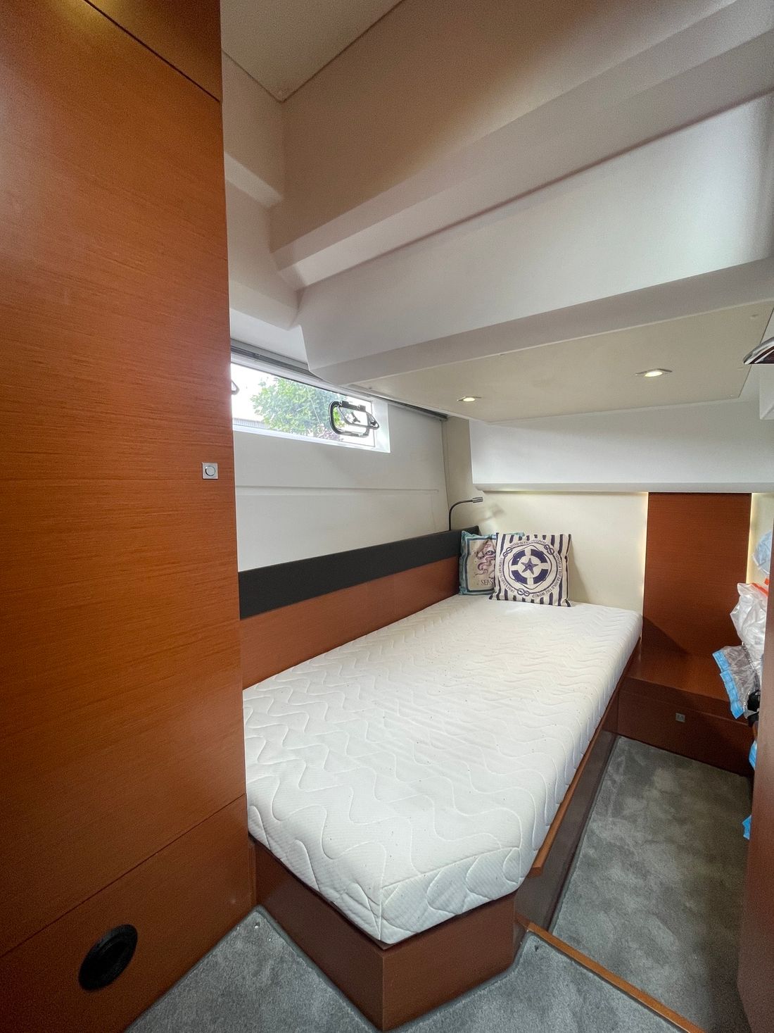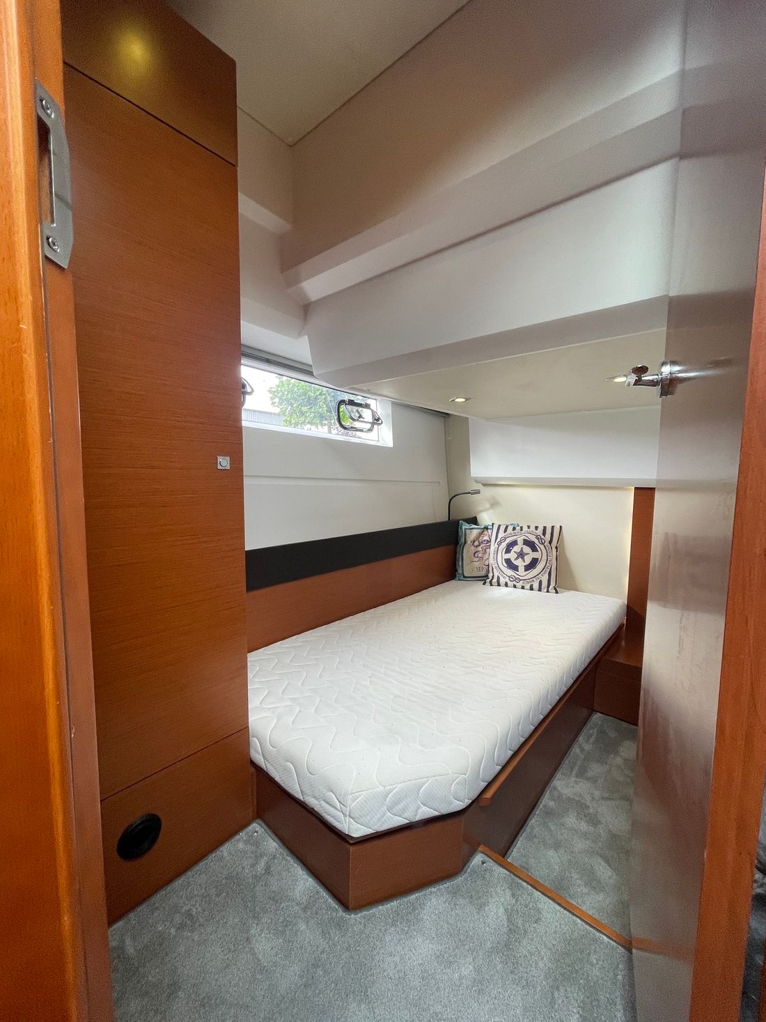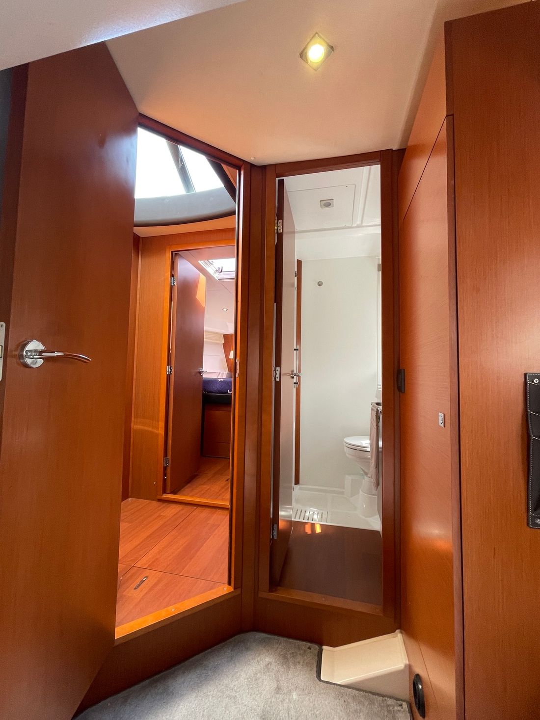 Verder naar voren bevindt zich een gastenhut met twee losse bedden en een directe deur naar de natte cel. Deze is ook te bereiken vanuit het halletje. Deze natte cel beschikt over een wasbak, elektrisch toilet en een douche. De kapiteinshut is voorzien van een riant tweepersoons bed en veel opbergmogelijkheden. Ook beschikt de kapiteinshut over een eigen, ruime natte cel met een wasbak, douche en elektrisch toilet.