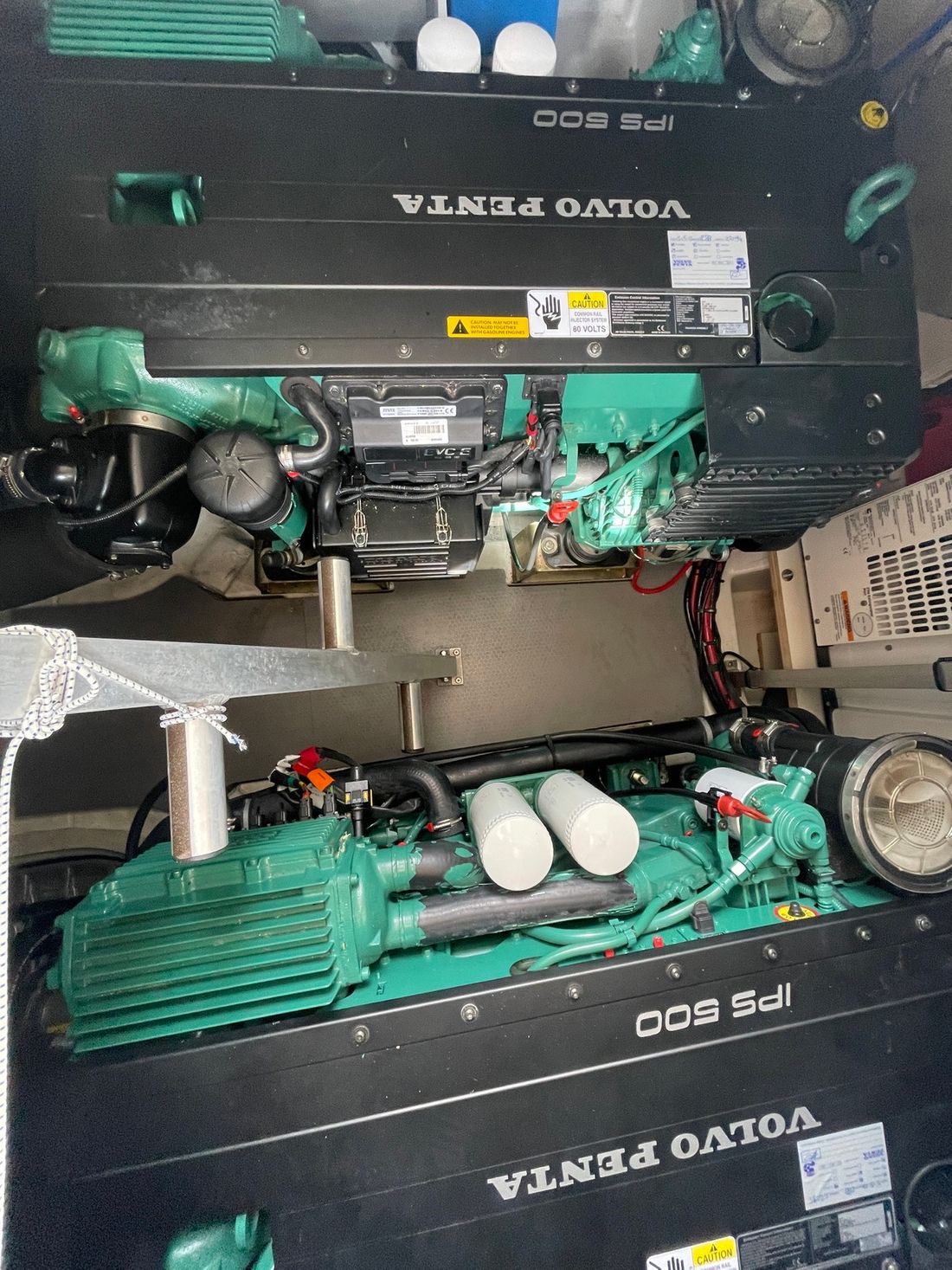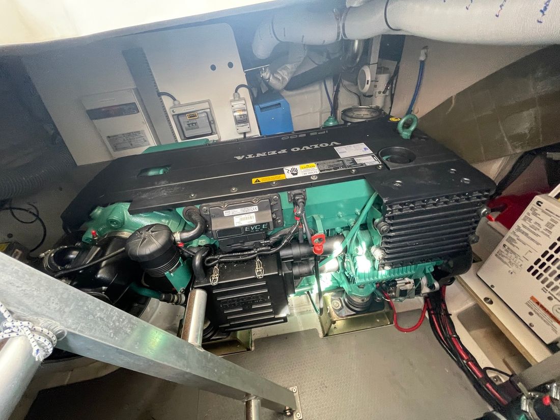 Motorisatie Aantal identieke motoren 2 Opmerkingen Aantal identieke motoren Volvo Penta IPS Start type elektrisch Hoofdmotor Type binnenboord Merk Volvo Penta Model IPS 500 Bouwjaar 2014 Aantal cilinders 6 Vermogen 370 pk Urenteller Draaiuren 391 Brandstof diesel Motor 2 Type 2e motor binnenboord Merk van de 2e motor Volvo Penta Model van de 2e motor IPS 500 Bouwjaar van de 2e motor 2014 Aantal cilinders in de 2e motor 6 Vermogen van de 2e motor 370 pk Urenteller op de 2e motor Draaiuren van de 2e motor 391 Brandstof voor 2e motor diesel Start type 2e motor elektrisch Aandrijving Overbrenging hekdrive Voortstuwing schroef Opmerkingen Voortstuwing IPS system Koeling indirect Tank Brandstoftank aantal Aantal 2 Totale inhoud brandstoftank(s) 450 liter Prestaties Max snelheid 30 knopen Meetinstrumenten motor Brandstoftankmeter Toerenteller Oliedrukmeter Temperatuurmeter Boeg- en hekschroef Boegschroef elektrisch Elektriciteit Accu Acculader Accumonitor Generator Opmerkingen Generator 200V/ 50HZ Capaciteit 11 Omvormer Voltmeter Walstroom Walstroomkabel Zonnepaneel 12V 220V -