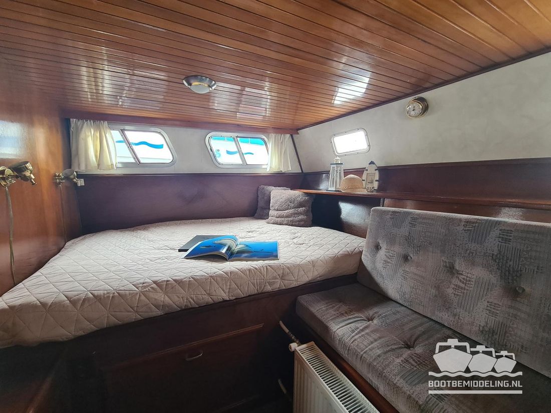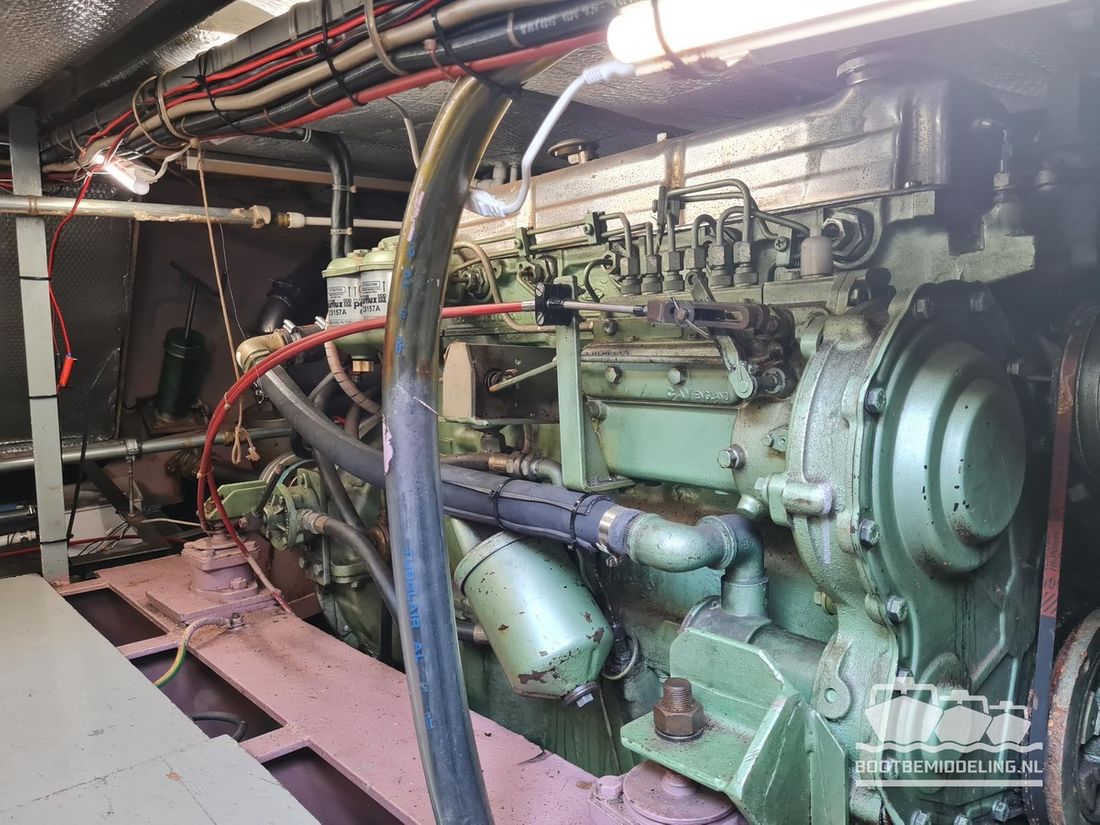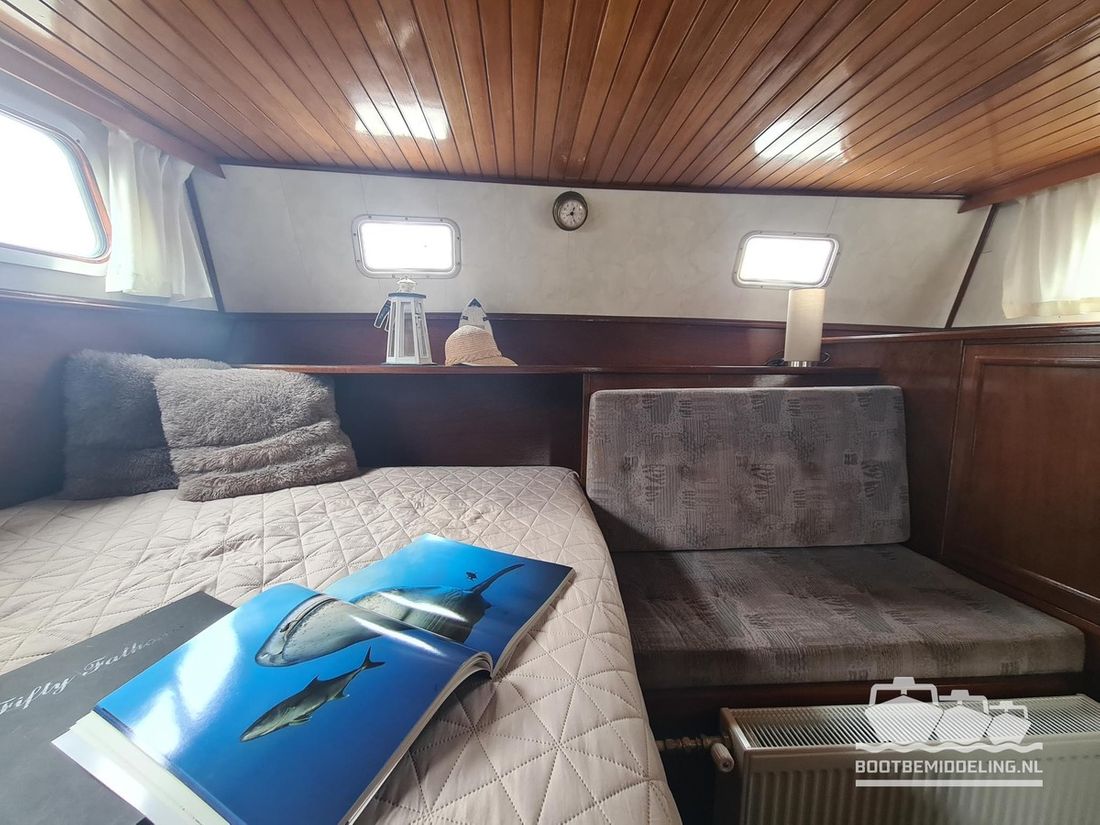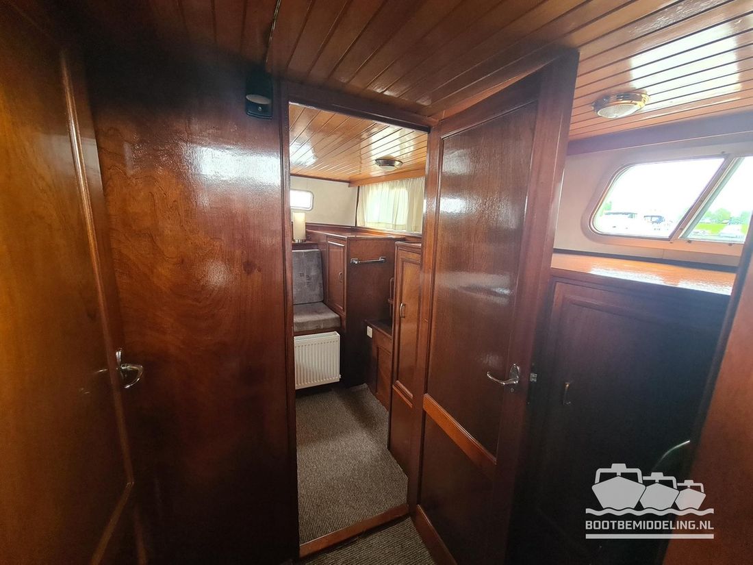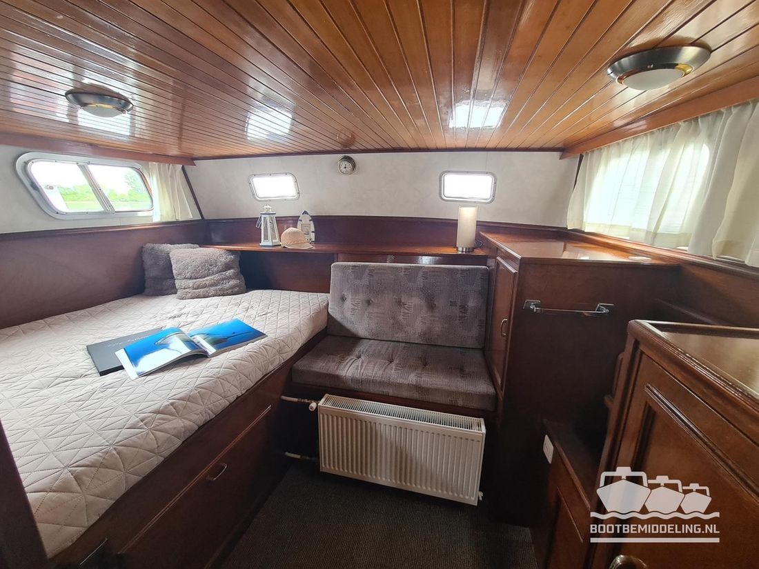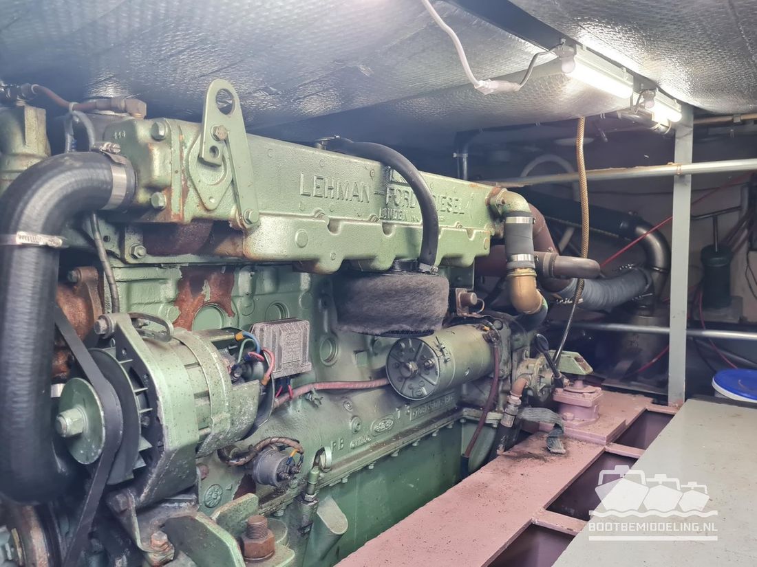 Deze door Holterman & De Vries gebouwde Blauwe Hand Kruiser ademt al direct bij het aan boord stappen degelijkheid uit. Het schip is uitzonderlijk robuust gebouwd en heeft een interieur dat boven menig leeftijdsgenoten uitsteekt. Tal van lades en kasten, ronde vormen en de juiste verhoudingen kenmerken de bouw door een uitstekende scheepswerf en dat is exact wat u aantreft in dit schip. Deze kenmerken vormen een goede basis voor een langdurig verblijf aan boord of permanente bewoning. De laatste jaren zijn veel vernieuwingen gedaan, zoals de installatie van een Kabola 400 HR combi, een 3500 kWh dak-airco en nieuwe matrassen. Daarnaast is ook de gas installatie verwijderd en vervangen door een 1 fase Siemens elektrische kookplaat. Een omvormer, een generator en een groot accupakket ontbreken uiteraard ook niet. Gelijktijdig met het vernieuwen van de antifouling + anodes, zijn ook de vetkoorden vernieuwd, zijn alle standpijpen vervangen door huiddoorvoeren met kogelkranen en tot slot zijn in de bilge voorin + achterin 2 hoogwateralarmen geïnstalleerd. In de geordende motorkamer vindt u twee goed onderhouden Ford Lehman motoren van 120 pk per stuk, voorzien van bun koeling. De uitlaten zijn vernieuwd en watergekoeld gemaakt. Dit schip is instap klaar en biedt u alle comfort tijdens lange reizen of bewoning.