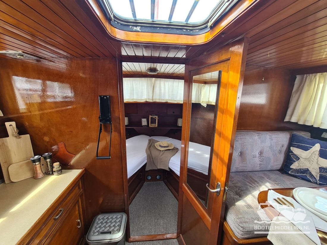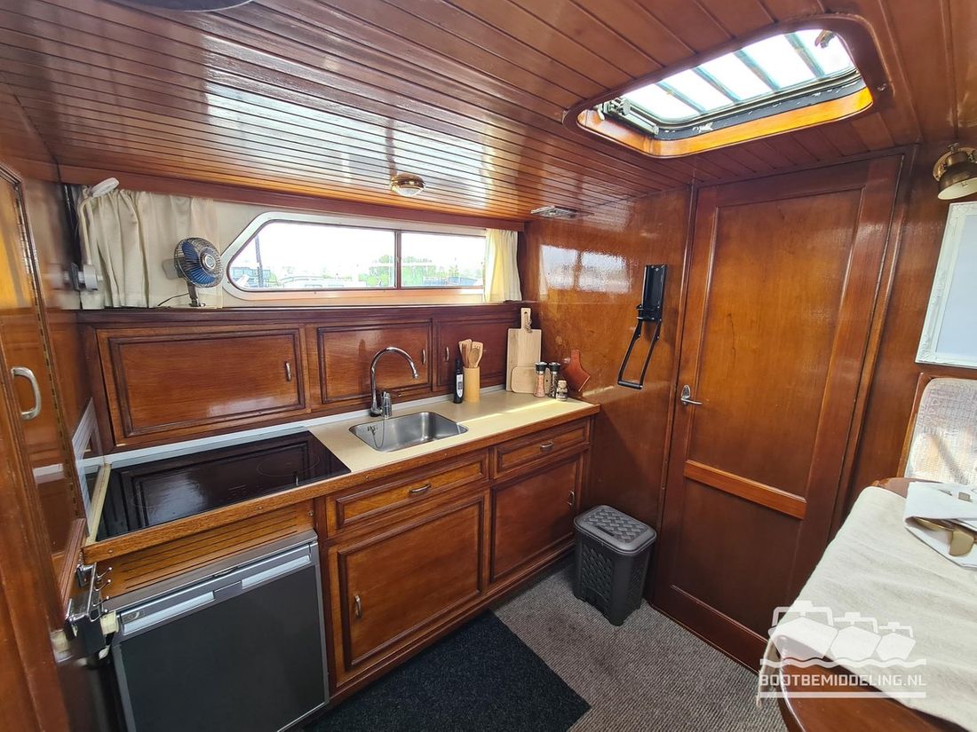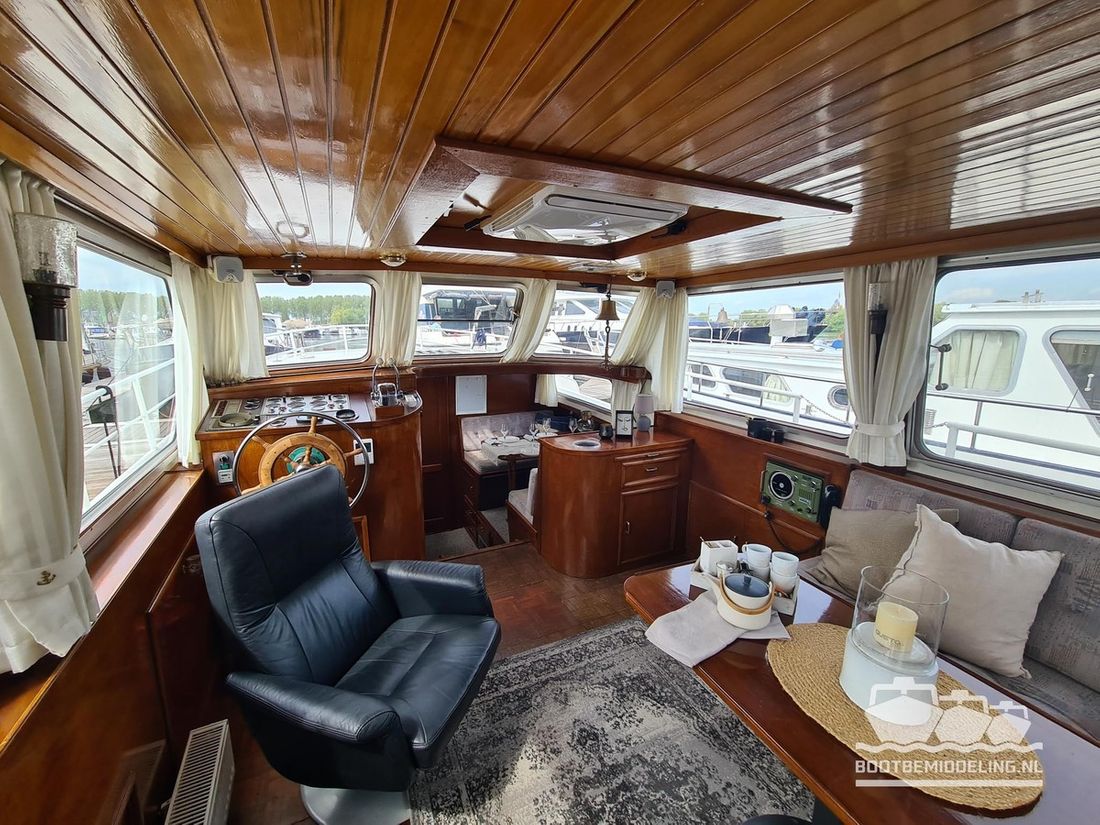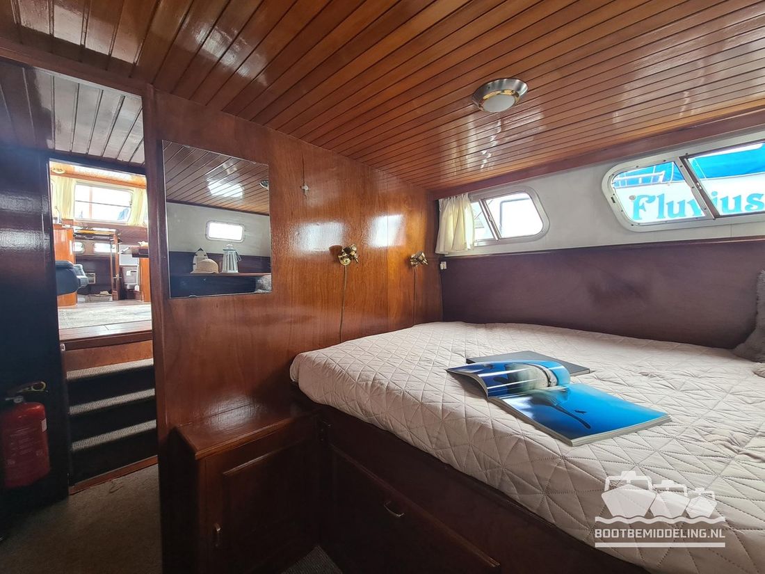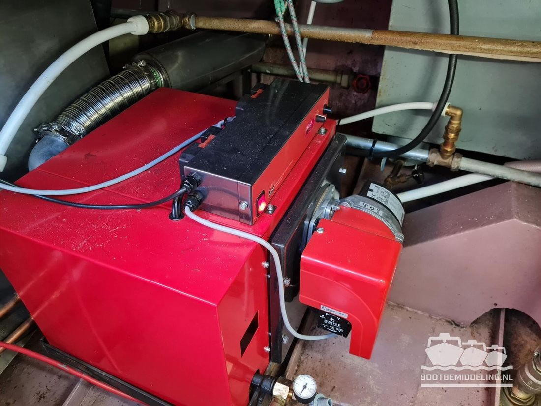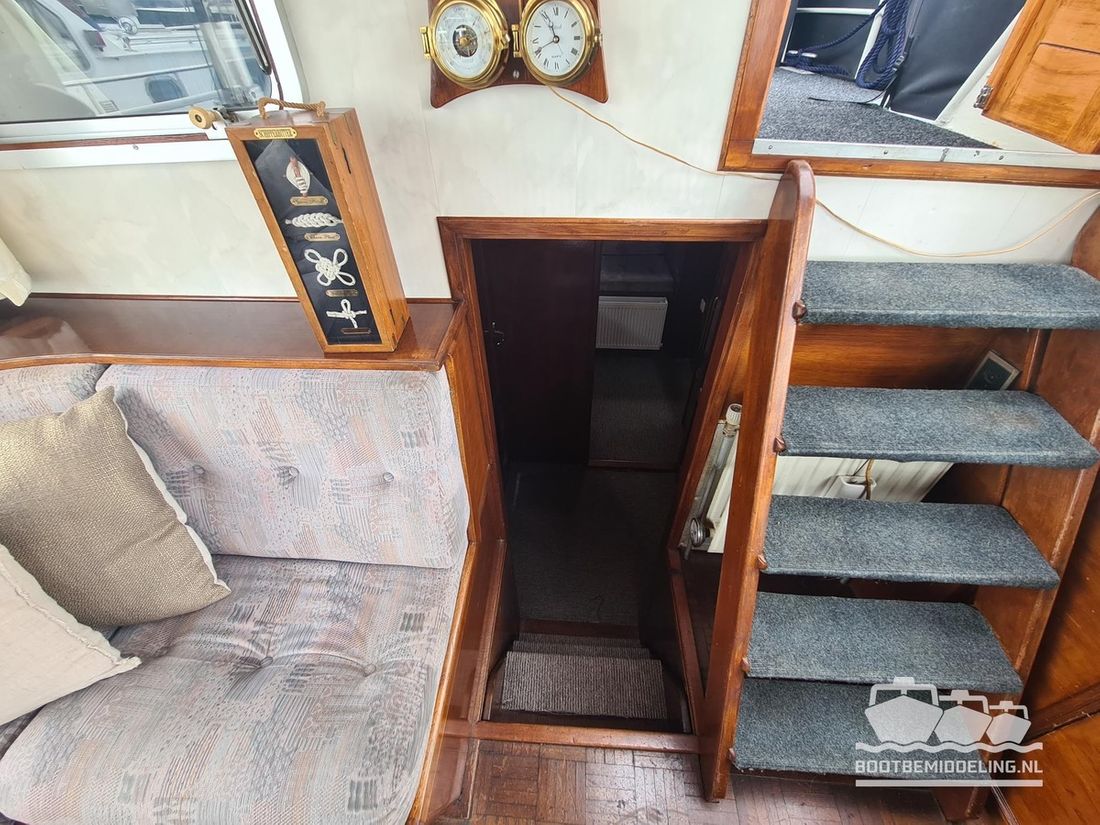 Deze door Holterman & De Vries gebouwde Blauwe Hand Kruiser ademt al direct bij het aan boord stappen degelijkheid uit. Het schip is uitzonderlijk robuust gebouwd en heeft een interieur dat boven menig leeftijdsgenoten uitsteekt. Tal van lades en kasten, ronde vormen en de juiste verhoudingen kenmerken de bouw door een uitstekende scheepswerf en dat is exact wat u aantreft in dit schip. Deze kenmerken vormen een goede basis voor een langdurig verblijf aan boord of permanente bewoning. De laatste jaren zijn veel vernieuwingen gedaan, zoals de installatie van een Kabola 400 HR combi, een 3500 kWh dak-airco en nieuwe matrassen. Daarnaast is ook de gas installatie verwijderd en vervangen door een 1 fase Siemens elektrische kookplaat. Een omvormer, een generator en een groot accupakket ontbreken uiteraard ook niet. Gelijktijdig met het vernieuwen van de antifouling + anodes, zijn ook de vetkoorden vernieuwd, zijn alle standpijpen vervangen door huiddoorvoeren met kogelkranen en tot slot zijn in de bilge voorin + achterin 2 hoogwateralarmen geïnstalleerd. In de geordende motorkamer vindt u twee goed onderhouden Ford Lehman motoren van 120 pk per stuk, voorzien van bun koeling. De uitlaten zijn vernieuwd en watergekoeld gemaakt. Dit schip is instap klaar en biedt u alle comfort tijdens lange reizen of bewoning.