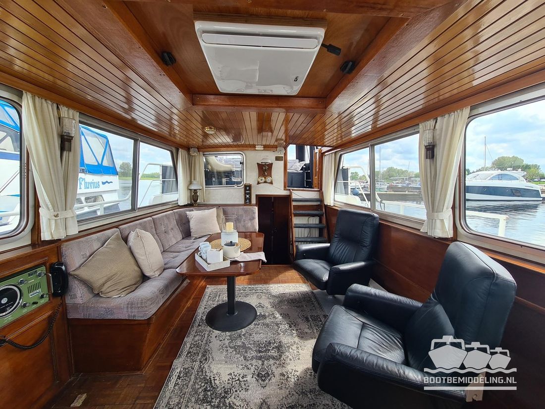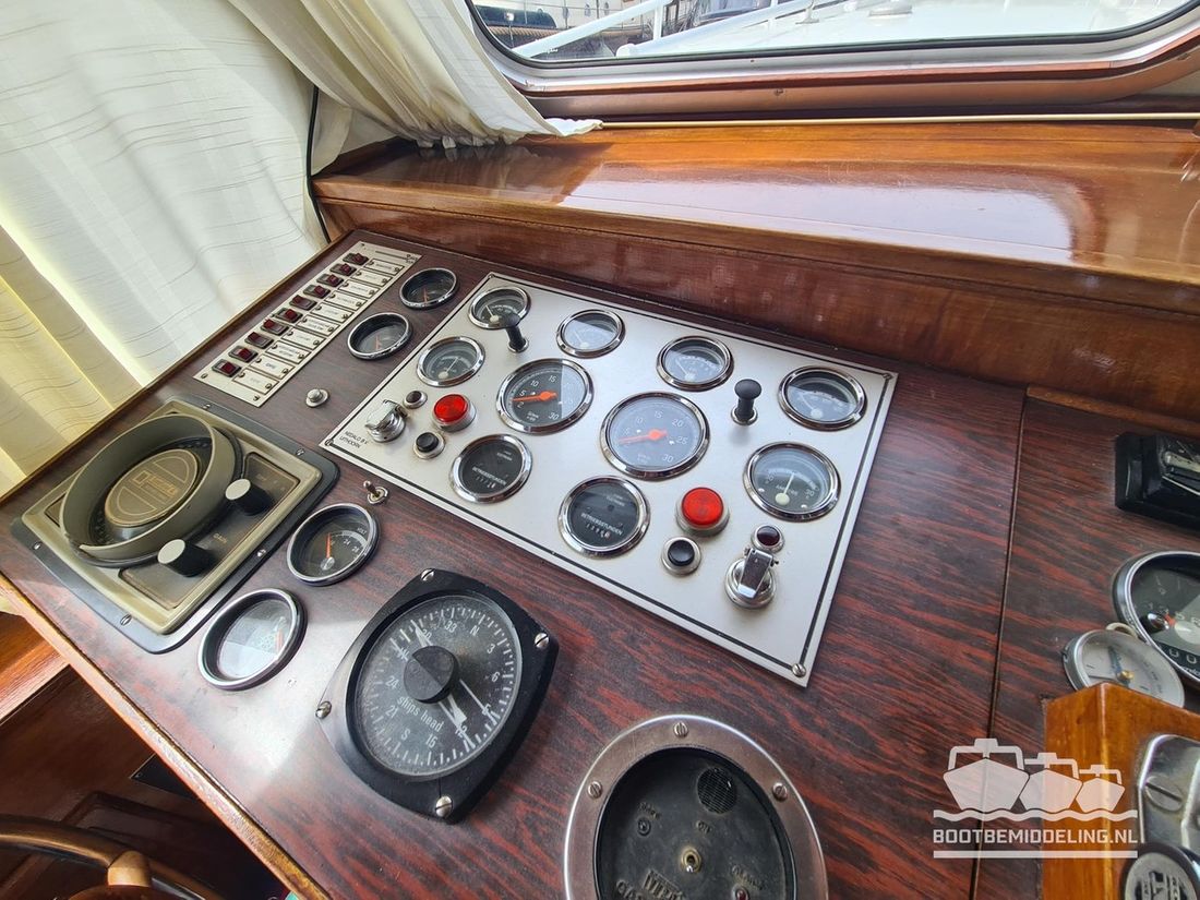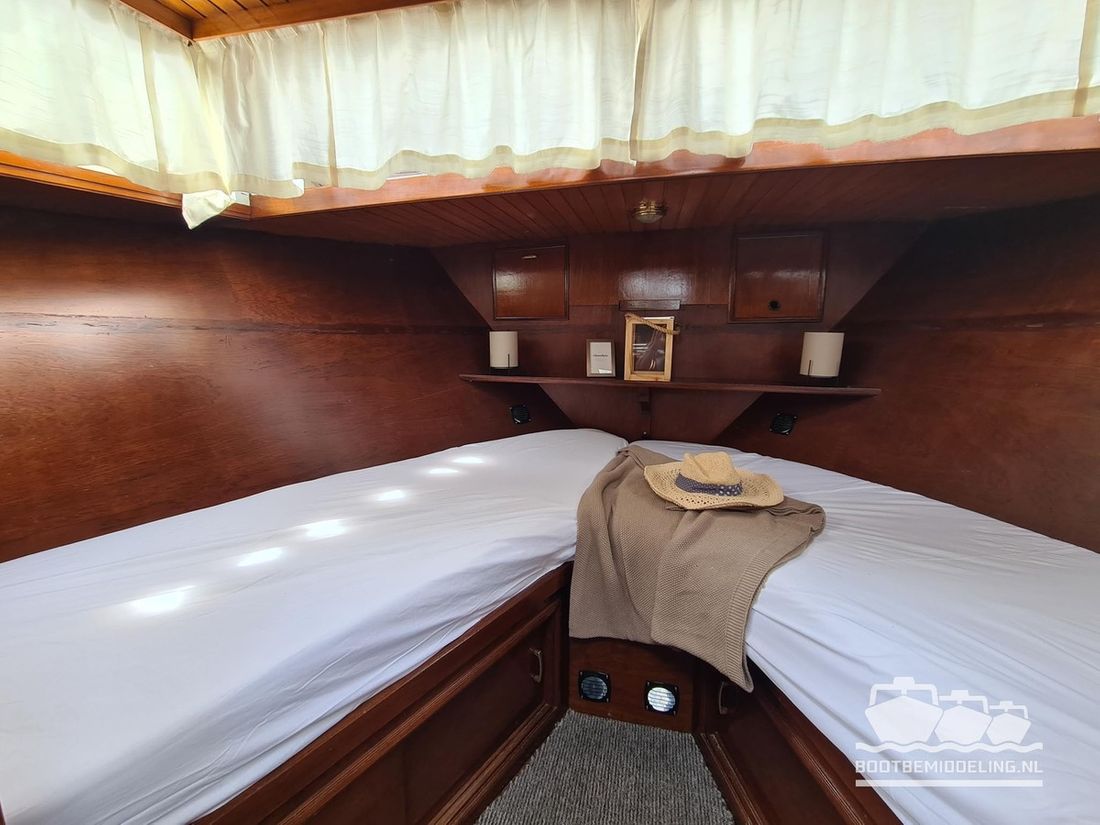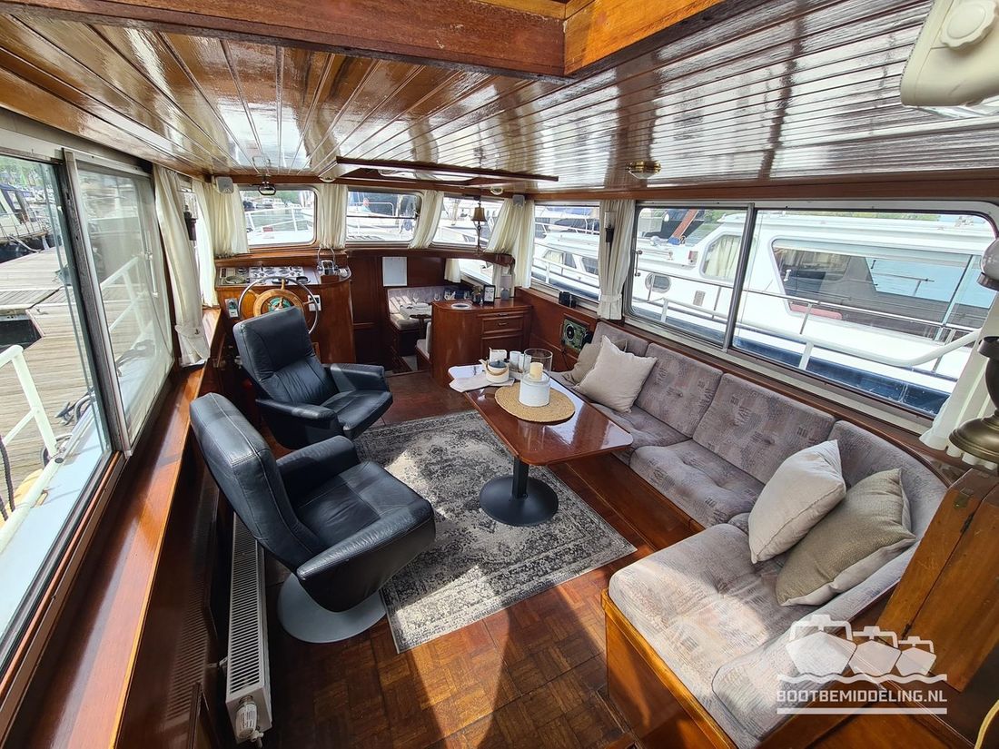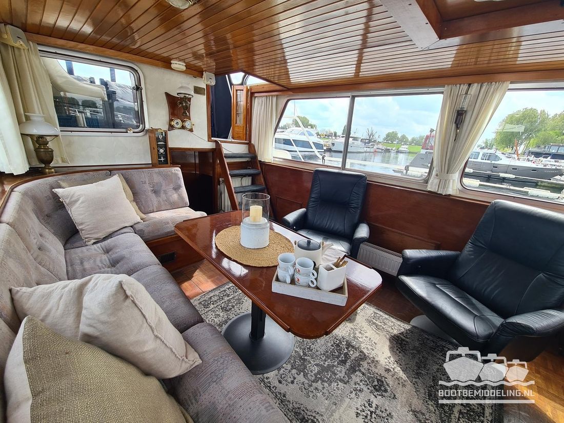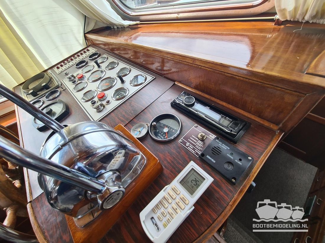 Deze door Holterman & De Vries gebouwde Blauwe Hand Kruiser ademt al direct bij het aan boord stappen degelijkheid uit. Het schip is uitzonderlijk robuust gebouwd en heeft een interieur dat boven menig leeftijdsgenoten uitsteekt. Tal van lades en kasten, ronde vormen en de juiste verhoudingen kenmerken de bouw door een uitstekende scheepswerf en dat is exact wat u aantreft in dit schip. Deze kenmerken vormen een goede basis voor een langdurig verblijf aan boord of permanente bewoning. De laatste jaren zijn veel vernieuwingen gedaan, zoals de installatie van een Kabola 400 HR combi, een 3500 kWh dak-airco en nieuwe matrassen. Daarnaast is ook de gas installatie verwijderd en vervangen door een 1 fase Siemens elektrische kookplaat. Een omvormer, een generator en een groot accupakket ontbreken uiteraard ook niet. Gelijktijdig met het vernieuwen van de antifouling + anodes, zijn ook de vetkoorden vernieuwd, zijn alle standpijpen vervangen door huiddoorvoeren met kogelkranen en tot slot zijn in de bilge voorin + achterin 2 hoogwateralarmen geïnstalleerd. In de geordende motorkamer vindt u twee goed onderhouden Ford Lehman motoren van 120 pk per stuk, voorzien van bun koeling. De uitlaten zijn vernieuwd en watergekoeld gemaakt. Dit schip is instap klaar en biedt u alle comfort tijdens lange reizen of bewoning.