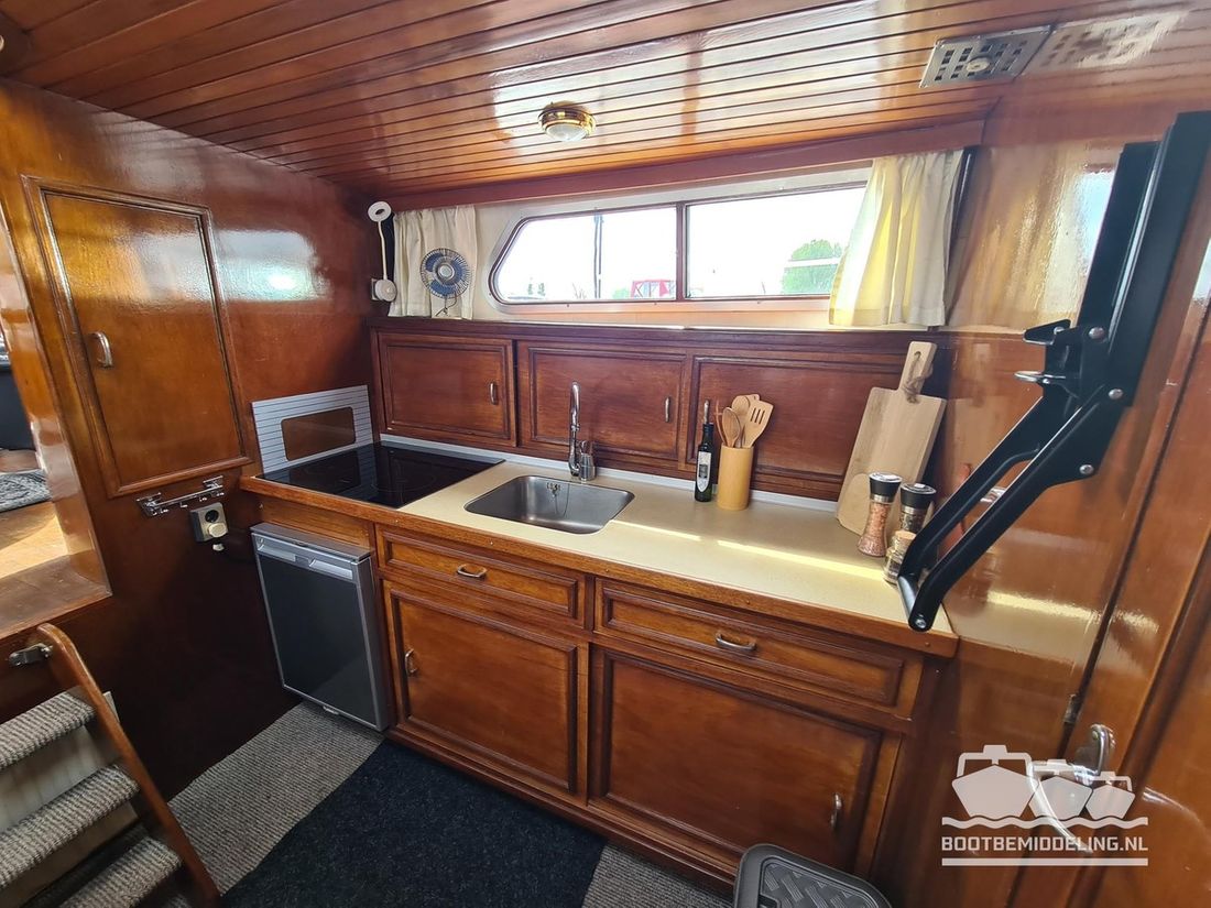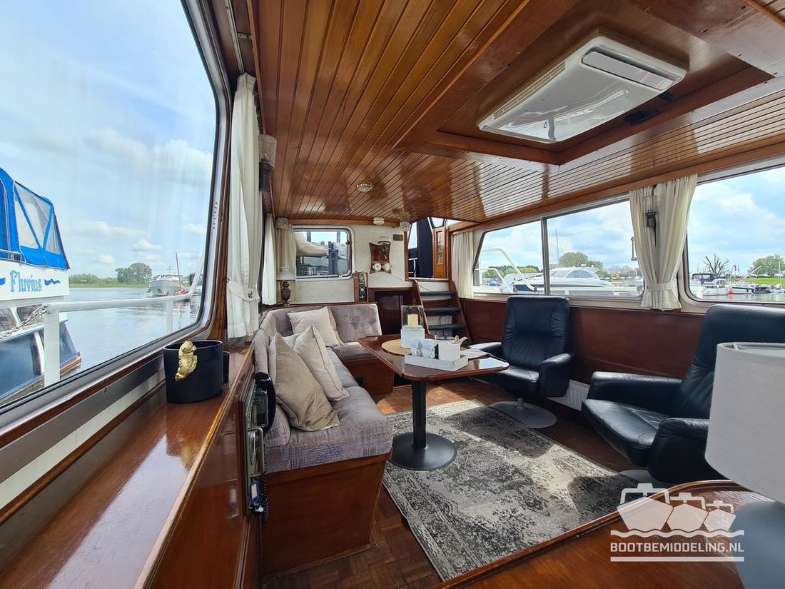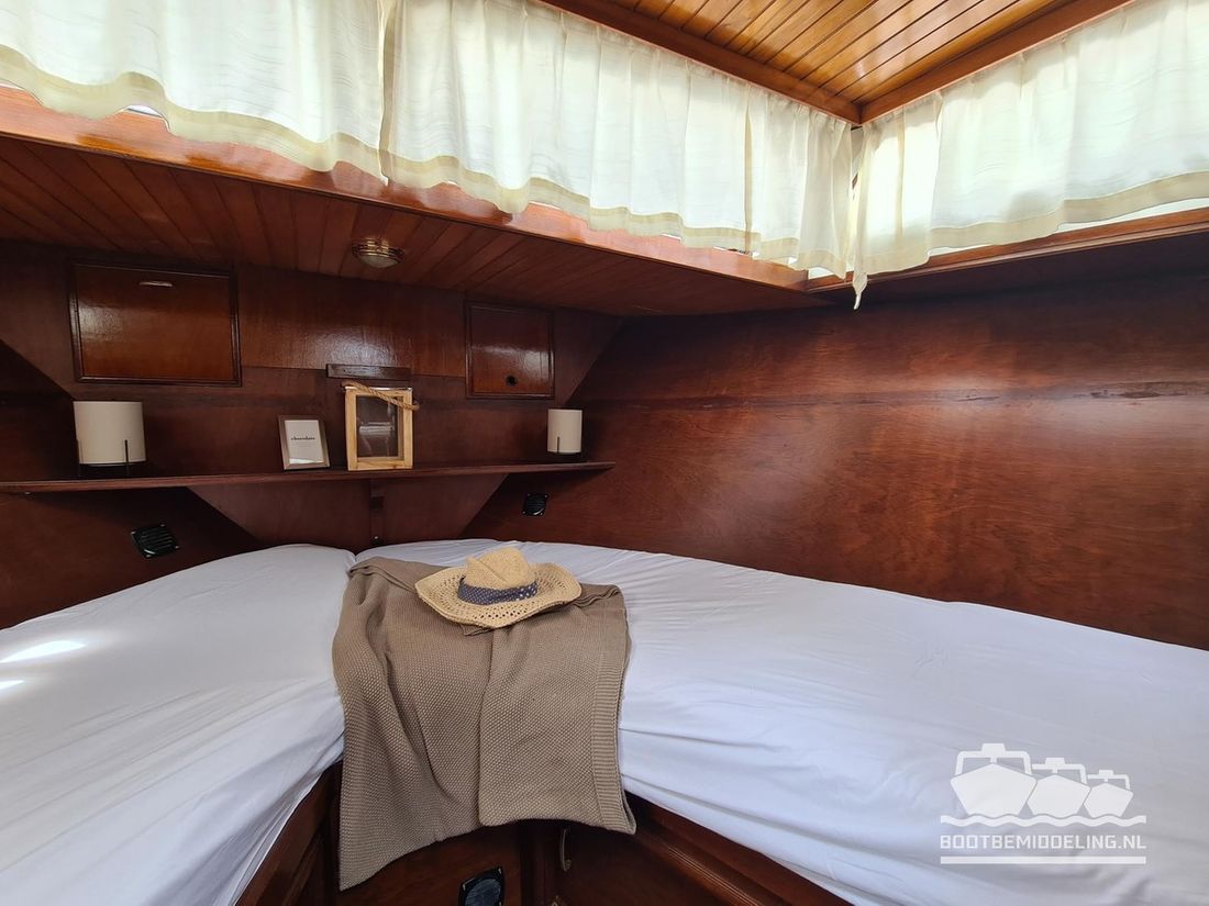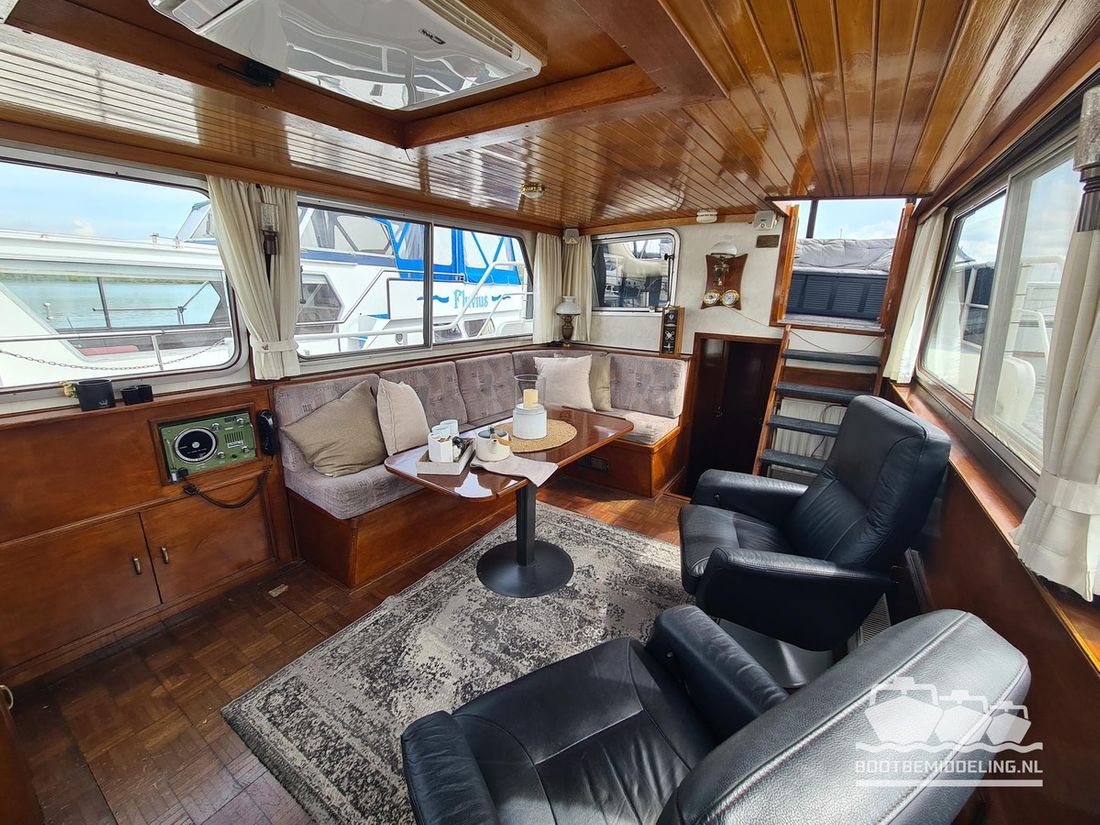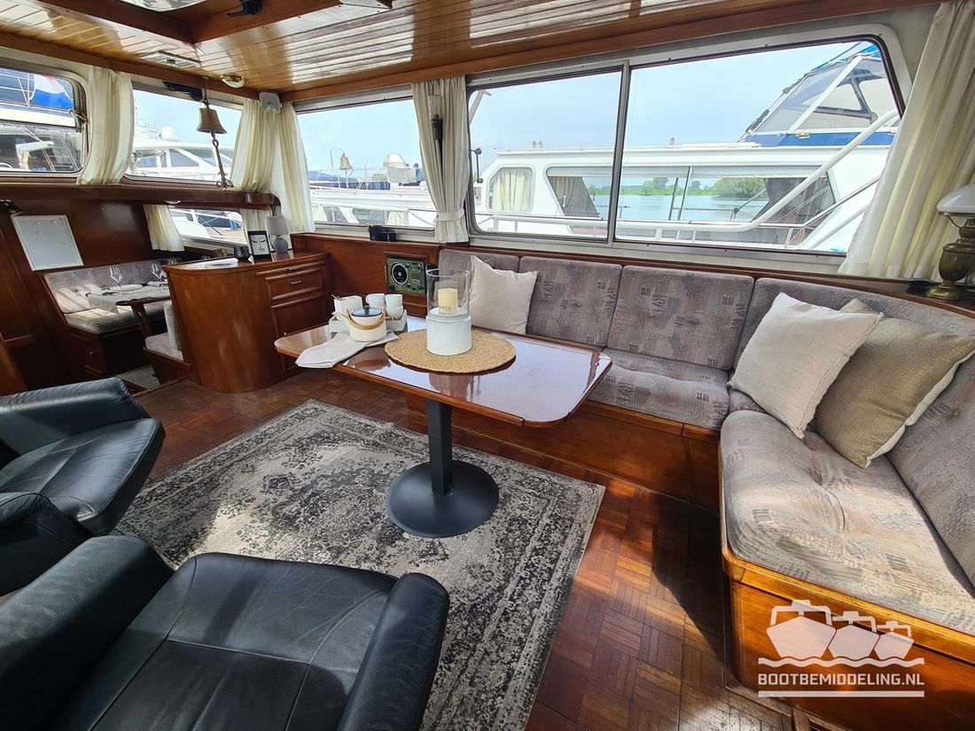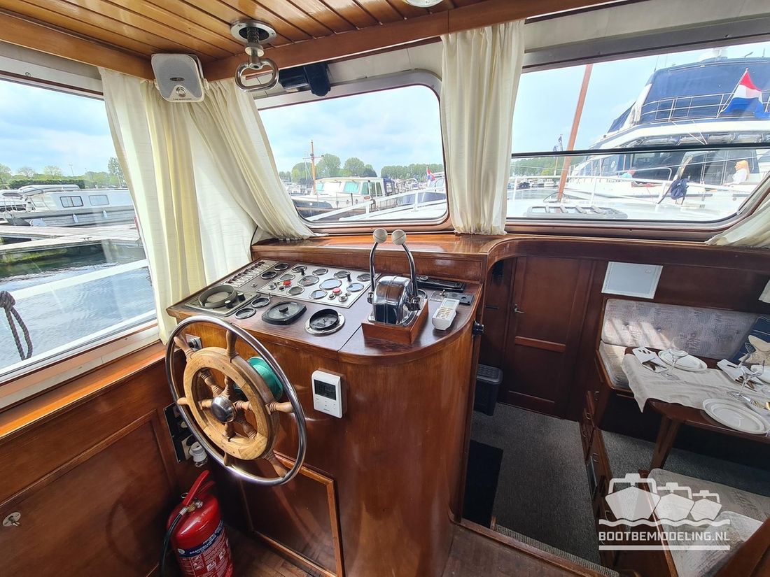 Deze door Holterman & De Vries gebouwde Blauwe Hand Kruiser ademt al direct bij het aan boord stappen degelijkheid uit. Het schip is uitzonderlijk robuust gebouwd en heeft een interieur dat boven menig leeftijdsgenoten uitsteekt. Tal van lades en kasten, ronde vormen en de juiste verhoudingen kenmerken de bouw door een uitstekende scheepswerf en dat is exact wat u aantreft in dit schip. Deze kenmerken vormen een goede basis voor een langdurig verblijf aan boord of permanente bewoning. De laatste jaren zijn veel vernieuwingen gedaan, zoals de installatie van een Kabola 400 HR combi, een 3500 kWh dak-airco en nieuwe matrassen. Daarnaast is ook de gas installatie verwijderd en vervangen door een 1 fase Siemens elektrische kookplaat. Een omvormer, een generator en een groot accupakket ontbreken uiteraard ook niet. Gelijktijdig met het vernieuwen van de antifouling + anodes, zijn ook de vetkoorden vernieuwd, zijn alle standpijpen vervangen door huiddoorvoeren met kogelkranen en tot slot zijn in de bilge voorin + achterin 2 hoogwateralarmen geïnstalleerd. In de geordende motorkamer vindt u twee goed onderhouden Ford Lehman motoren van 120 pk per stuk, voorzien van bun koeling. De uitlaten zijn vernieuwd en watergekoeld gemaakt. Dit schip is instap klaar en biedt u alle comfort tijdens lange reizen of bewoning.