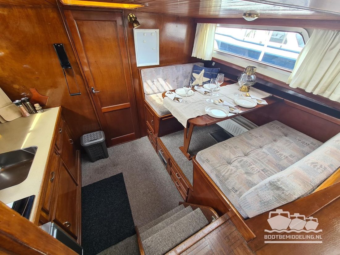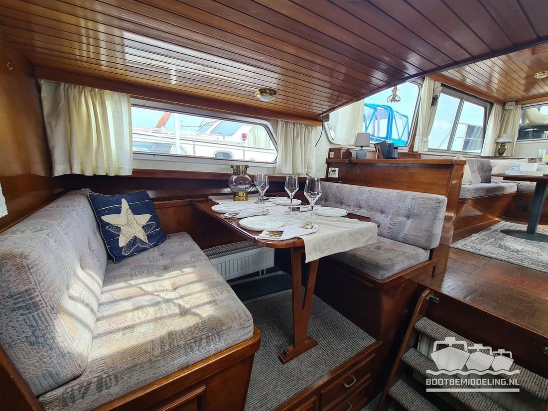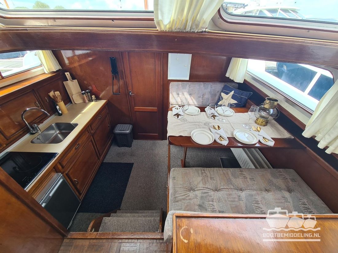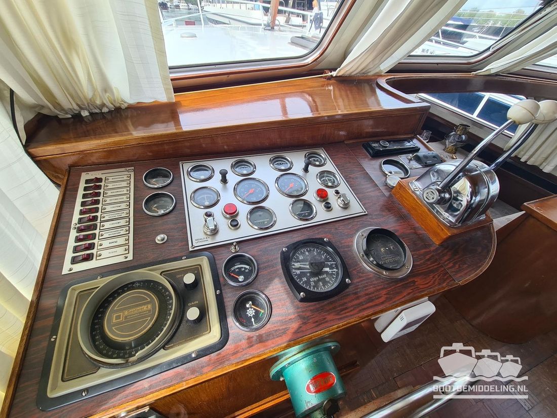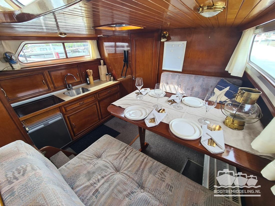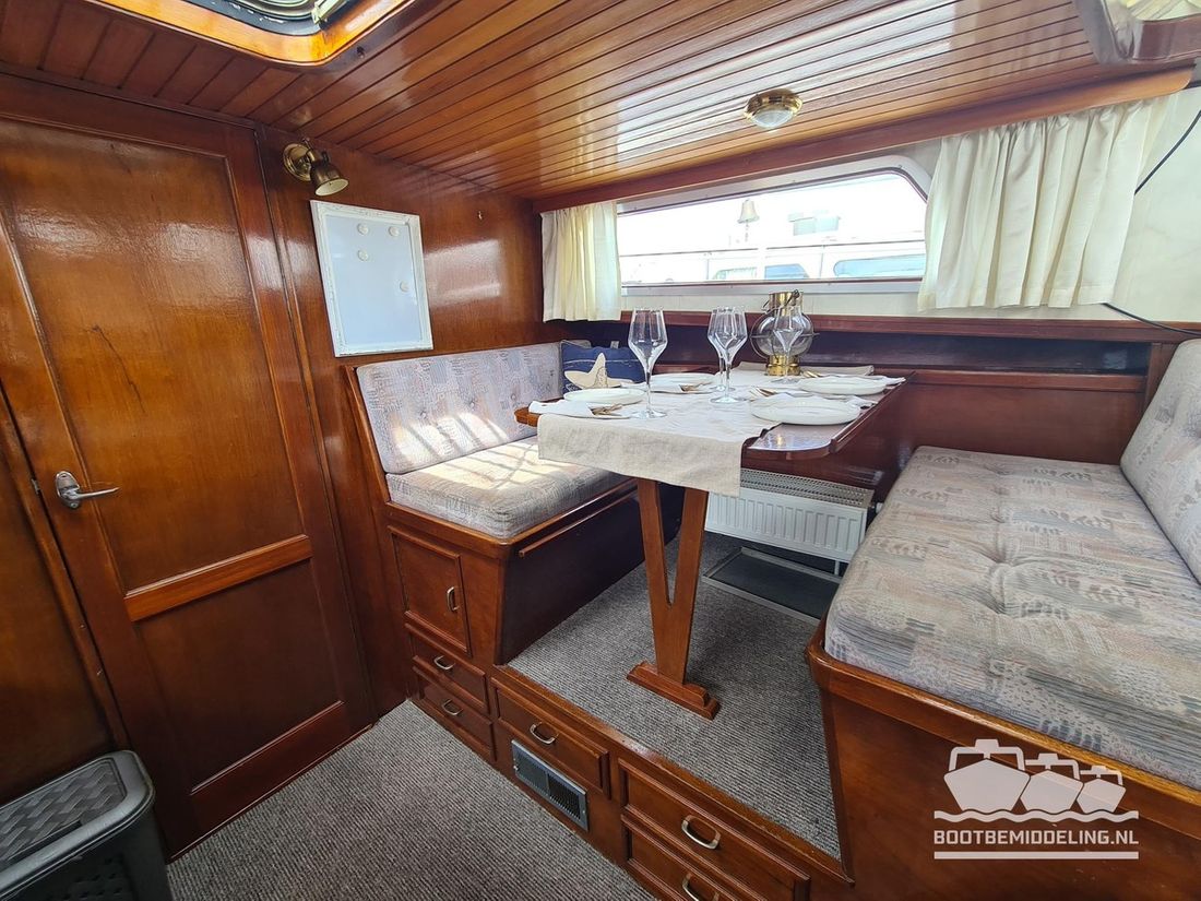 Deze door Holterman & De Vries gebouwde Blauwe Hand Kruiser ademt al direct bij het aan boord stappen degelijkheid uit. Het schip is uitzonderlijk robuust gebouwd en heeft een interieur dat boven menig leeftijdsgenoten uitsteekt. Tal van lades en kasten, ronde vormen en de juiste verhoudingen kenmerken de bouw door een uitstekende scheepswerf en dat is exact wat u aantreft in dit schip. Deze kenmerken vormen een goede basis voor een langdurig verblijf aan boord of permanente bewoning. De laatste jaren zijn veel vernieuwingen gedaan, zoals de installatie van een Kabola 400 HR combi, een 3500 kWh dak-airco en nieuwe matrassen. Daarnaast is ook de gas installatie verwijderd en vervangen door een 1 fase Siemens elektrische kookplaat. Een omvormer, een generator en een groot accupakket ontbreken uiteraard ook niet. Gelijktijdig met het vernieuwen van de antifouling + anodes, zijn ook de vetkoorden vernieuwd, zijn alle standpijpen vervangen door huiddoorvoeren met kogelkranen en tot slot zijn in de bilge voorin + achterin 2 hoogwateralarmen geïnstalleerd. In de geordende motorkamer vindt u twee goed onderhouden Ford Lehman motoren van 120 pk per stuk, voorzien van bun koeling. De uitlaten zijn vernieuwd en watergekoeld gemaakt. Dit schip is instap klaar en biedt u alle comfort tijdens lange reizen of bewoning.
