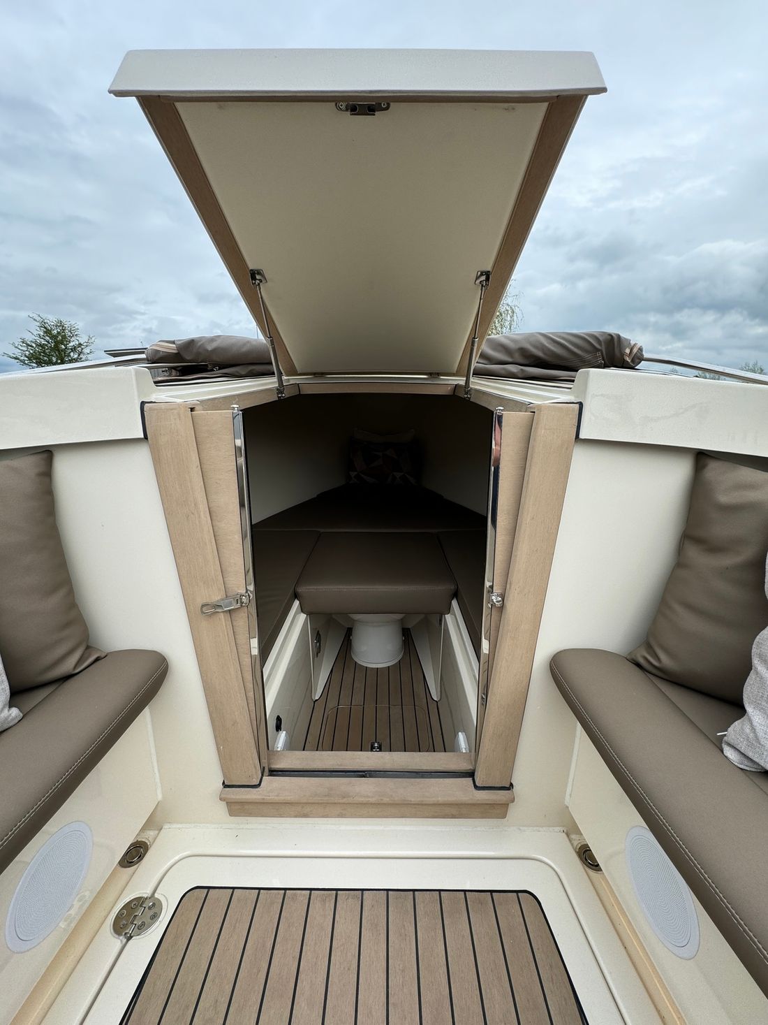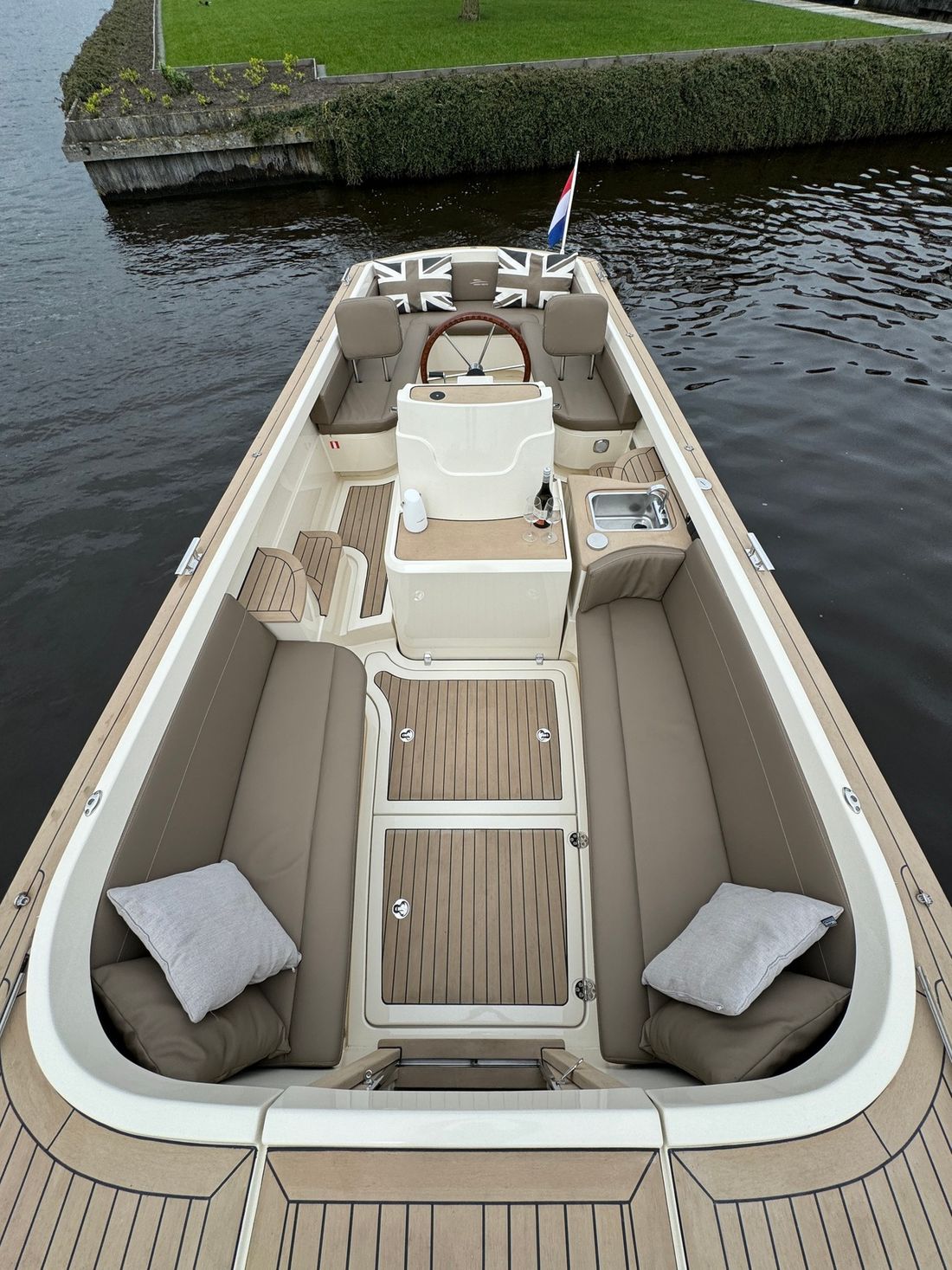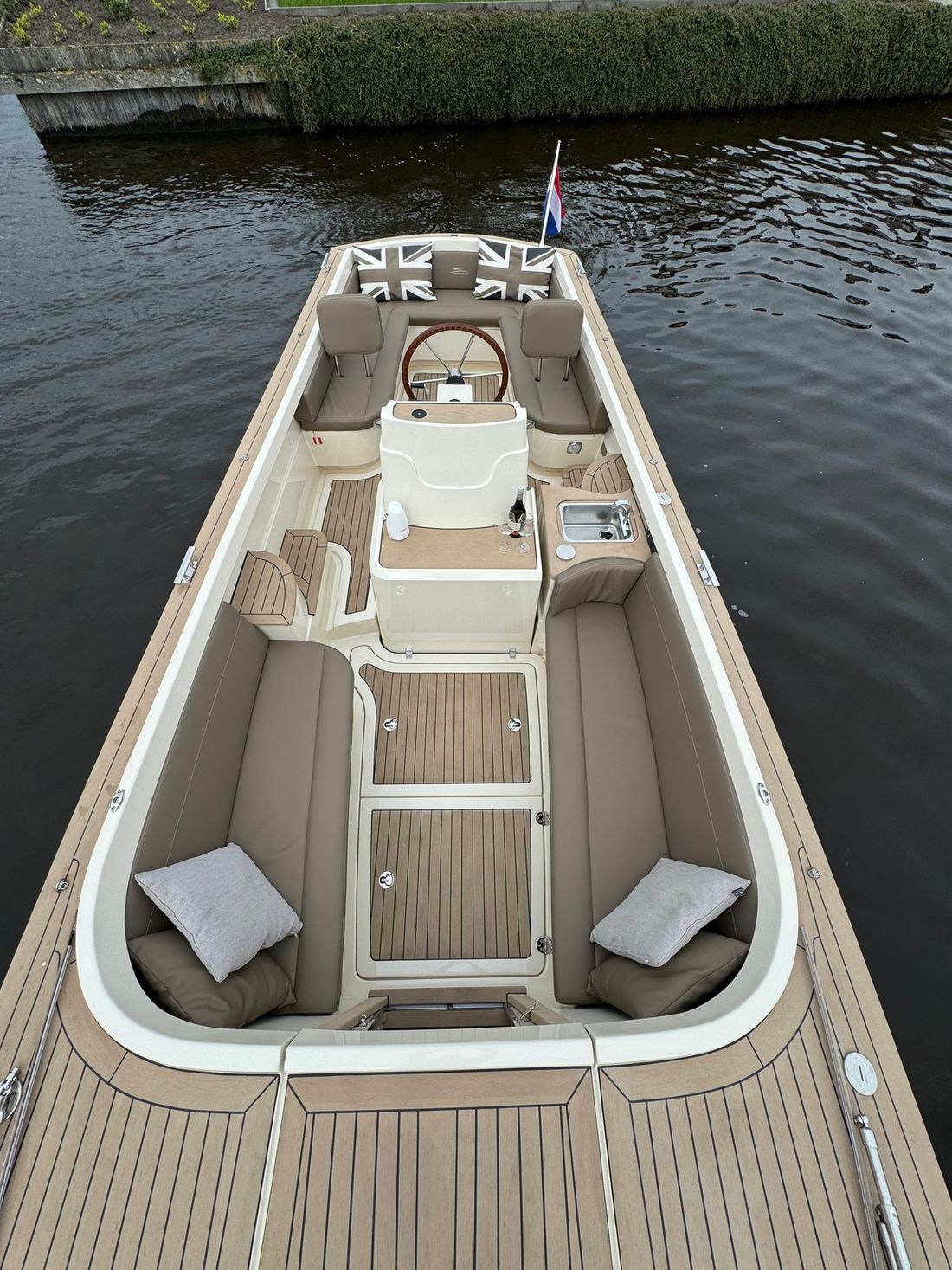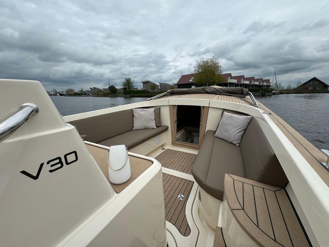 Met de slimme indeling bestaande uit twee verschillende rondzitten biedt deze tender plaats aan 8 personen. Voorin bevindt zich een kajuit met een royaal bed evenals een elektrisch toilet. Verder is de boot uitgerust met een spoelbak met warm en koud water, elektrische koellade, kaartplotter, Fusion geluidsinstallatie, proportionele boegschroef, kuiptent, omvormer etc.