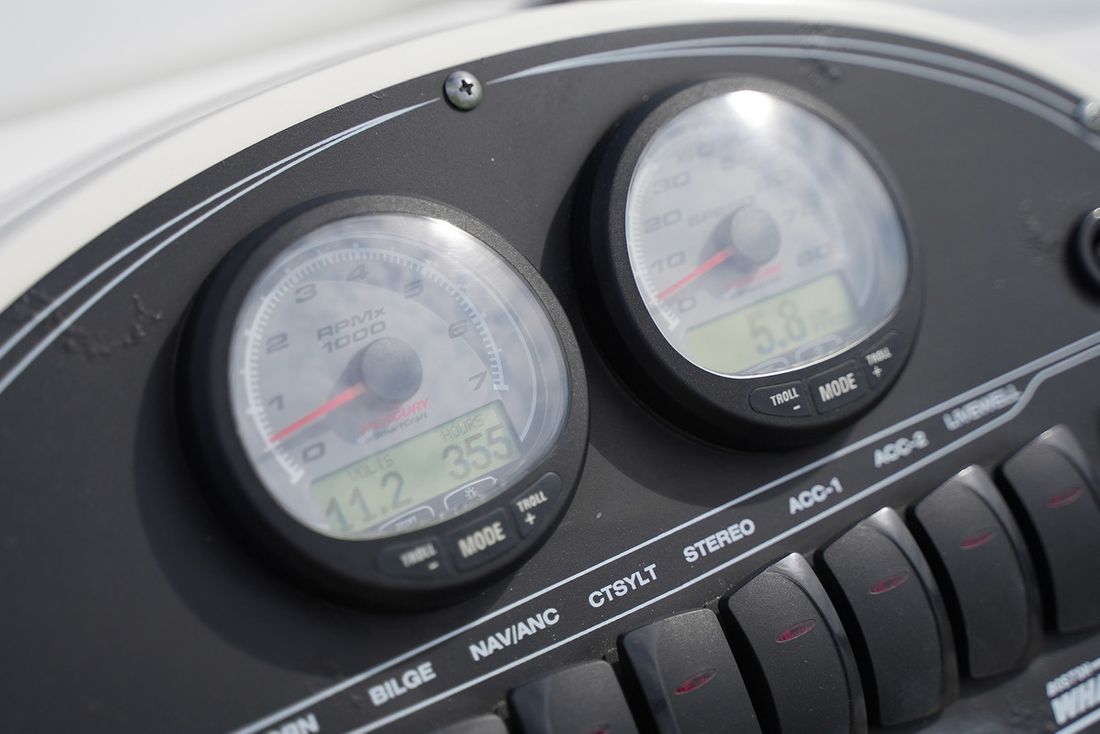 Motorisatie Aantal identieke motoren 1 Start type elektrisch Hoofdmotor Type buitenboord Merk Mercury Model Optimax Bouwjaar 2004 Aantal cilinders 6 Vermogen 150 pk Brandstof benzine Tank Brandstoftank aantal Totale inhoud brandstoftank(s) 227 liter Materiaal brandstoftank Polyethyleen Meetinstrumenten motor Brandstoftankmeter Merk brandstoftankmeter SmartCraft instrumenten Toerenteller Merk toerenteller SmartCraft instrumenten Oliedrukmeter Merk oliedrukmeter SmartCraft instrumenten Temperatuurmeter Merk temperatuurmeter SmartCraft instrumenten Elektriciteit Accu Aantal 1 Dynamo 12V -