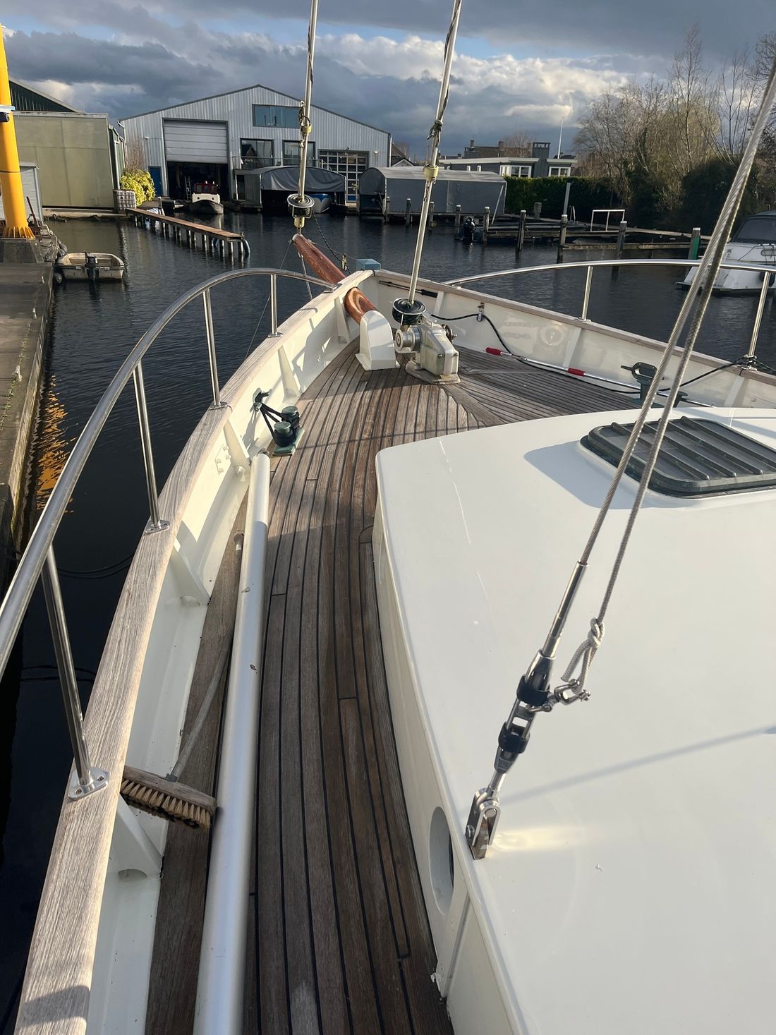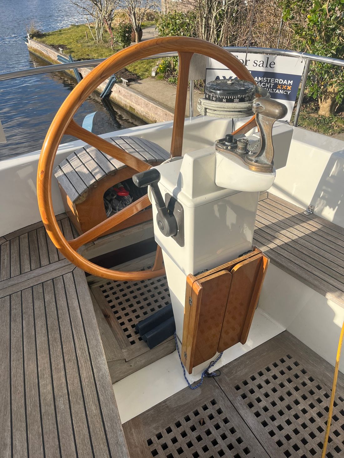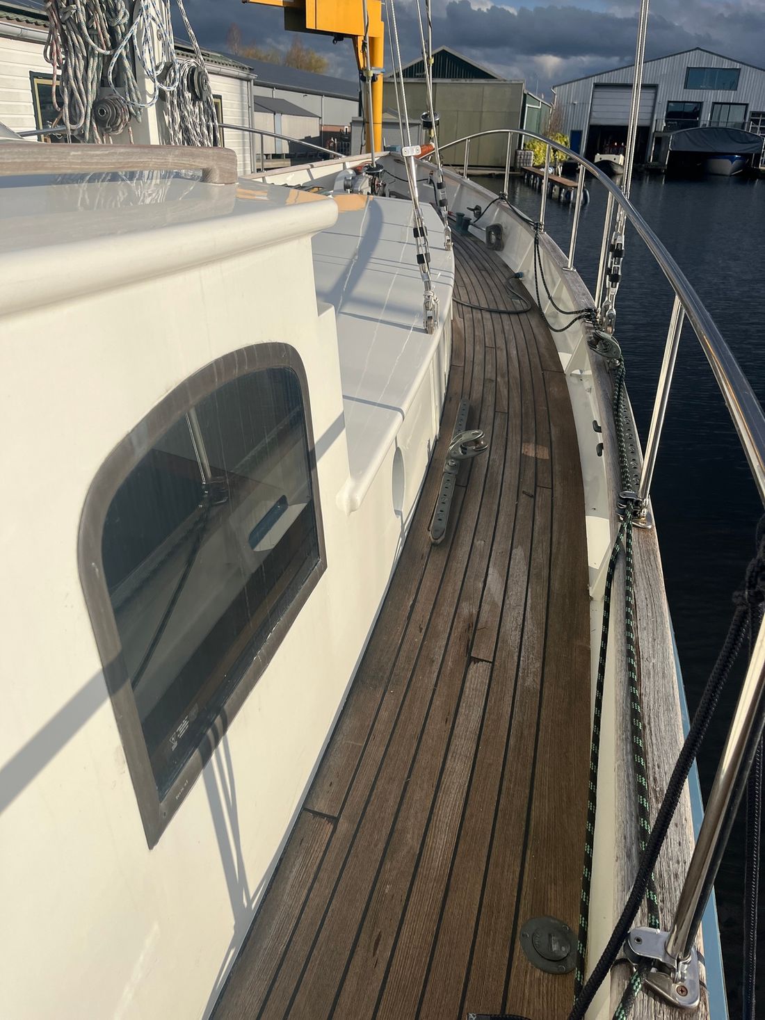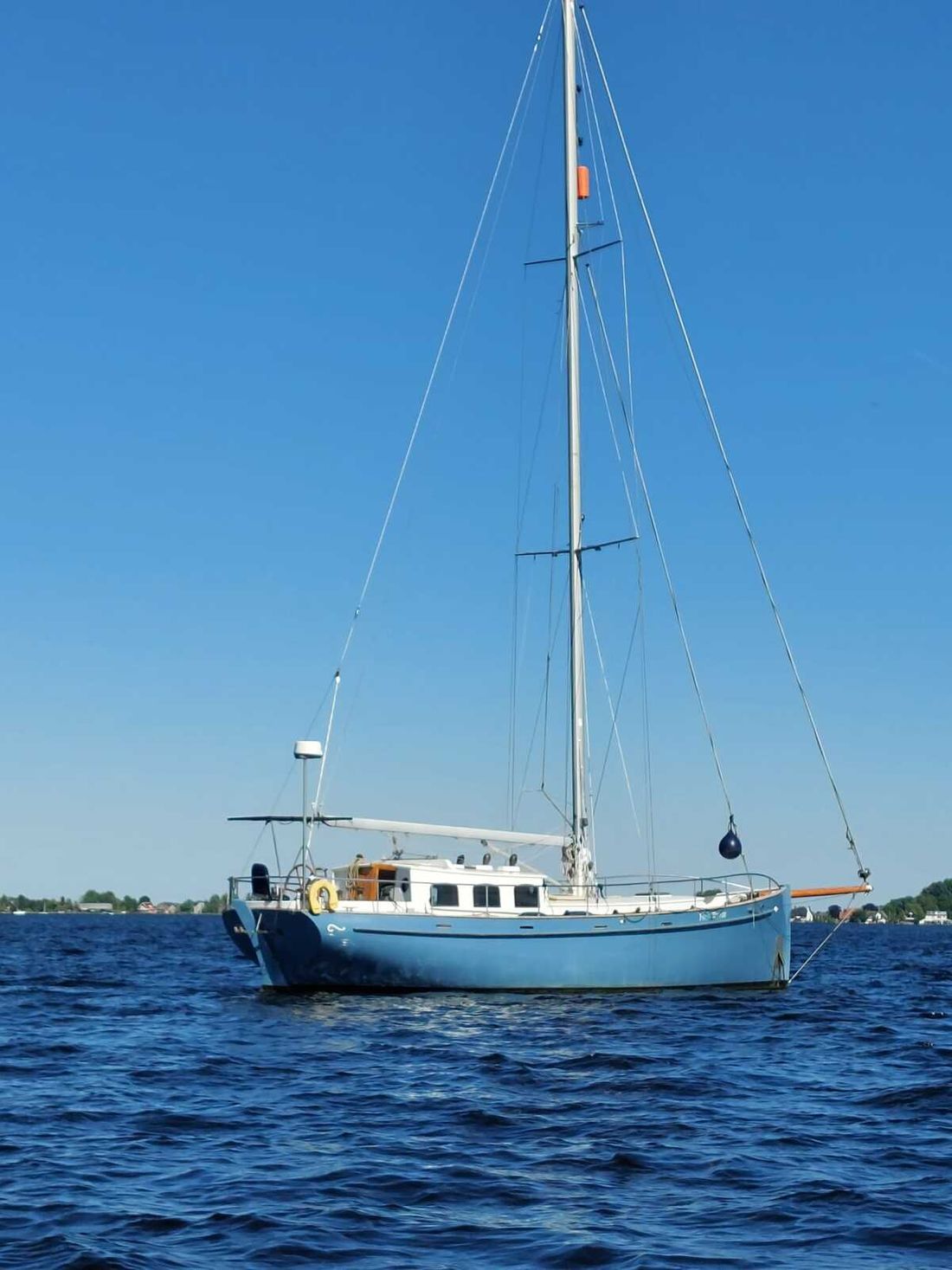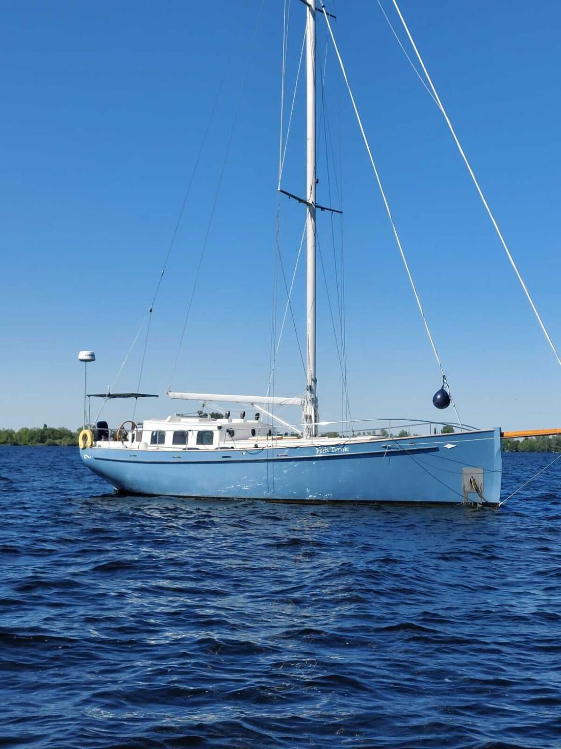 Nieuw geleverd Ontwerper Olivier Vermeer Werf P. Klink jachtbouw Romp, dek en opbouw Rompvorm rondspant Rompkleur blauw Dek en opbouw kleur wit Dek en opbouw materiaal woodcore epoxy Opmerkingen Dek en opbouw materiaal Mahonie Kuip achterkuip Ramen Messing raamlijsten Afmetingen en gewichten Diepgang maximaal 275 cm Lengte waterlijn 1177 cm Waterverplaatsing 19 ton Besturing en driftbeperking Besturing stuurwiel Plek besturing buiten Roer enkel Kiel/zwaard Keel + centreboard Bediening variabele driftbeperking hydraulisch -