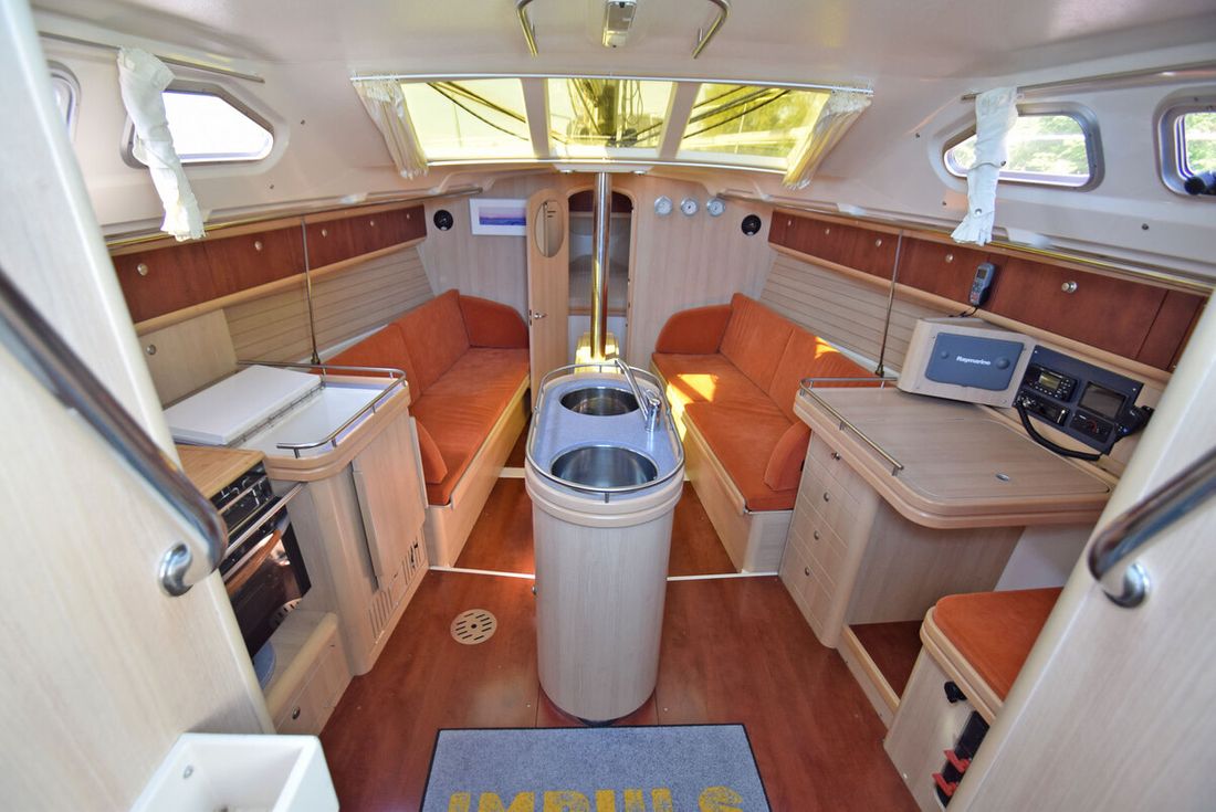 Naam schip Impuls, merk en type schip Etap 37s, lengte 11.20 m, breedte 3.85 m, diepgang 1.35 m, bouwjaar 2005, bouwnummer BE-ETP37067I506, bouwer Etap Yachting, ontwerper Mortain & Movrikios, rondspant, tandemkiel, polyester, anlislip dek opnieuw geschilderd, waterverplaatsing 6.550 kg, ballast 2.200 kg, stuurwiel besturing, anker met 50 meter ketting, ankerlier elektrisch, geïntegreerd zwemplateau, RVS zwemtrap, perspex ramen, binnenbetimmering imbuya (licht hout), 6 slaapplaatsen, 2 hutten, stahoogte salon 1.98 m, bedlengte voor 1.95 m, bedlengte langsbanken 1.92 m, bedlengte achter 1.96 m.